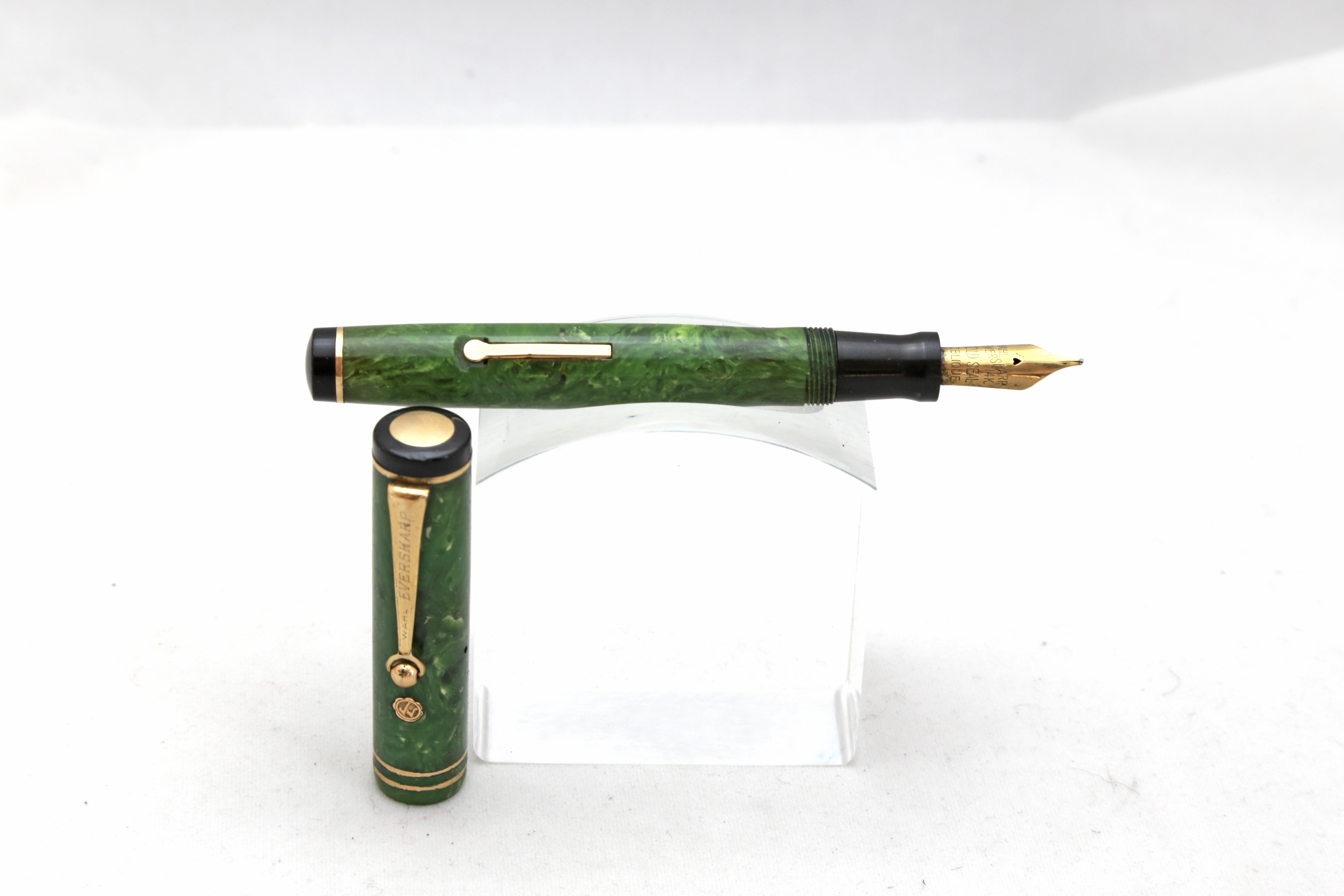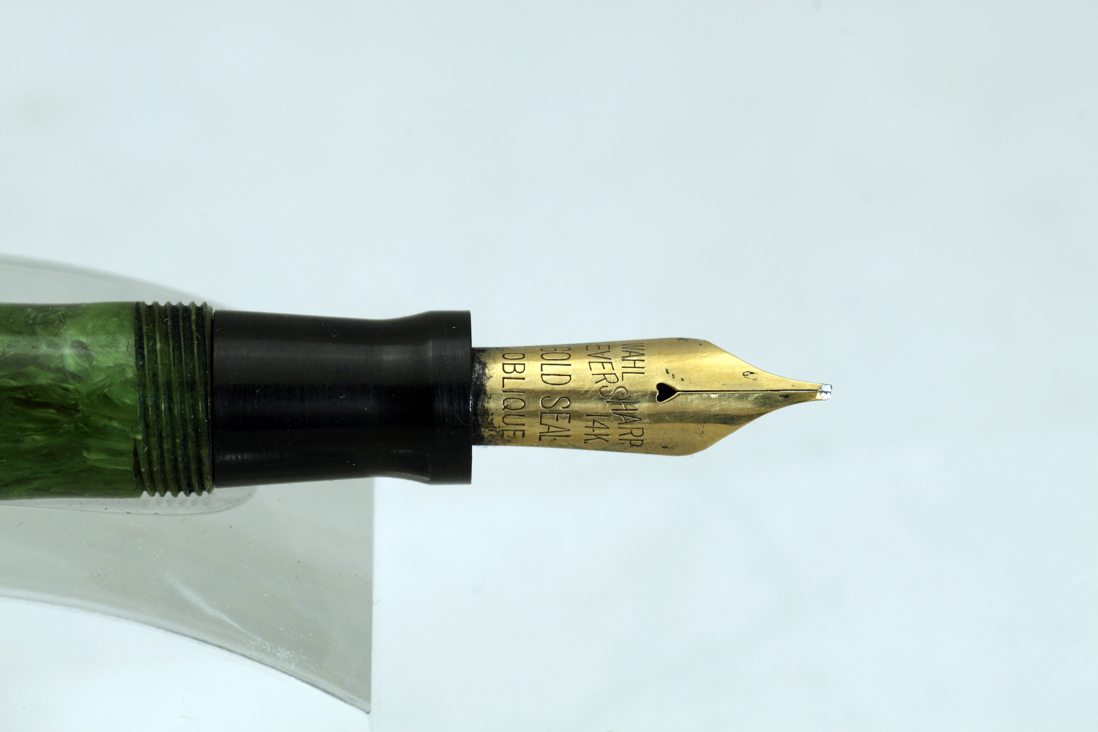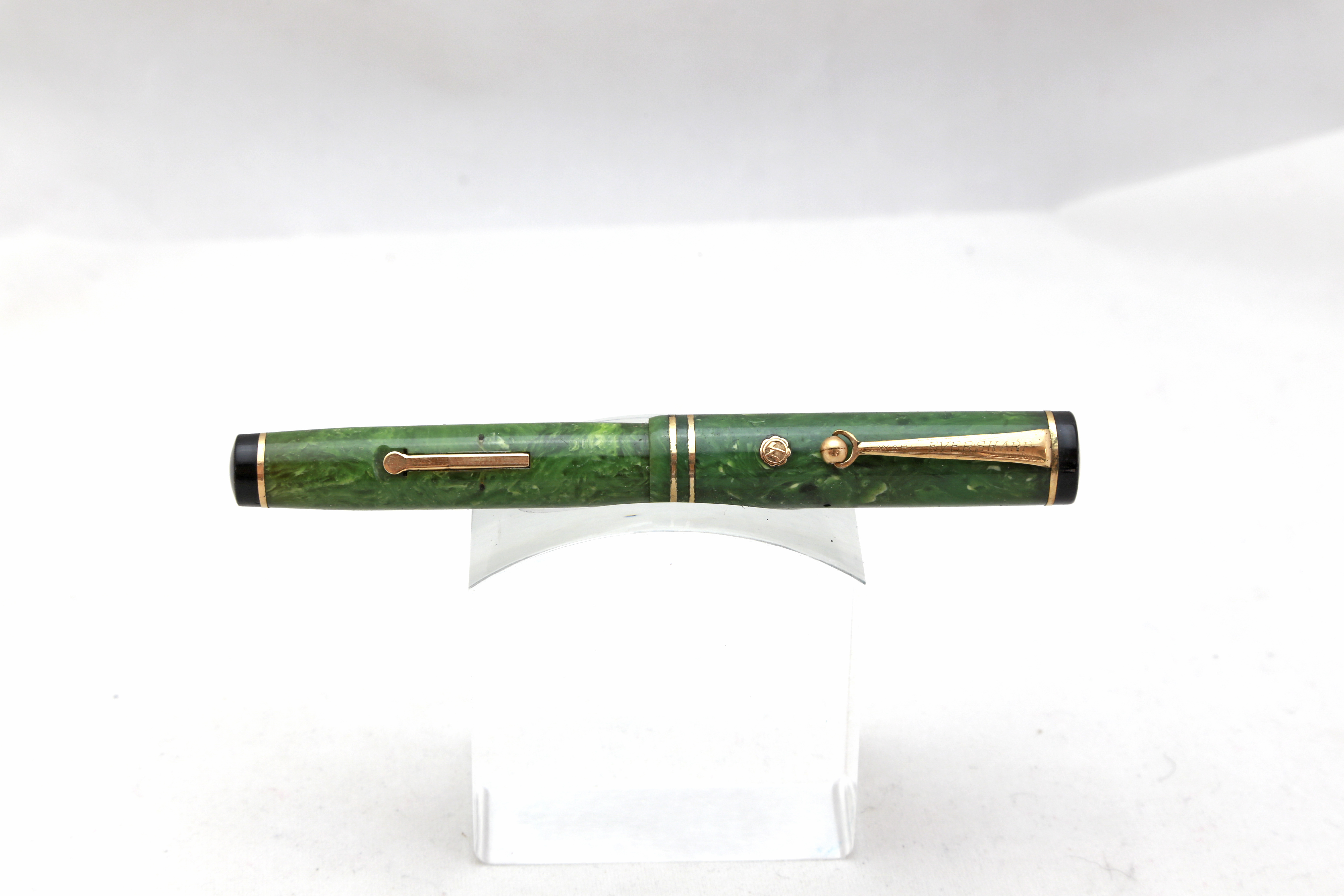 Modello gold seal soldier pen in celluloide green jade, pennino obliquo, caricamento a levetta, produzione 1930