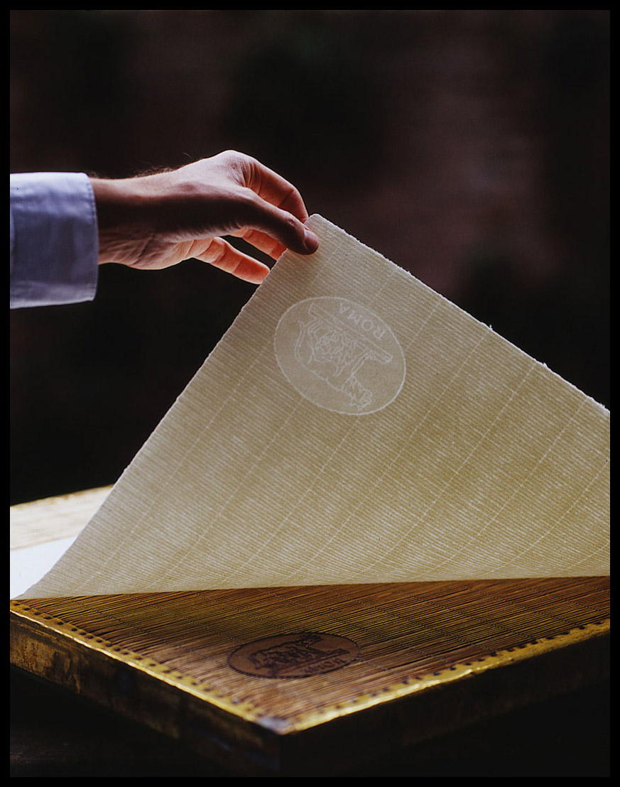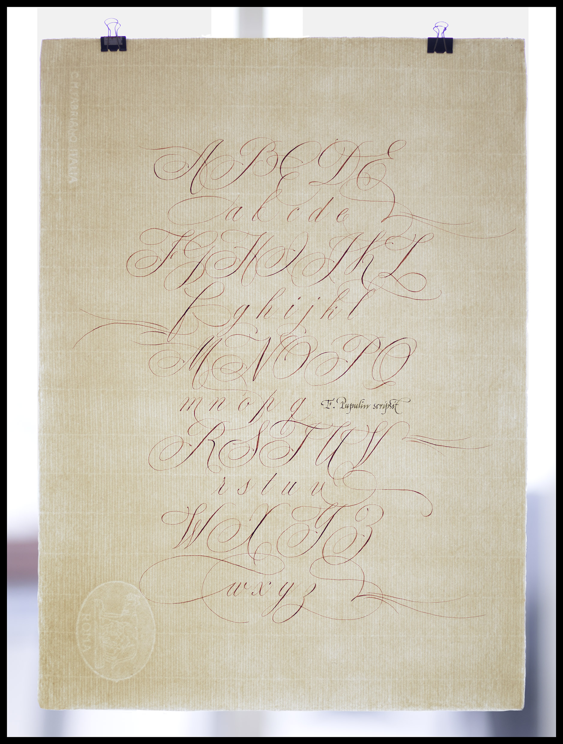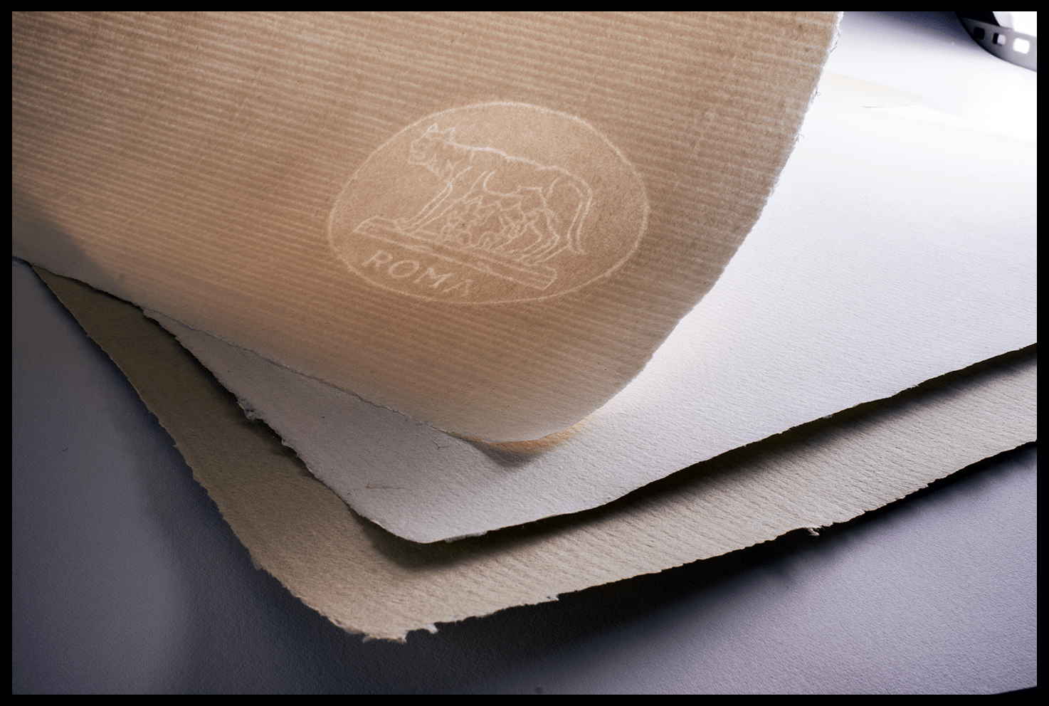 Continuo con i “non so”. No so se la Roma vada bene per la calligrafia. Al tatto, la vergatura é piuttosto ruvida, e osservandola in luce radente colpisce (a parte la sua bellezza) che il rilievo della filigrana é davvero evidente. Provare non posso, perché la mia intenzione sarebbe incorniciare l’operetta - se uscisse decente - tra due vetri, cosi che non posso “pasticciare” il retro del foglio con qualche scarabocchio. Dovrò provare, al momento buono, a scrivere l’alfabeto, sperando in bene. Però ho visto che la Roma la vende anche un negozio specializzato in calligrafia, il che fa ben sperare. Mi consolo comunque pensando che non morirò per 13 Euro, se non dovesse funzionare.