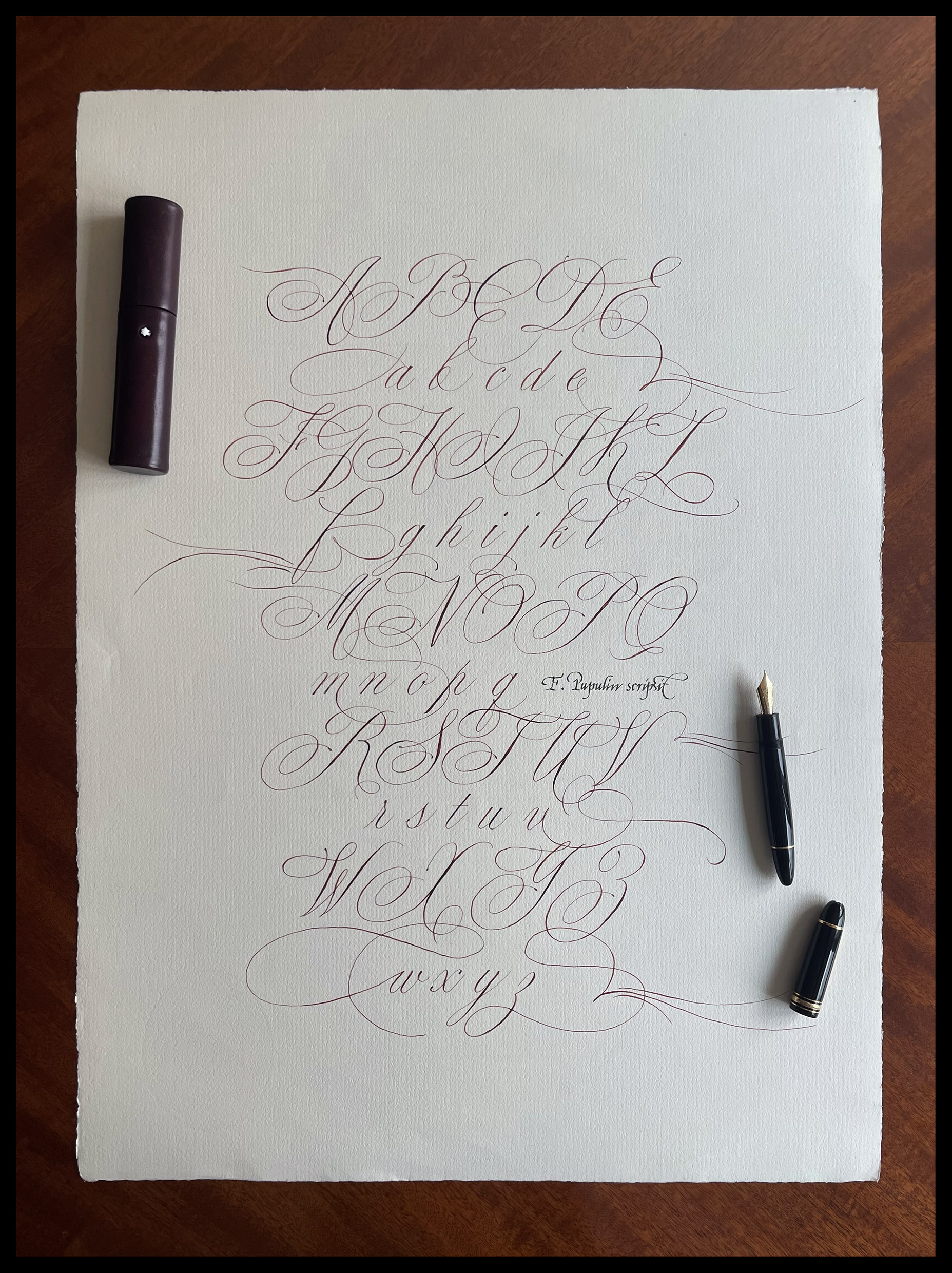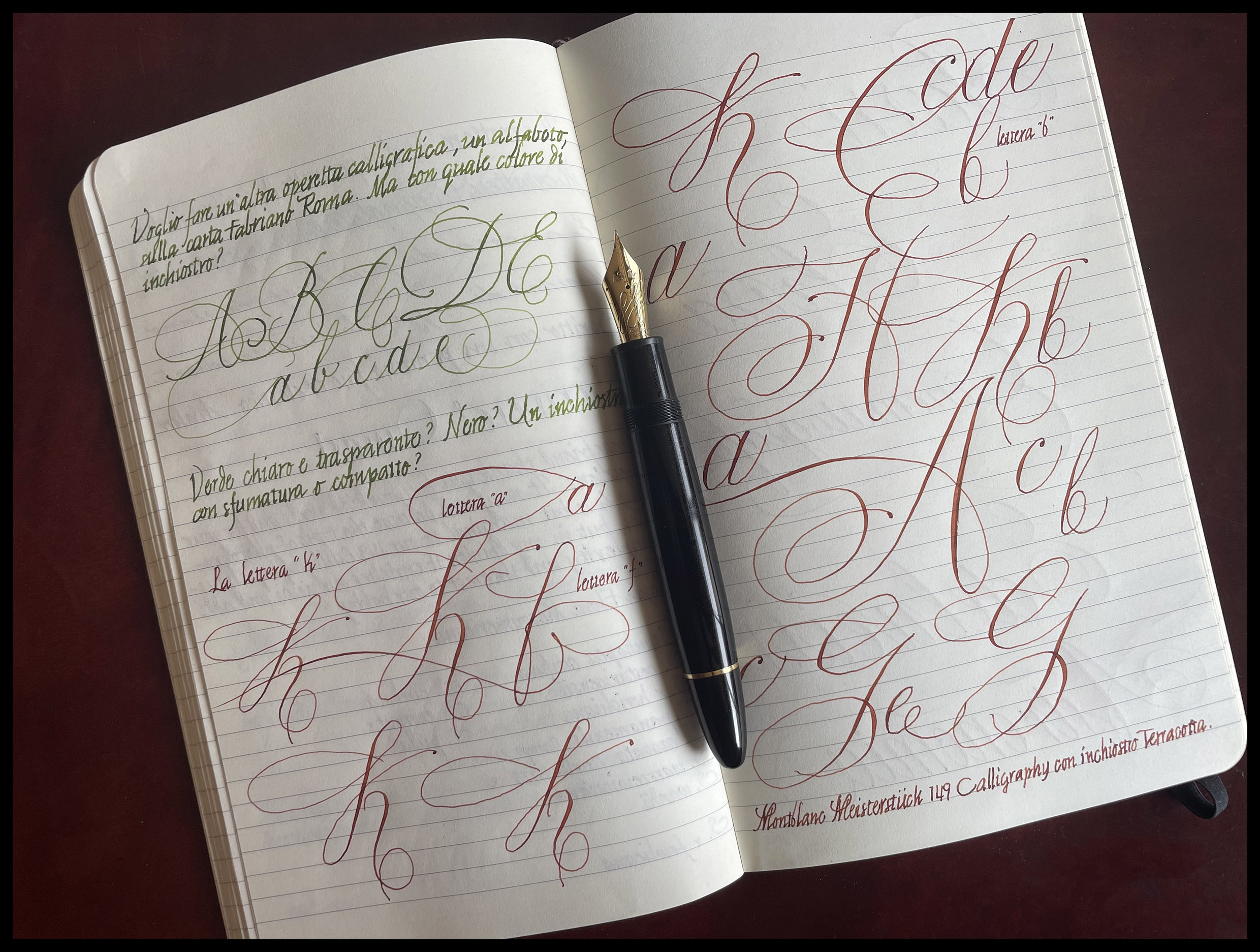 Ne comprai due fogli, uno Michelangelo e uno Raffaello, vari anni fa, e da allora hanno atteso in una cartella che mi decidessi a farne qualcosa. Qualche giorno fa ho deciso: userò la Michelangelo (più chiara) per vergare un alfabeto in stile Copperplate con la mia fedele 149 Calligraphy, una vera operetta, magari da incorniciare e da appendere al muro.