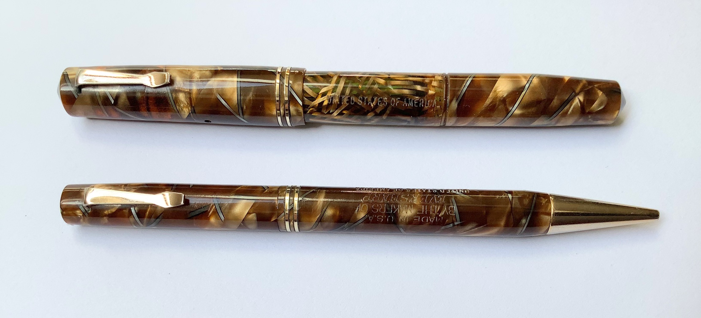 Questo è il set penna e matita nella livrea in celluloide venata Topaz Pearl , a richiamare le tonalità della splendida pietra topazio imperiale , e si distingue per la poco comune doppia veretta fine (di norma la penna ha una sola vera più alta ed ancora meno comune con tre verette fini).
