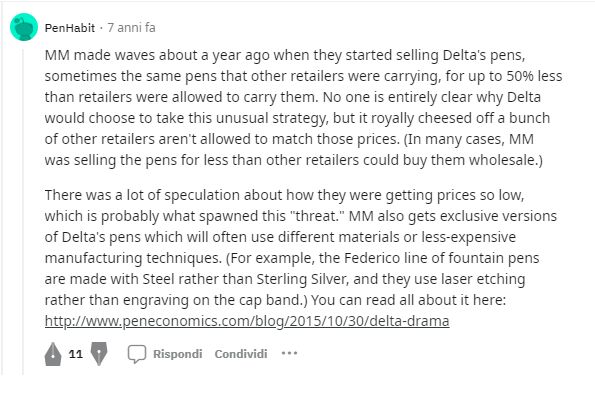 La Federico fu in effetti una delle prime varianti di modelli Delta, che a parte spesso i materiali diversi, il pennino fusion (che è comunque un buon pennino) e l'anello non in argento, in tutto il resto risultava equivalente alla Dolce Vita ad un prezzo inferiore.