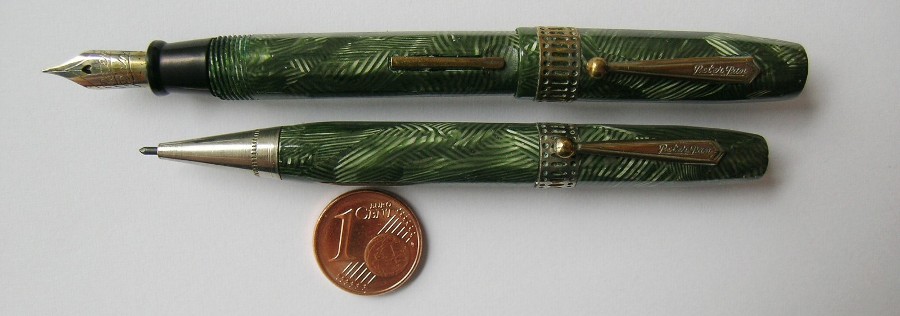 1 set in celluloide verde. Penna stilografica e matita meccanica. La stilografica è una Lever Filler