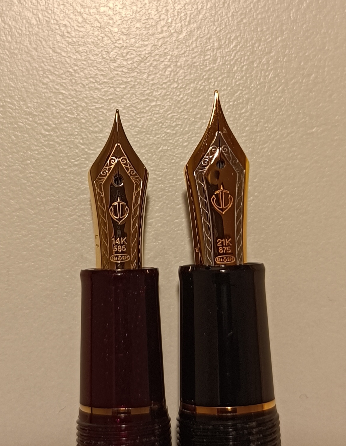 Se può essere d'aiuto, invio foto con confronto diretto tra pennino 21K della Professional Gear e il pennino 14K della 1911 Profit Light; oltre alla caratura, si nota che il pennino 21K è leggermente più grande rispetto a quello 14K, e il 21K è bicolore (ma come giustamente diceva Koten esiste anche il 21K monocolore della stessa misura montato sulla 1911 Large).