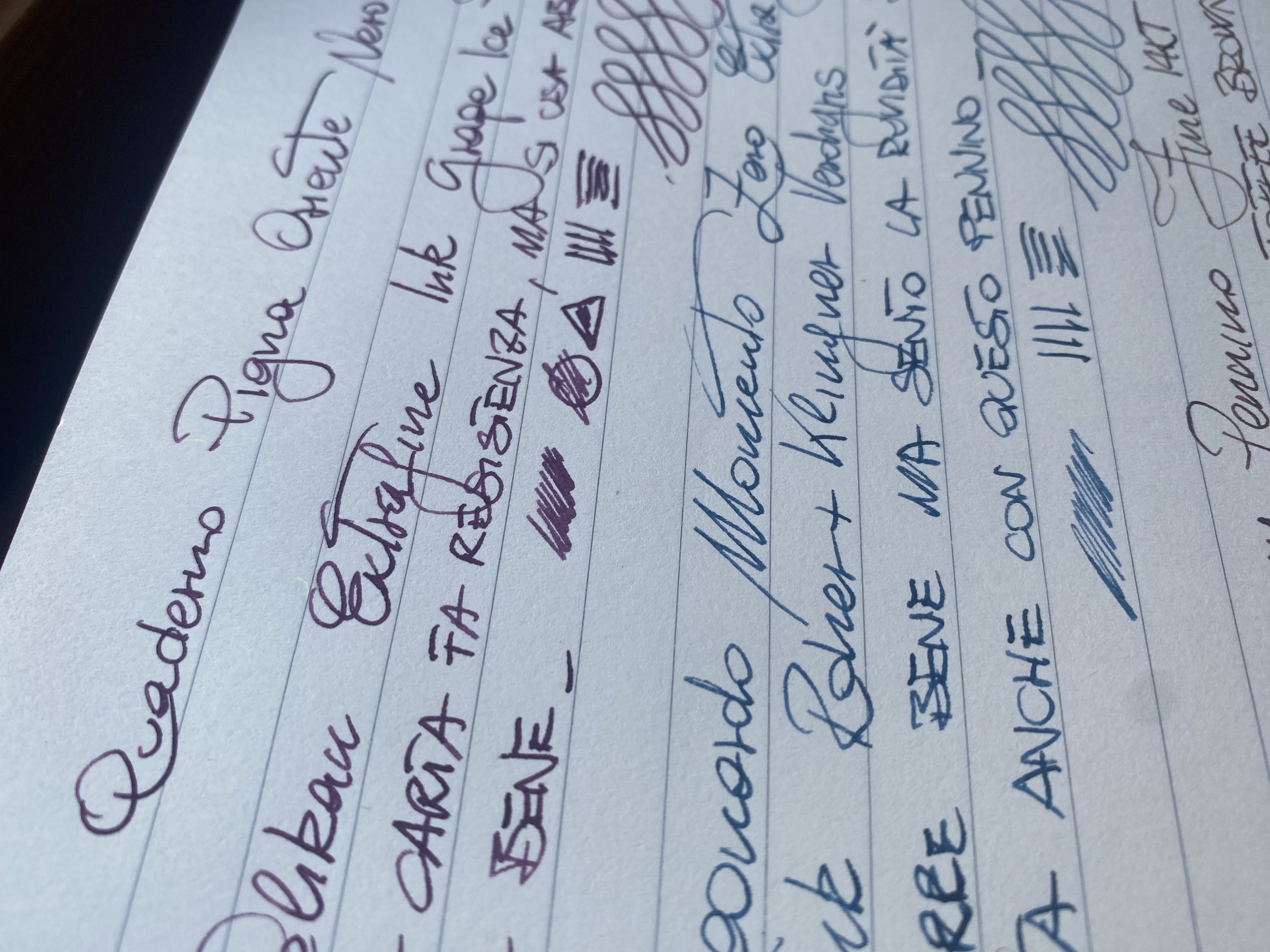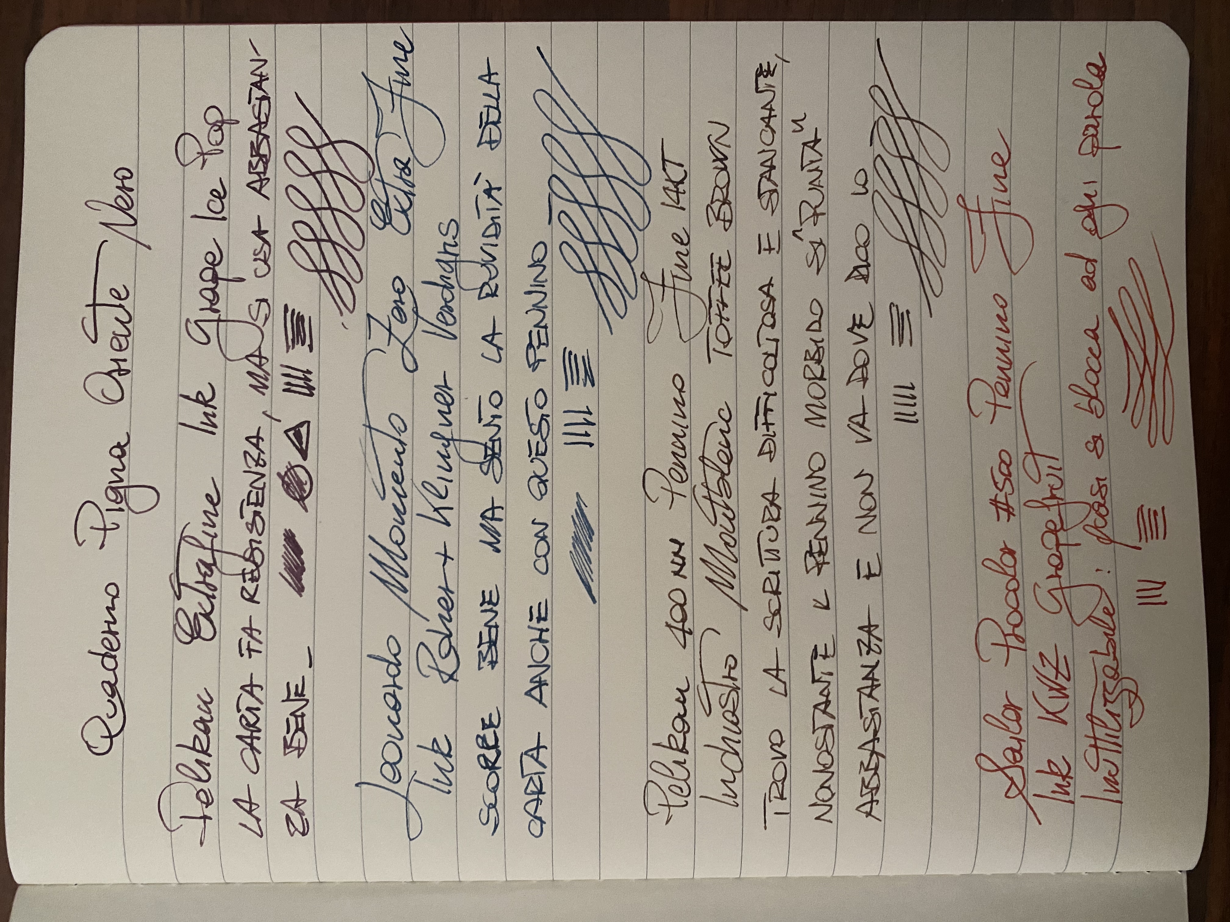 Ecco la prova con una pelikan con pennino M; si sentono meno le asperità e la ruvidità della carta, però aumentare la tendenza ad allargare un po’ e spiumare.