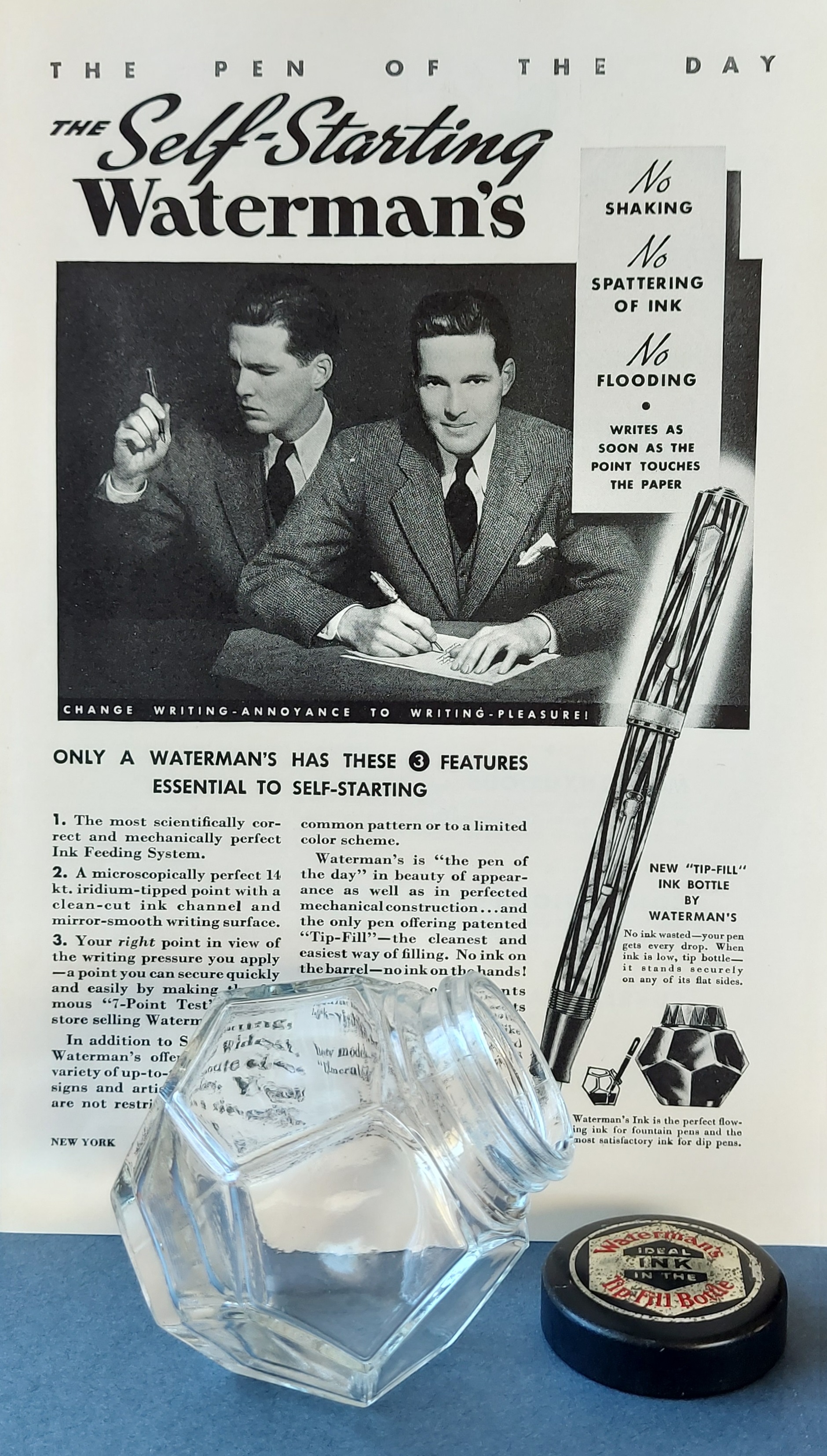 WATERMAN’S Inks: DE LUXE “TIP-FILL” BOTTLE (G. Larsen) — New York, 1935