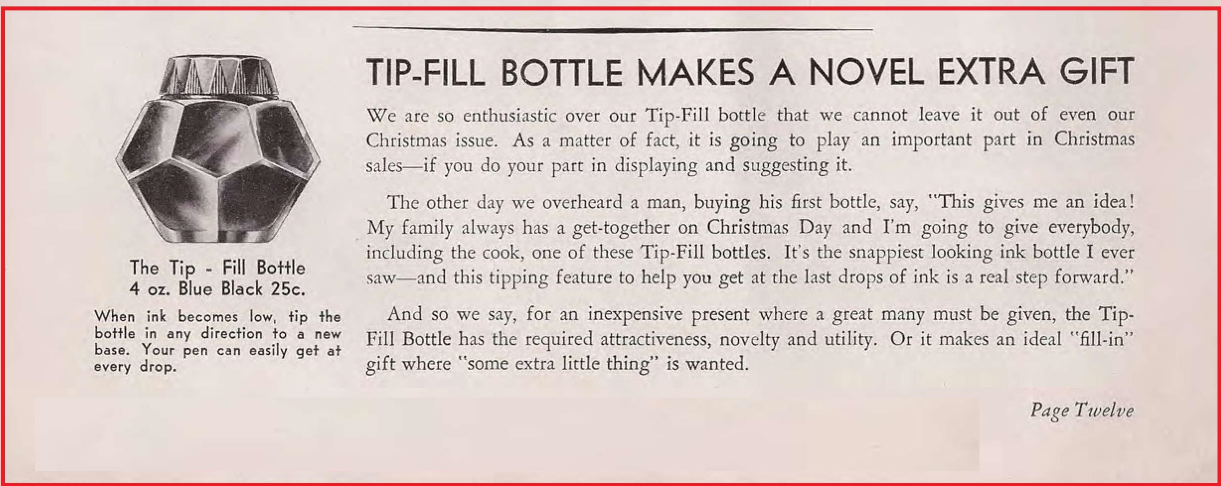 Il nome commerciale <“Tip-Fill” Bottle> dovette però giocoforza essere aggiornato già l’anno seguente (1936), per l’avvento sul mercato dell’altro calamaio coricabile, più piccolo, più economico (dettaglio non certo trascurabile per gli studenti!) a soli 10cents al pezzo per 2 once di inchiostro, e il nostro calamaio fu quindi ribattezzato dalla Waterman (come chiaramente si legge nel primo allegato del 1936)