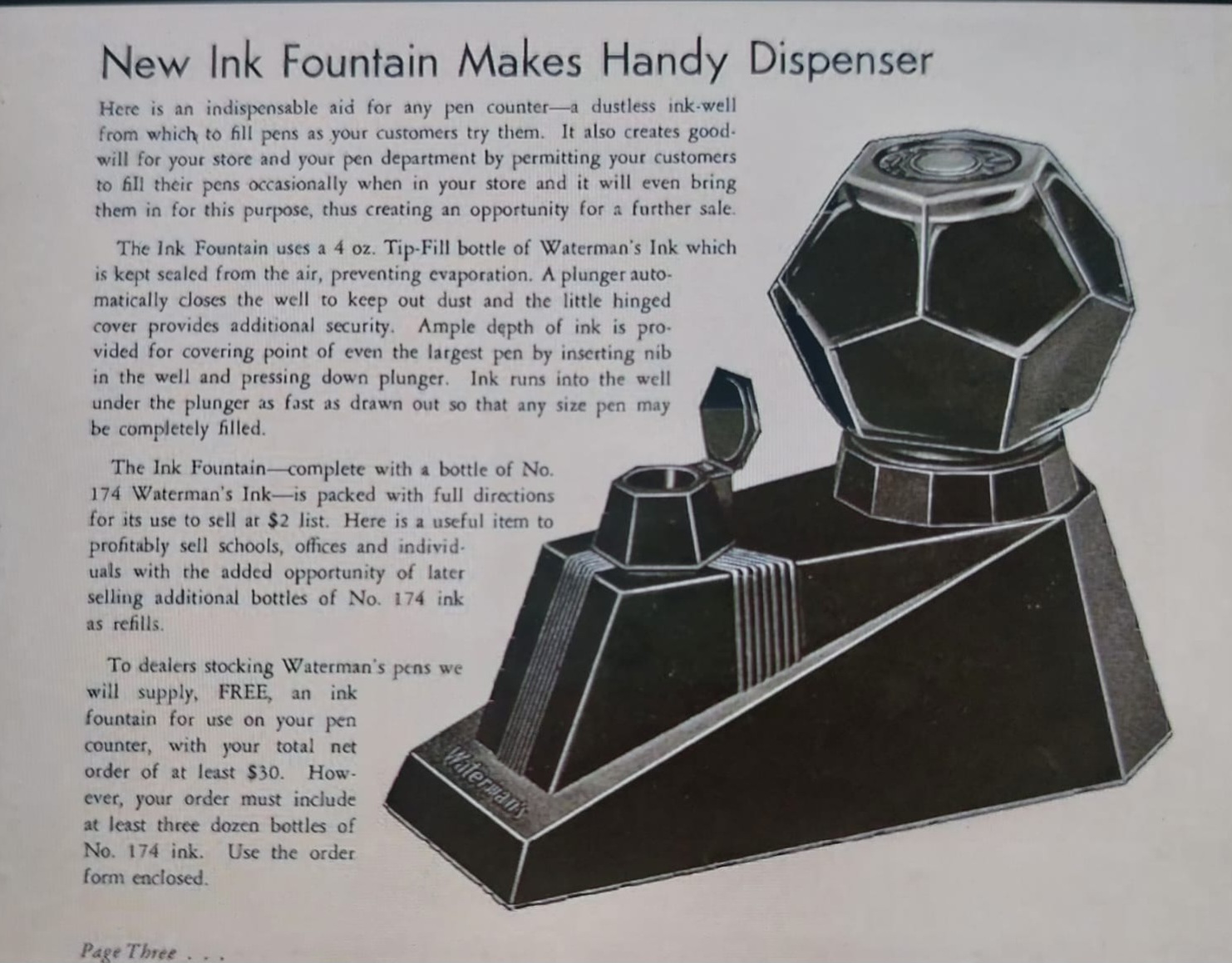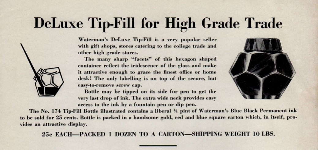 WATERMAN’S Inks: DE LUXE “TIP-FILL” BOTTLE (G. Larsen) — New York, 1935