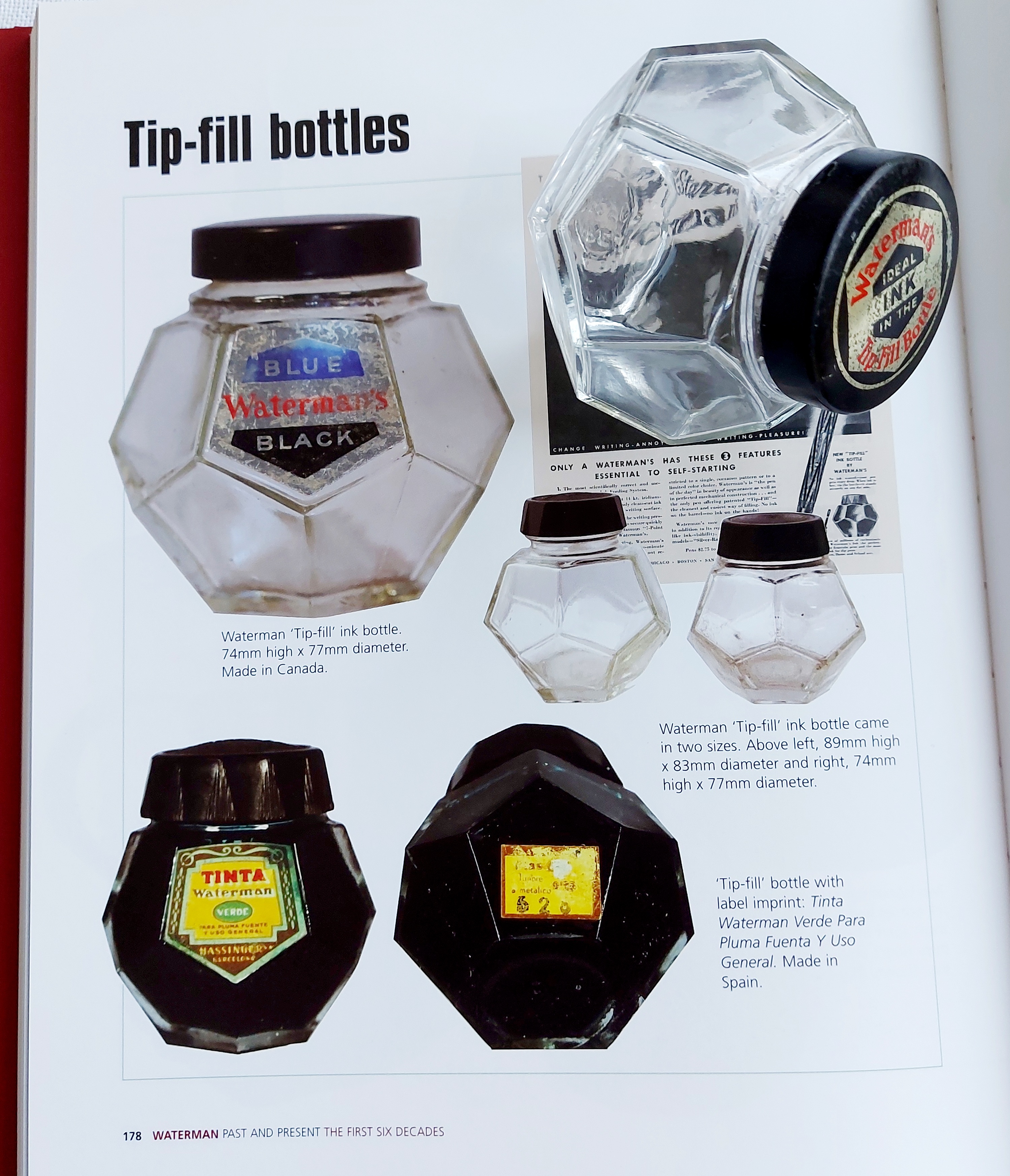 Il primo flacone “Tip-Fill” (numero ② nel primo allegato) oggi in presentazione era stato progettato da uno dei massimi creatori di stilografiche di sempre, il designer Gabriel Larsen, lo stesso che aveva disegnato la mitica Patrician e poi la Waterman #94, la Lady Patricia, anche nella versione Ink-Vue…