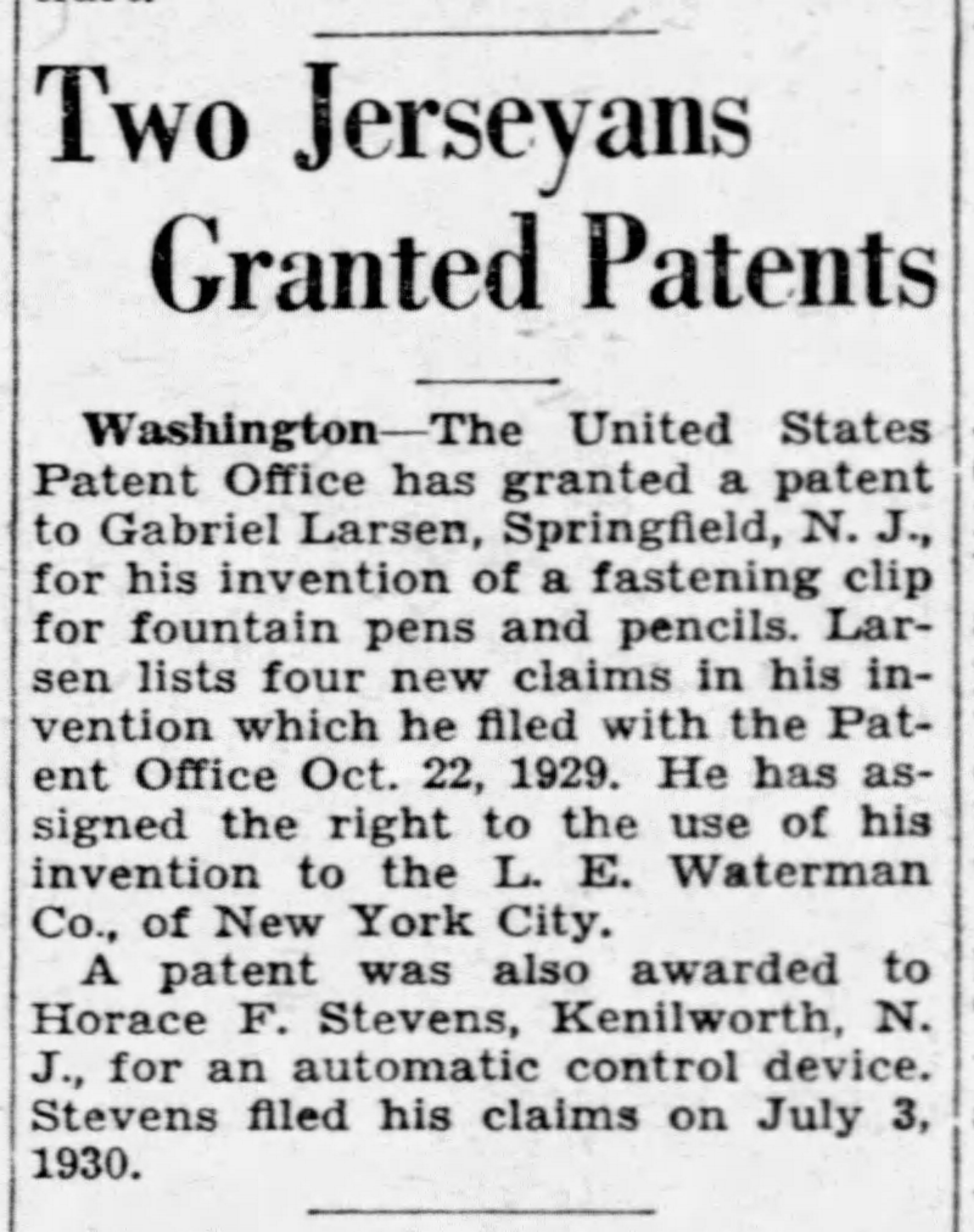 Nella prima si ricorda un suo brevetto per un fermaglio, e si aggiunge la circostanza che lo sfruttamento di tale brevetto era stato ceduto alla Waterman (informazione che a volte si ricava, comunque, dai brevetti stessi).