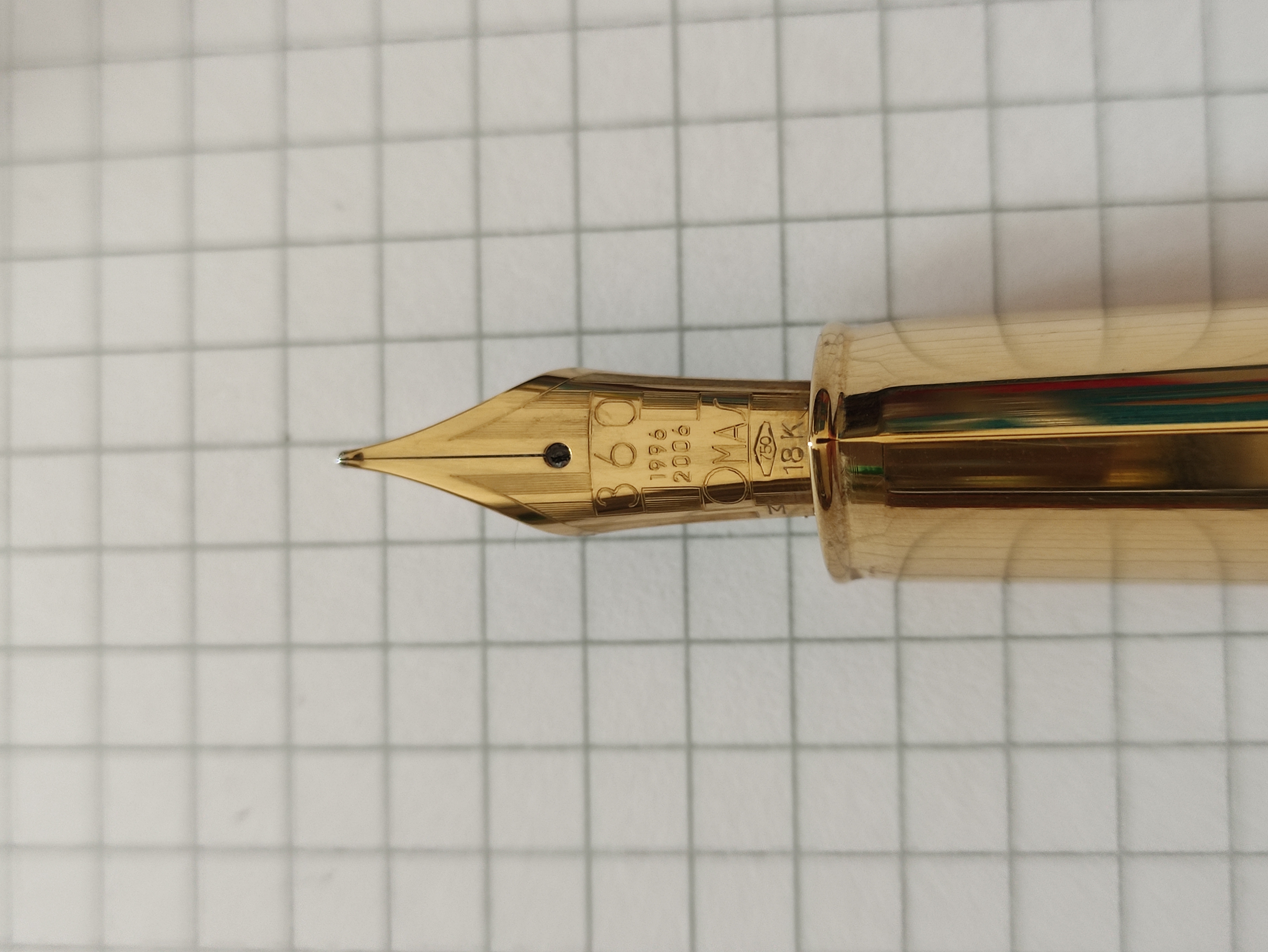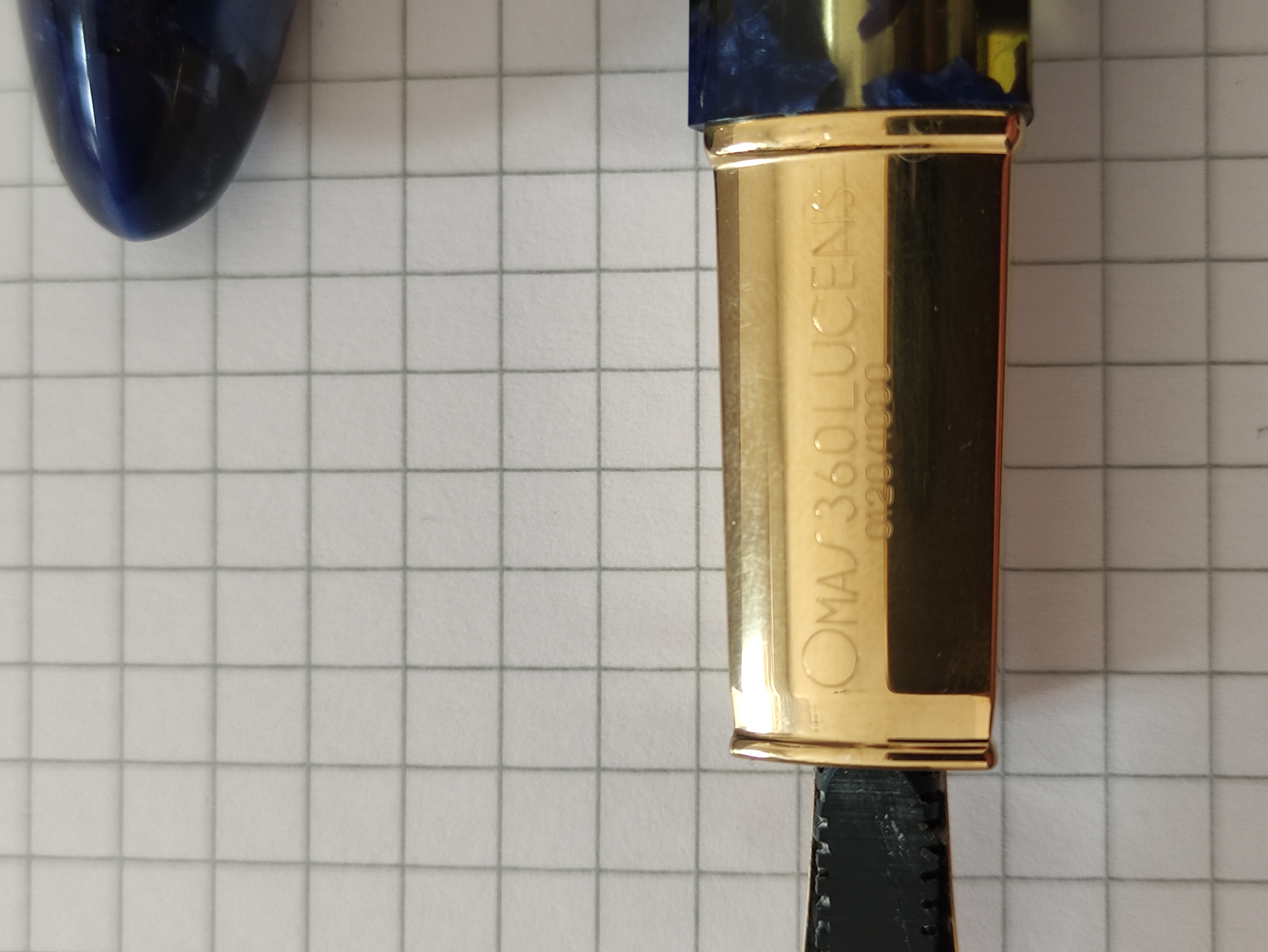 Domenica in giro per mercatini una penna attrae la mia attenzione, una Omas 360 Lucens edizione limitata. Il pistone scorre perfettamente, la celluloide blu è veramente molto bella, dimensioni generali della penna importanti direi che siamo a livelli di una 149. Pennino in oro 18k, piacevolmente morbido, misura M (peccato, avrei gradito un EF, ma non si può pretendere di avere la botte piena e la moglie ubriaca). Alimentatore in ebanite da 6,5mm, la capacità del serbatoio è di 1,2 ml. Sulla "base" della sezione triangolare è inciso "Omas360Lucens" e sotto il numero dell' esemplare 120/1000. Sul lato di destra sono presenti due punzoni (ho il vago sospetto di aver bisogno di una visita oculistica) nel primo un ovale con all' interno il titolo dell'argento (925) il secondo punzone riporta la stella della Repubblica, 144 il numero del fabbricante e la provincia BO. La penna, prodotta in mille esemplari di cui dall' 1 al 500 laminato in oro mentre dal 501 al 1000 in argento e pennino rodiato.