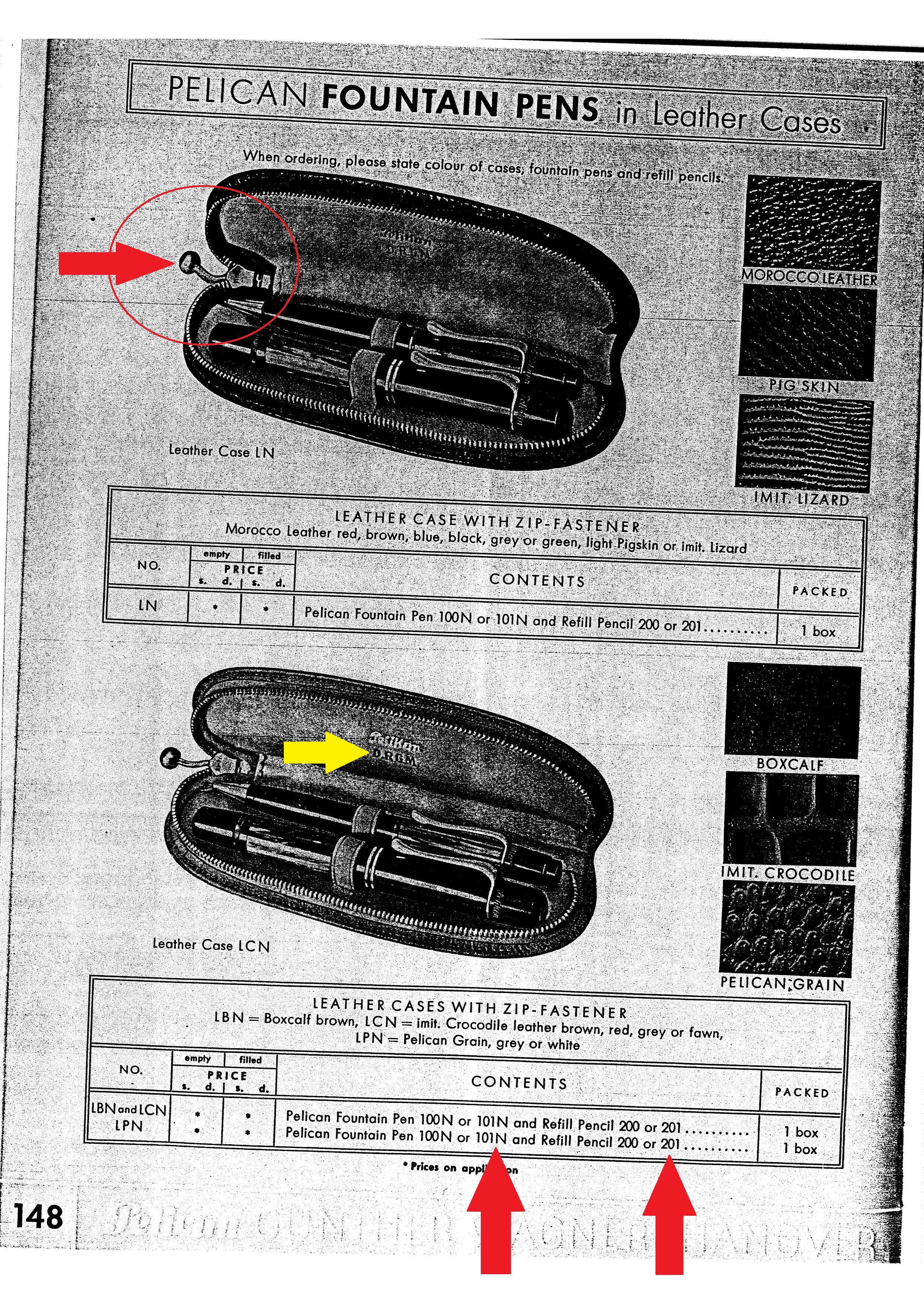 • Stando alla mia esperienza anche con MontBlanc (confermata dai cataloghi consultabili: qui sotto ti allego una pagina di quello Pelican, senza <K> perché inglese, del 1939), prima e durante la Guerra la cerniera del porta penna non dovrebbe essere operata dalla palettina forata (come sulla tua) bensì da una sferetta in metallo pieno all'estremità di una catenella di maglia.