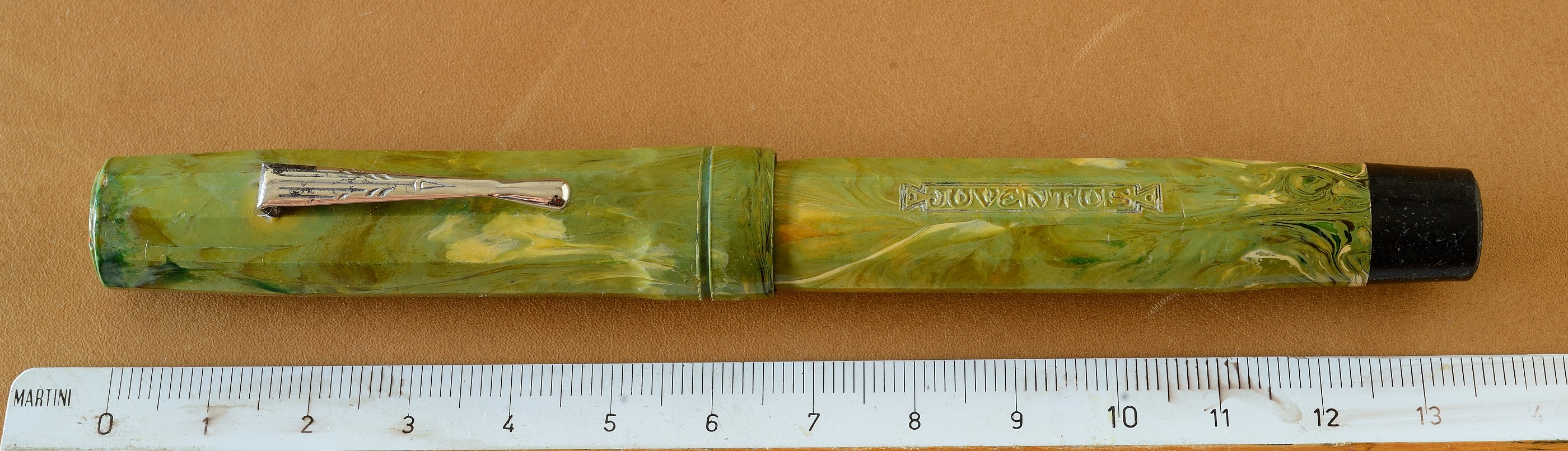 Marcata Juventus al corpo in una targa, realizzata in ebanite faccettata (10 faccette), caricamento a pulsante di fondo, pennino Reor in acciaio,