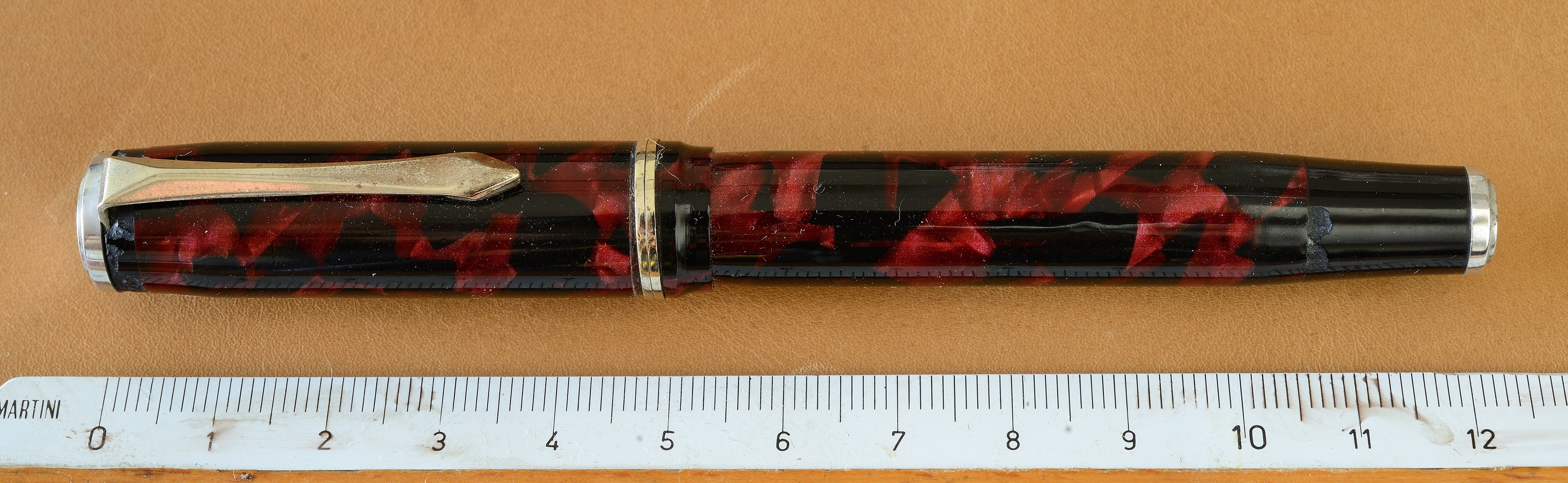 La terza, anonima, in celluloide rosso/nera marmorizzata, caricamento a pulsante di fondo,