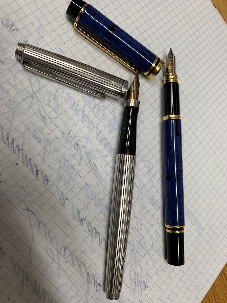 La Waterman aveva i rebbi allargati, sistemati, scrive con un bel medio morbido e scorrevole, lavata e inchiostrata con Pelikan 4001 Royal Blue