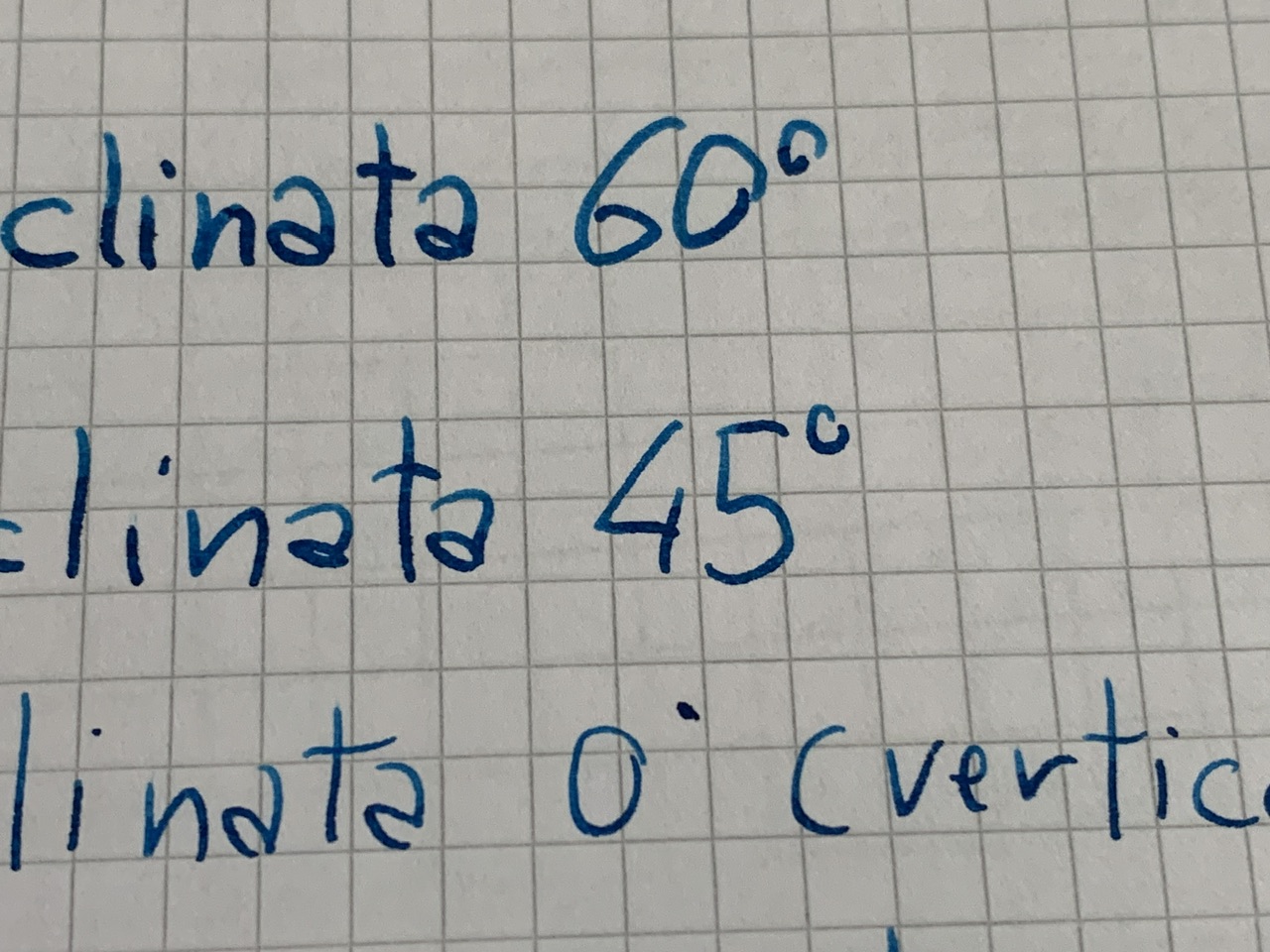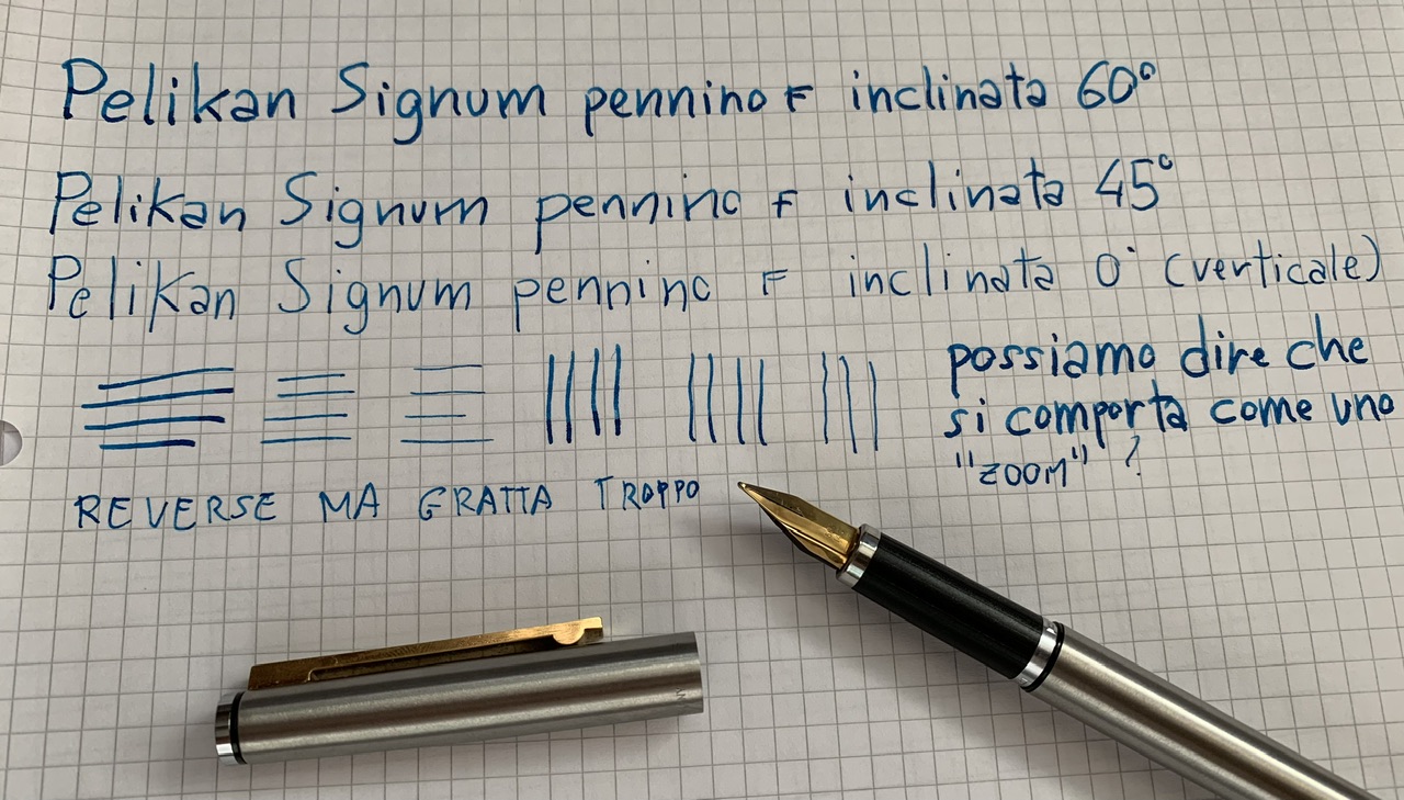 Con un appoggio normale, diciamo 60 gradi scrive come un medio , se la tengo tra i 45 e i 30 gradi scrive fine, se la tengo oltre i 30 gradi fino alla verticale scrive come un extrafine.