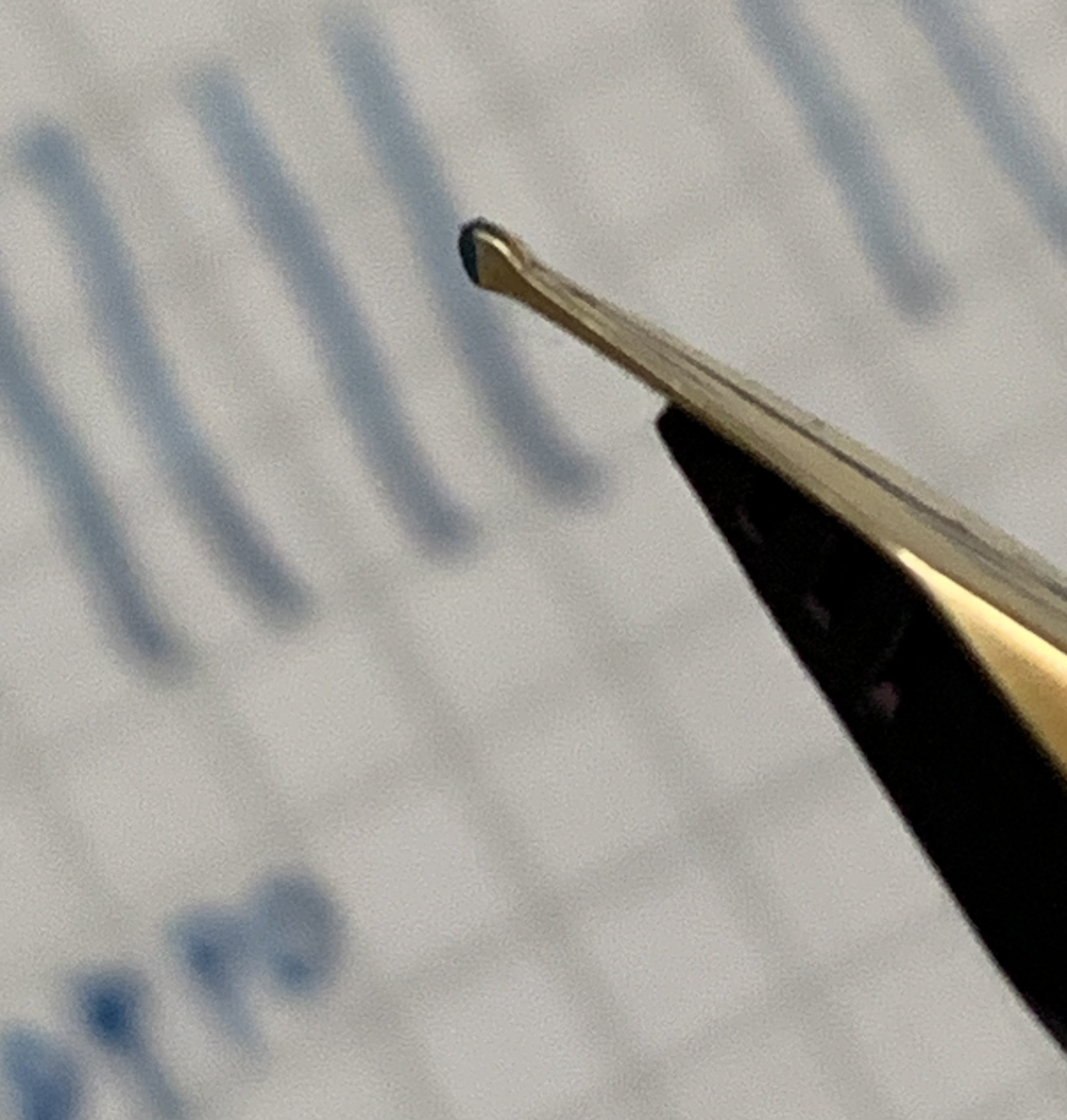 Oggi ho caricato la mia Pelikan Signum con le ultime gocce di un campioncino di Diamine ASA blue con l'intenzione di finirlo, e mentre mi trastullavo prendendo qualche appunto mi è cascato l'occhio sulla pallina di iridio (che iridio non è...) del pennino.