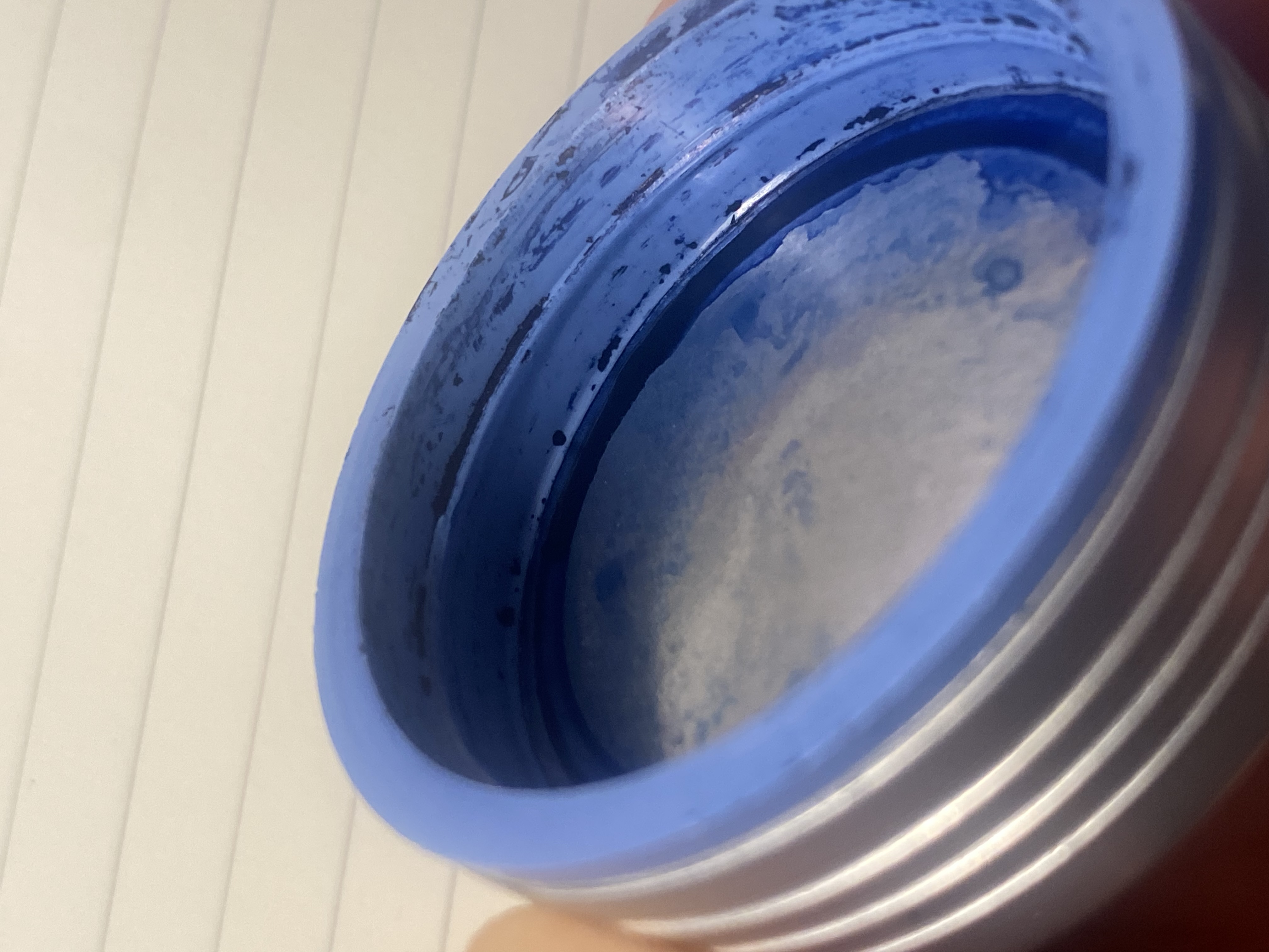 Anche nella boccetta, nelle filettature del tappo ed in quelle del vetro c’è sedimento secco.