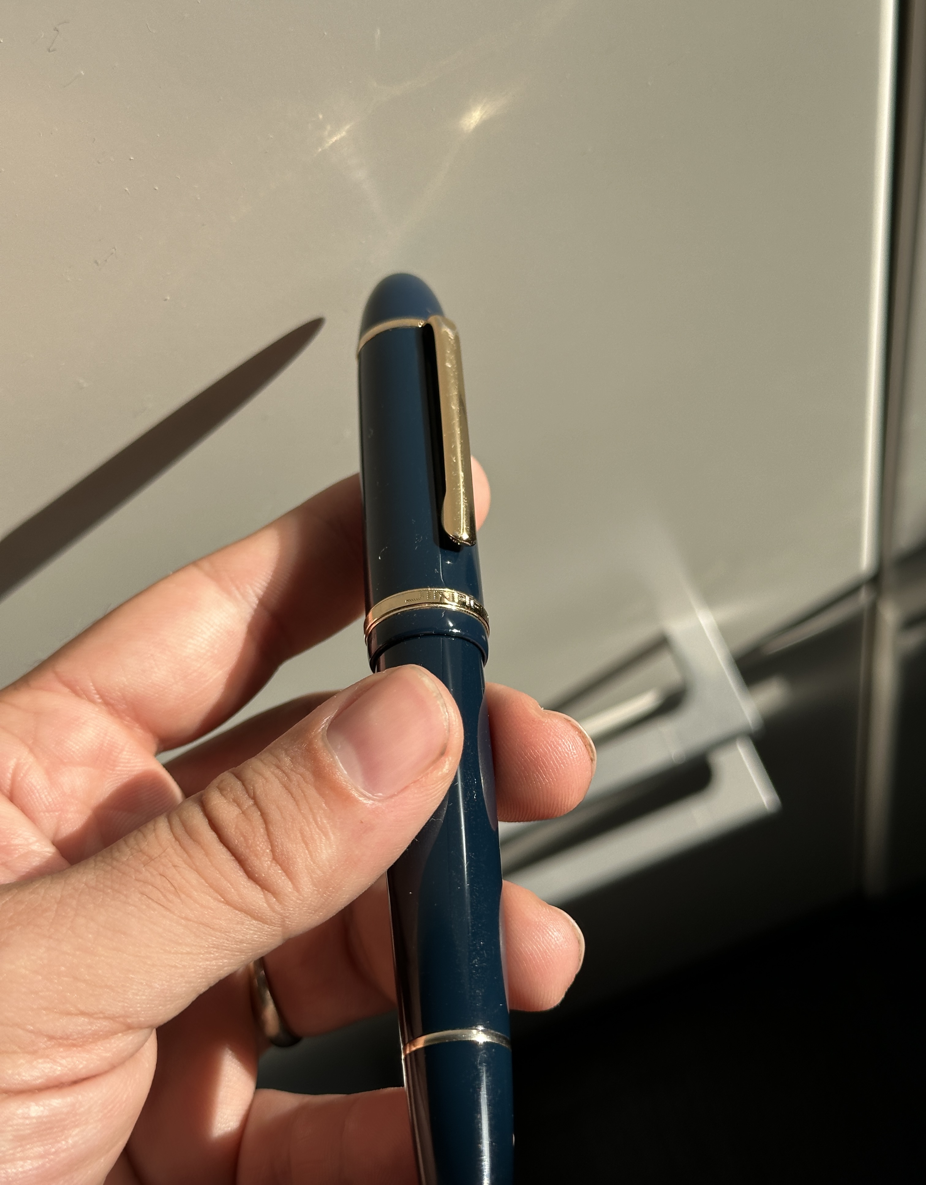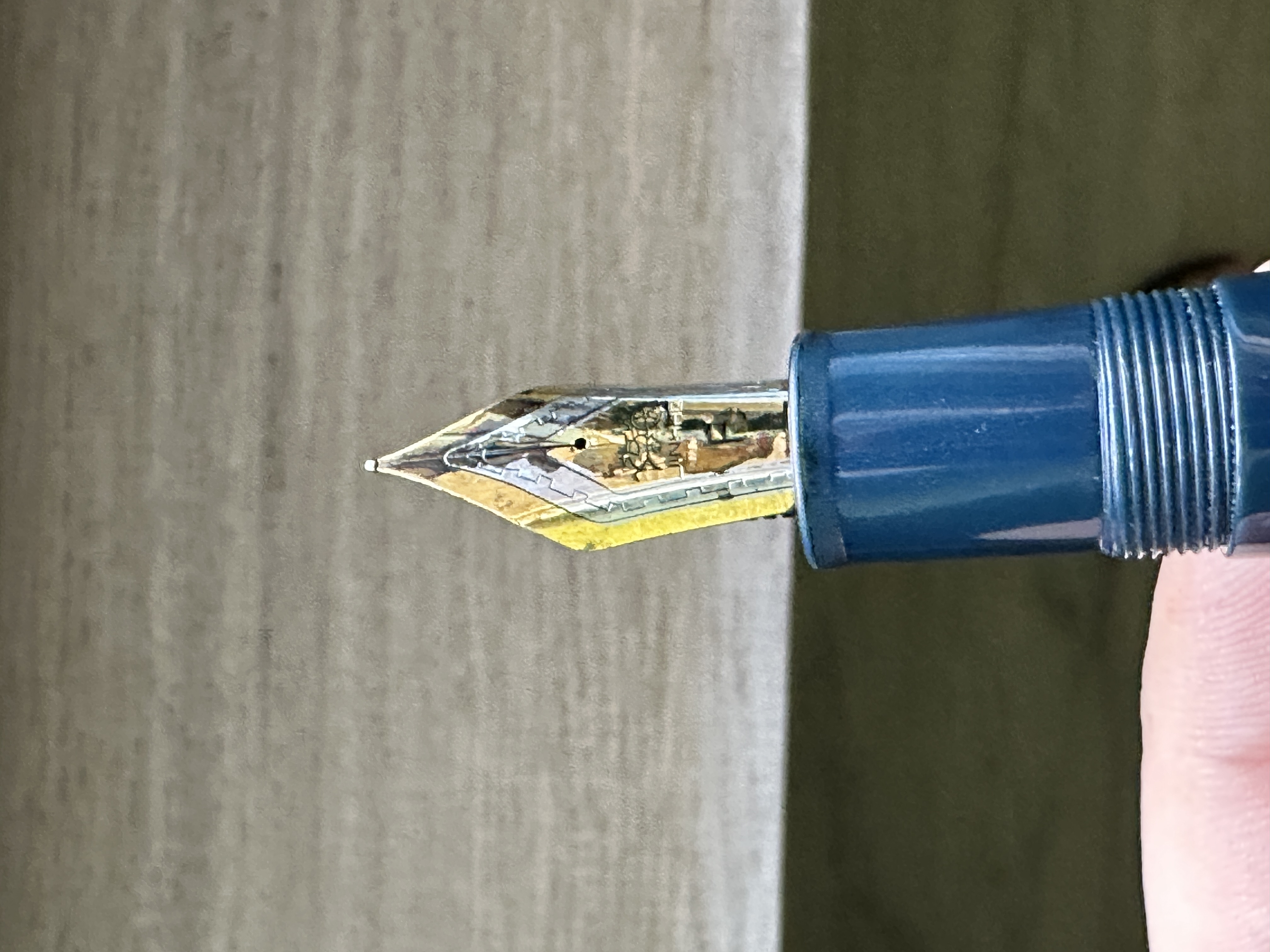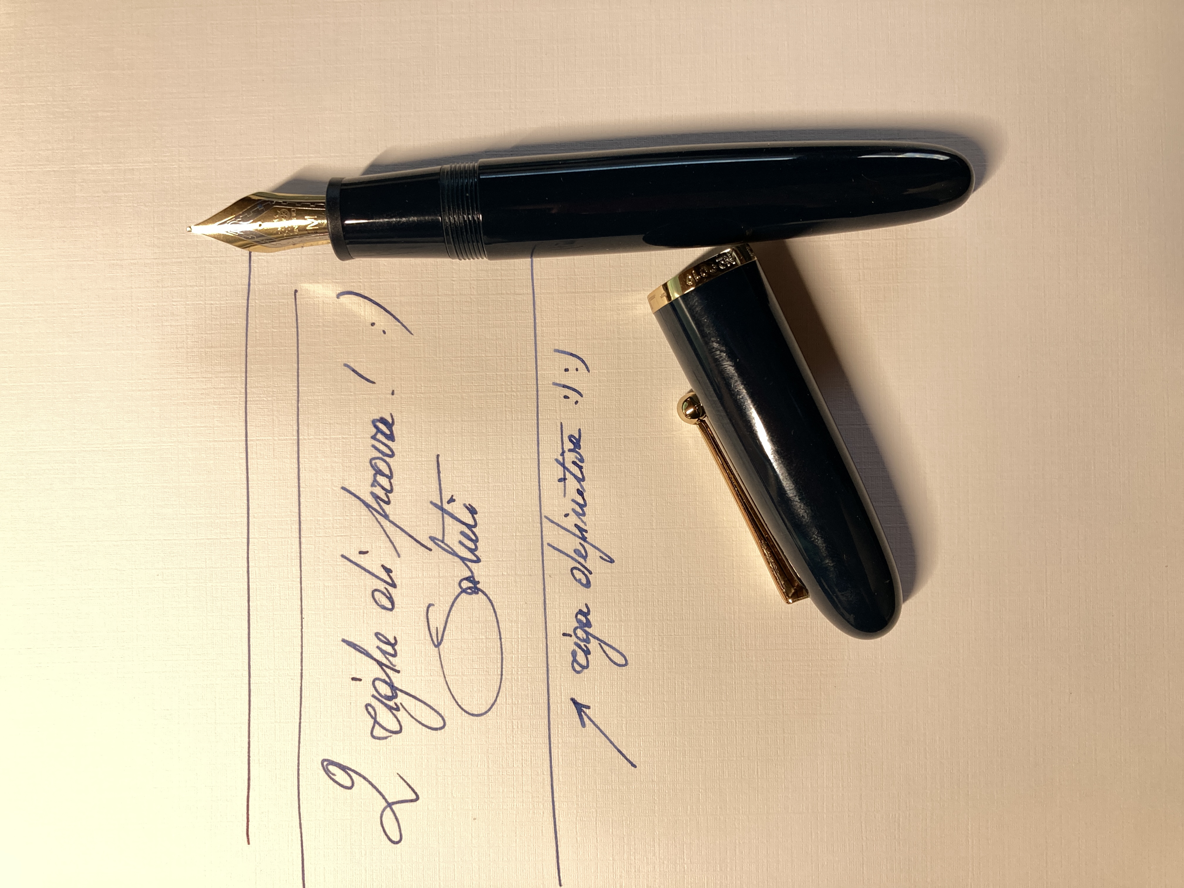 Arrivata oggi. Blu scuro con finiture dorate. Bella grossa e pare fatta bene, solida. Bello e capiente il converter con attacco a vite. Giunta con pennino perfettamente regolato, caricata con Waterman Bleu Mystere sta scrivendo senza incertezze (ho preso il pennino M). Come per la X159 hanno frapposto un o-ring tra sezione e fusto. Per ora sono molto, molto soddisfatto