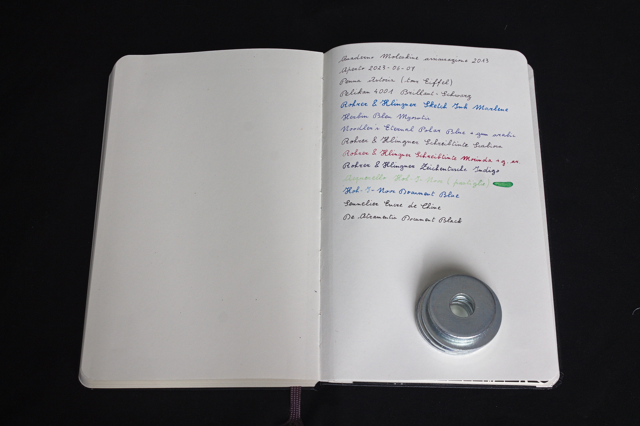 Qualche anno fa mi sono intestardito per l'uso della stilografica sui quadernetti Moleskine (classic notebook 13x21 copertina rigida) che uso tutti i giorni per tenere traccia delle mie pratiche (faccio una specie di diario giornaliero dove nel giorno apro una pagina nuova per ogni pratica) ed ho trovato (per me) la soluzione perfetta: inchiostro Rohrer & Klingner - Schreibtinte Eisen - Gallus - Tinte "Salix" (un ferrogallico).