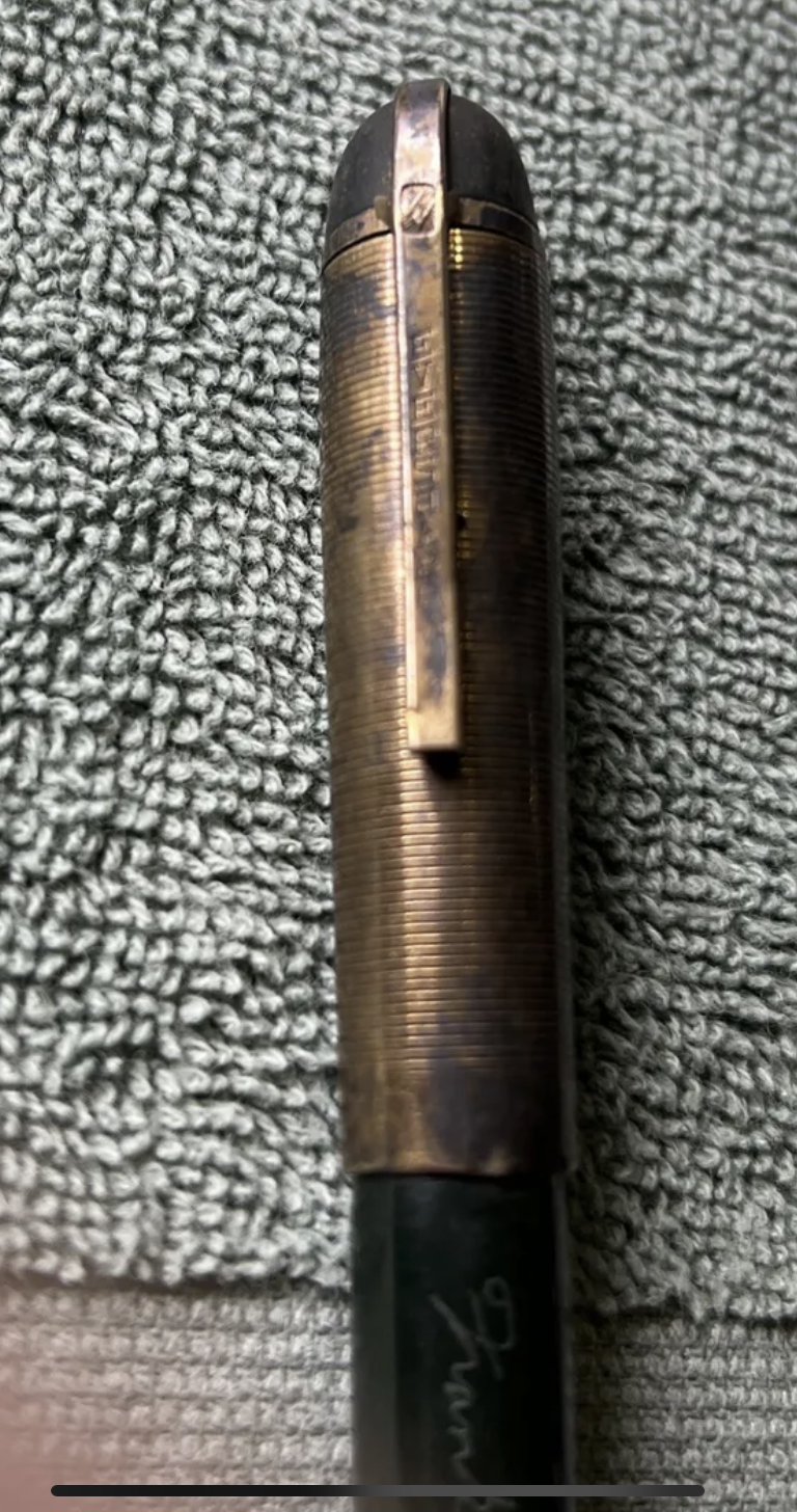 Mamma mia! Sotto quella patina color marcio, e anche se c’è qualche bozzo per cui non credo che si potrà fare molto, la penna è tornata praticamente nuova, bella da mozzare il fiato!