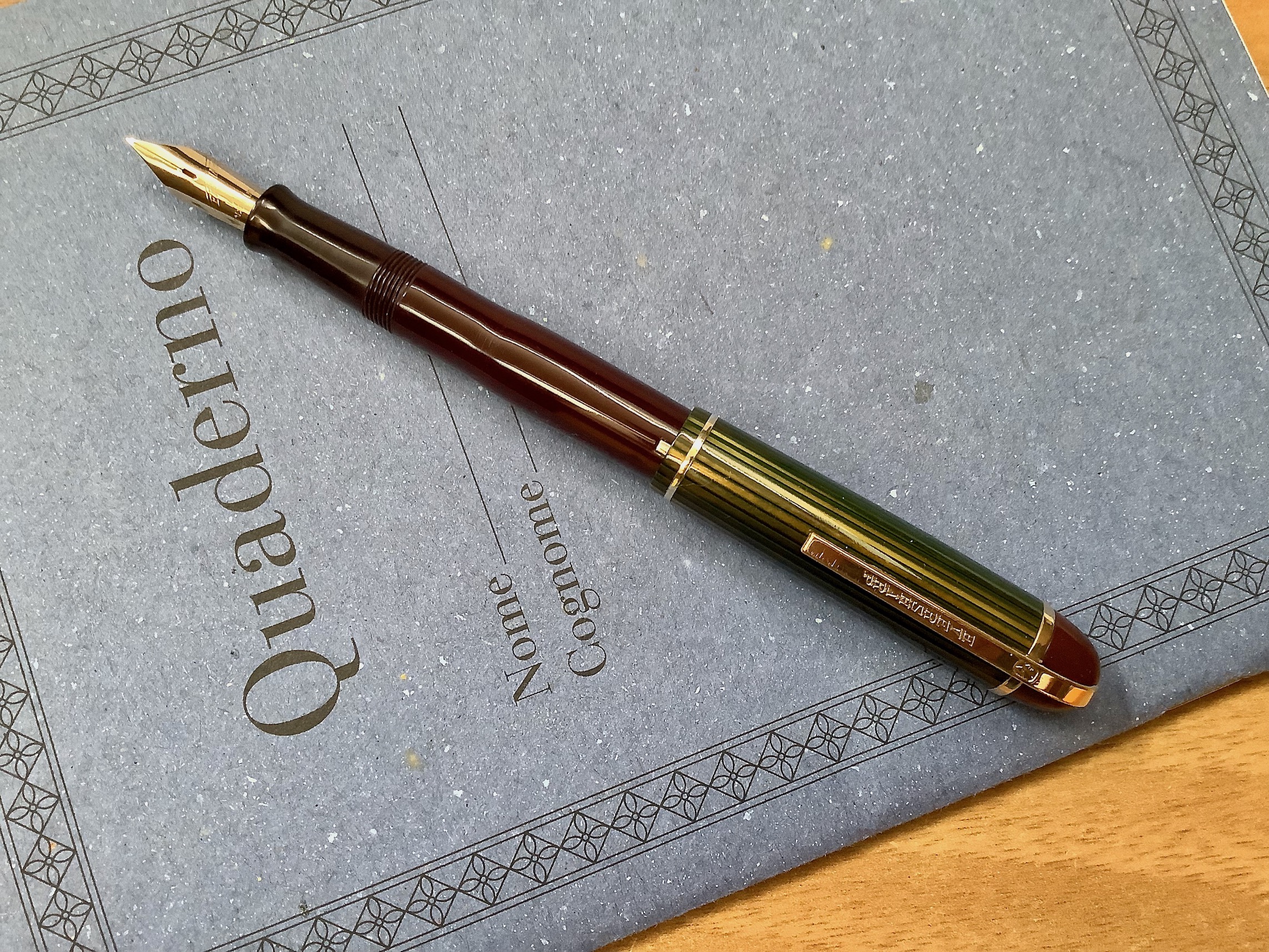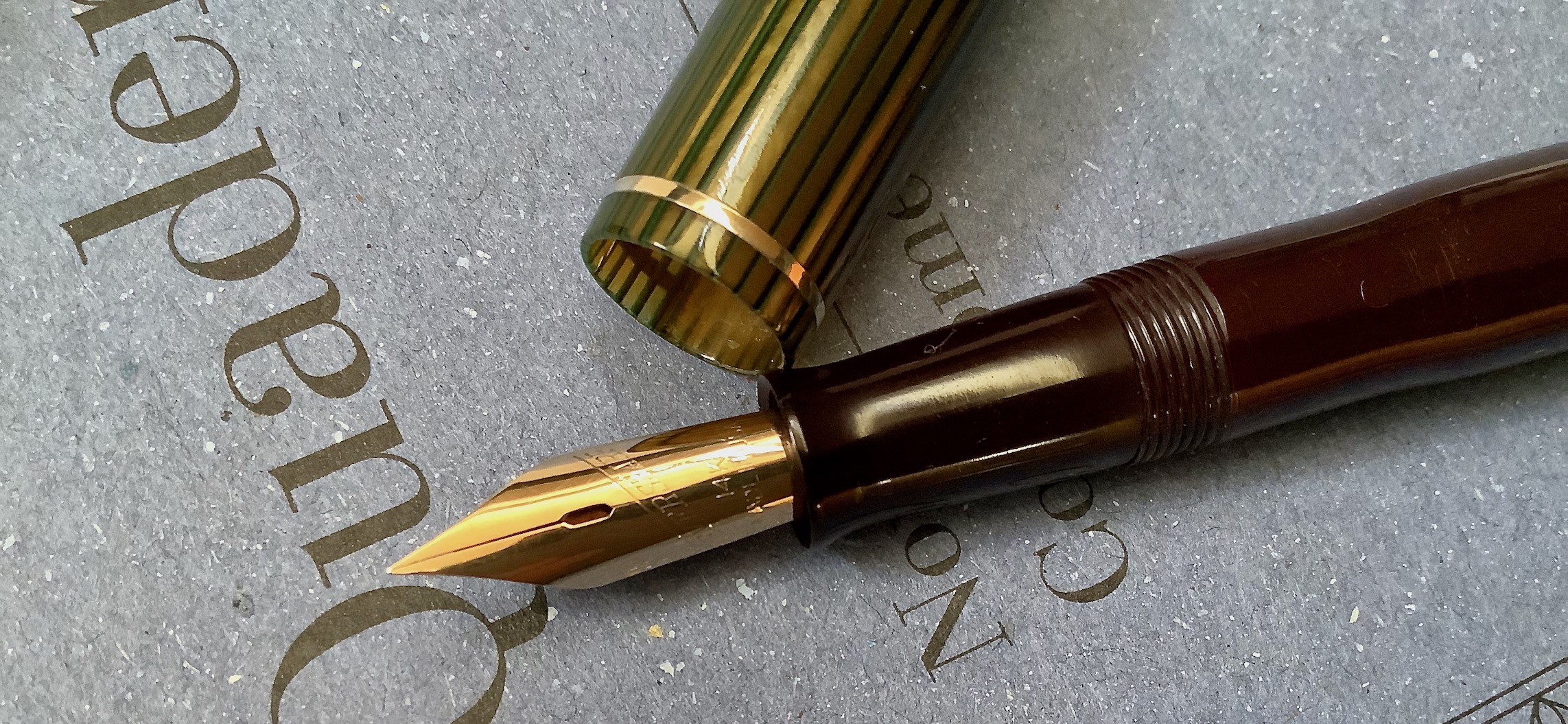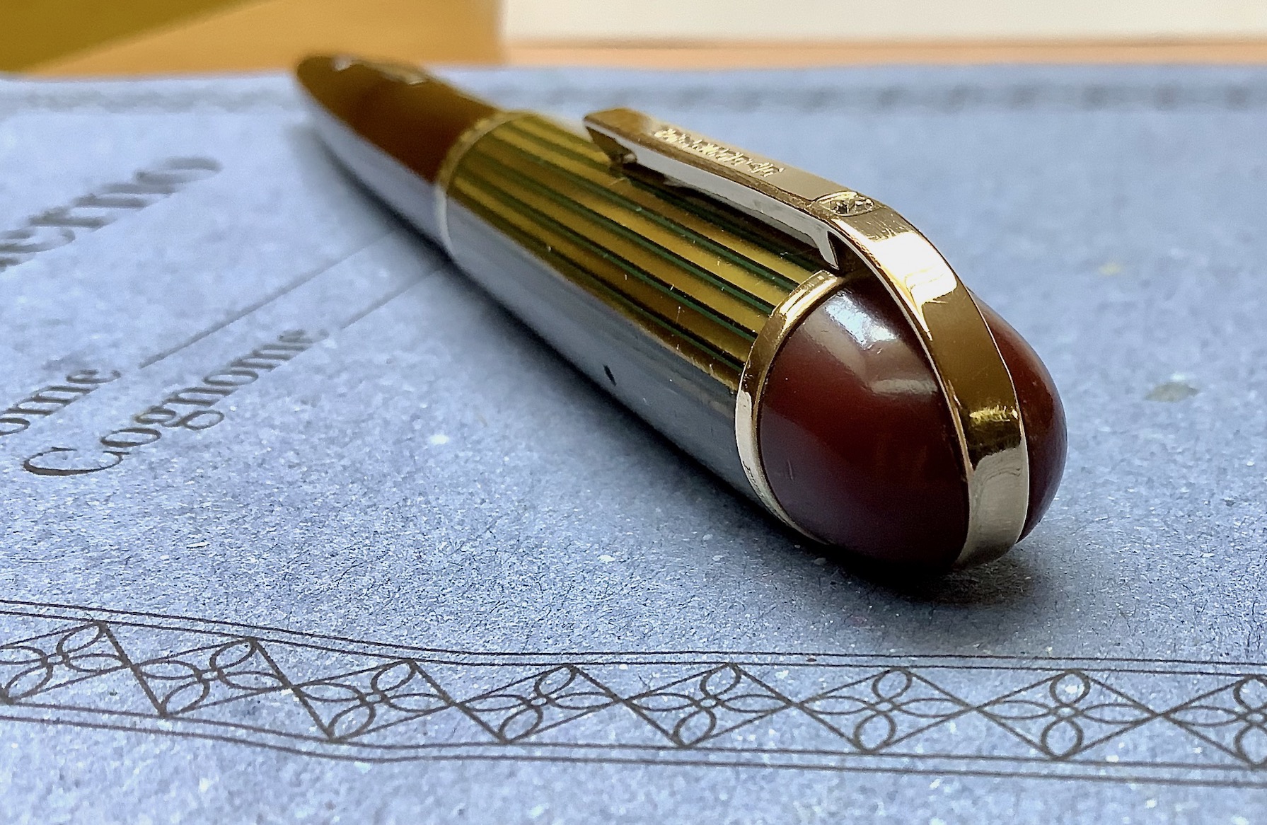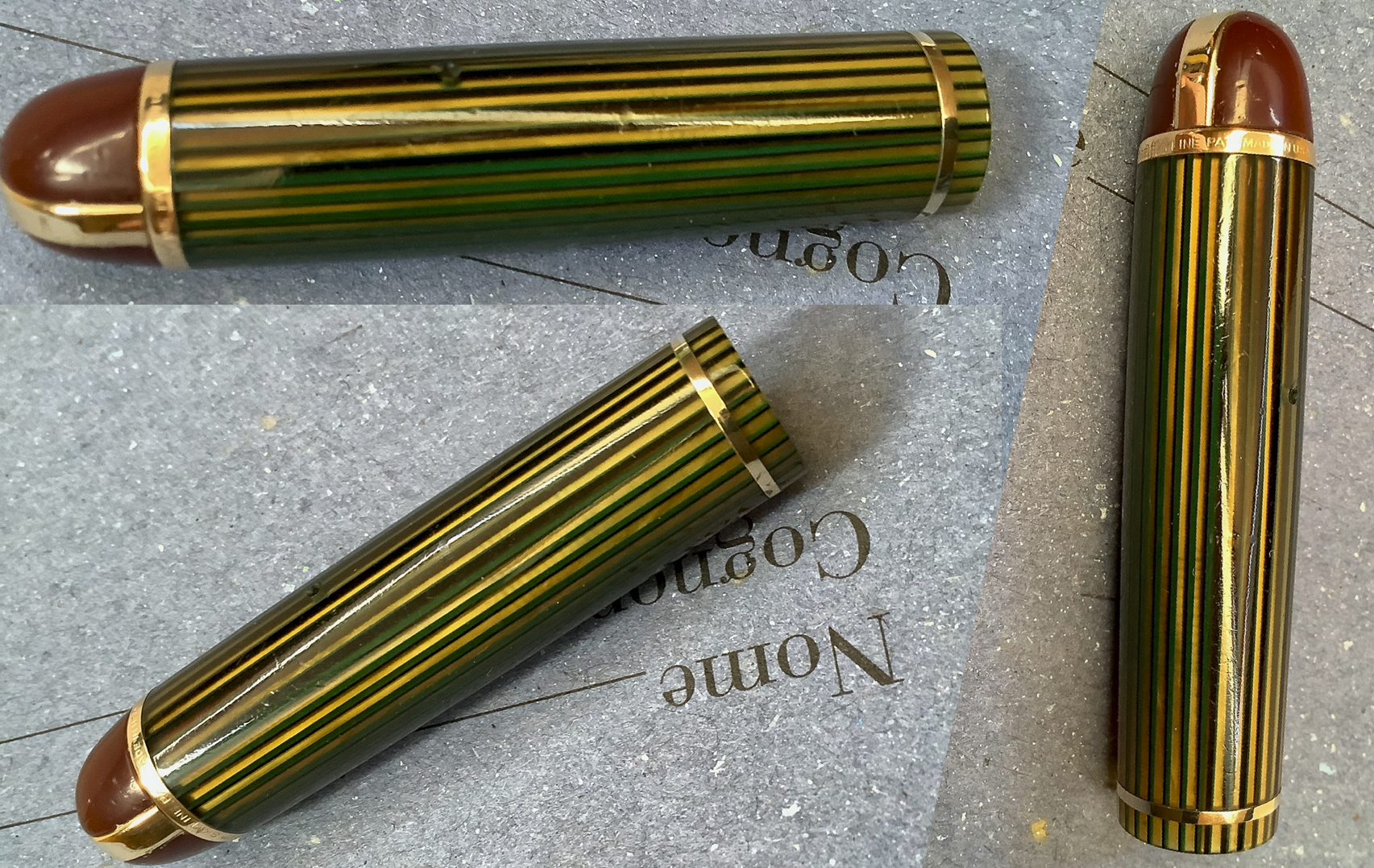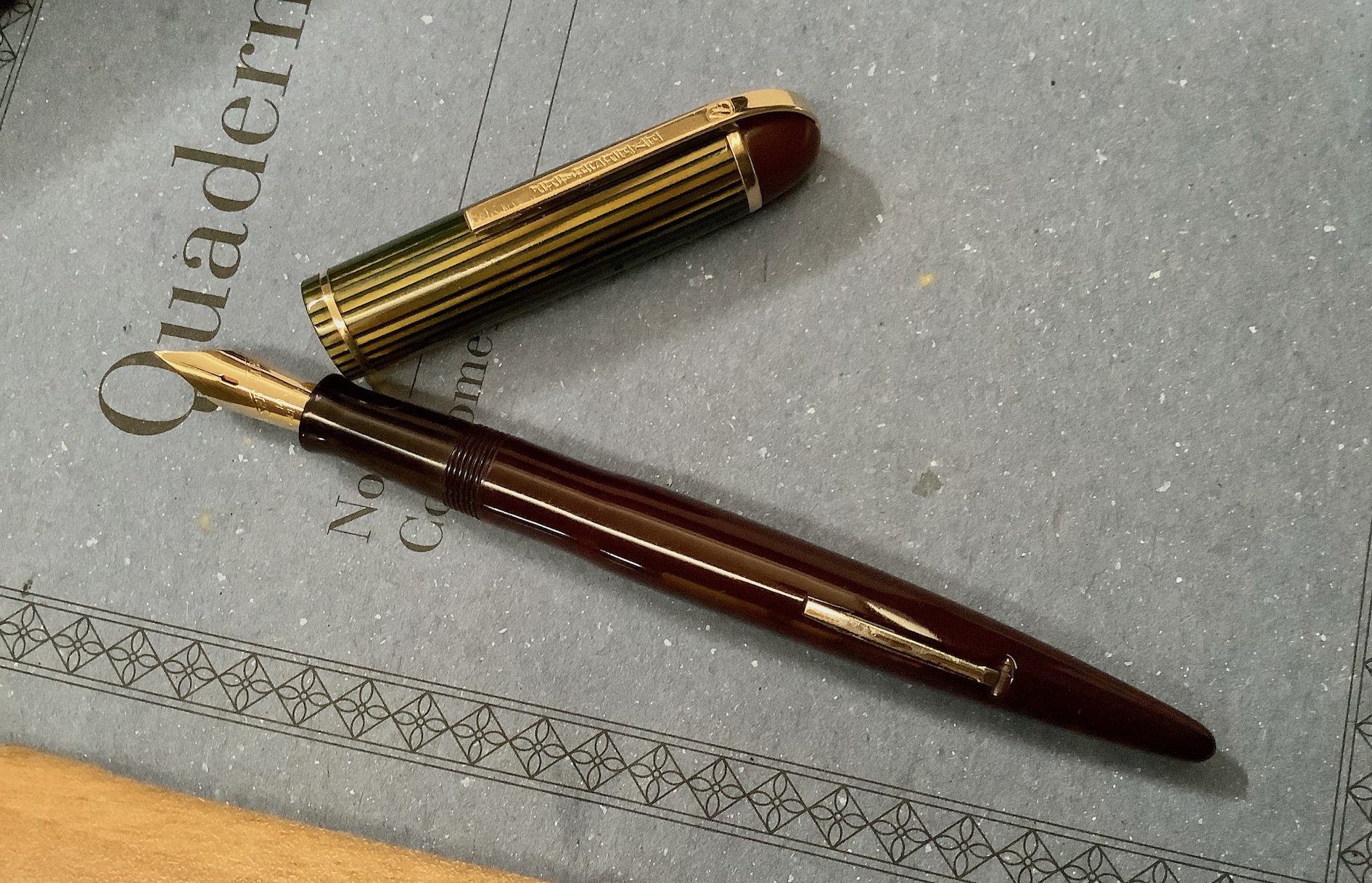 Lascio qui qualche immagine di questa Eversharp Skyline di dimensioni standard (chiusa è 5 pollici e 1/4 , quindi poco meno di 13,5 cm) con la fasciatura del cappuccio in celluloide striata marrone chiaro con venature di color verde (che si presenta osservandolo sotto certe angolature), molto bello e particolare.