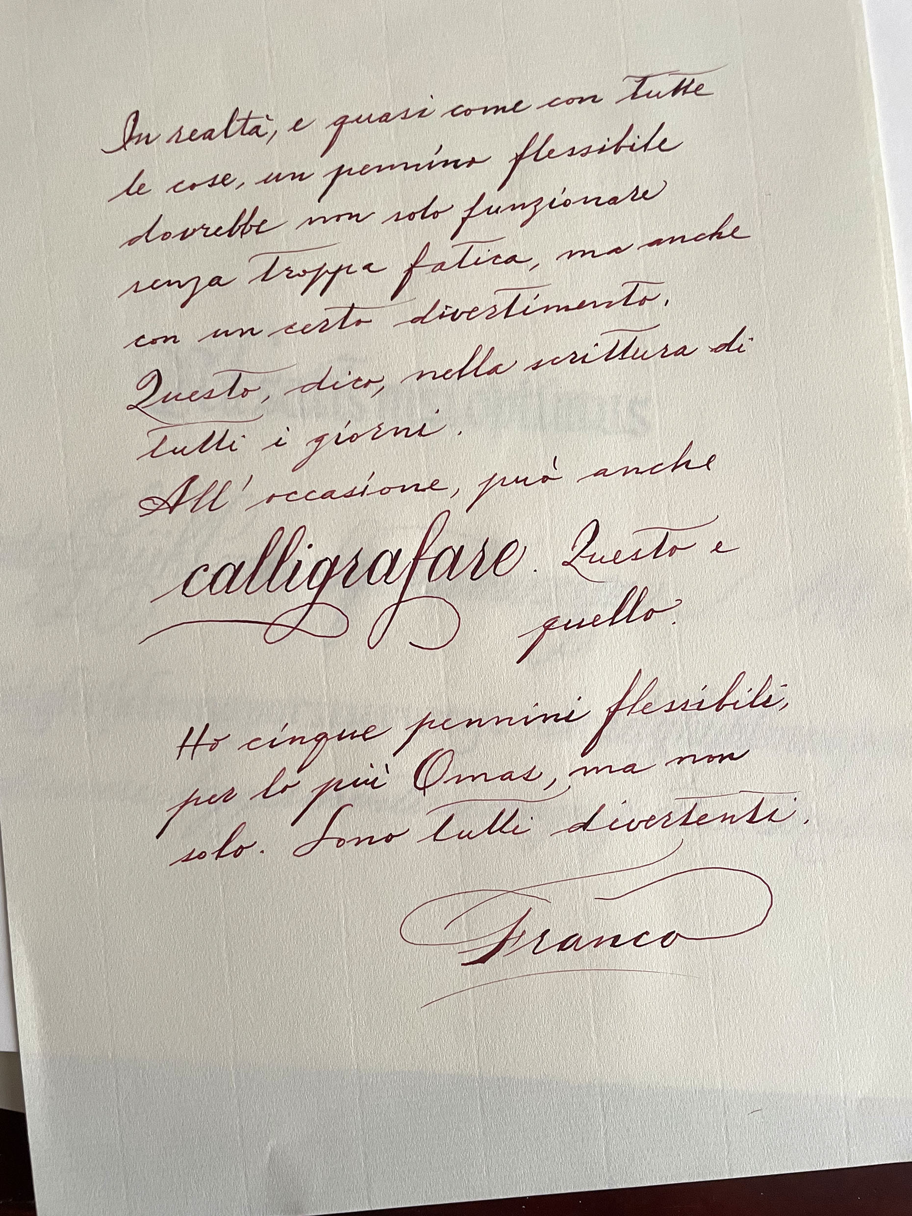Ma in fondo sono d'accordo con chi dice che le performance calligrafiche non sono indispensabili, così come non é necessario che uno debba eseguire, con il suo pennino flessibile, alcun tipo di scrittura formale. L'accento qui é sullo scrivere, con gusto, come si vuole, ma con piacere e con quel pizzico di carattere che il pennino flessibile dovrebbe facilitare.