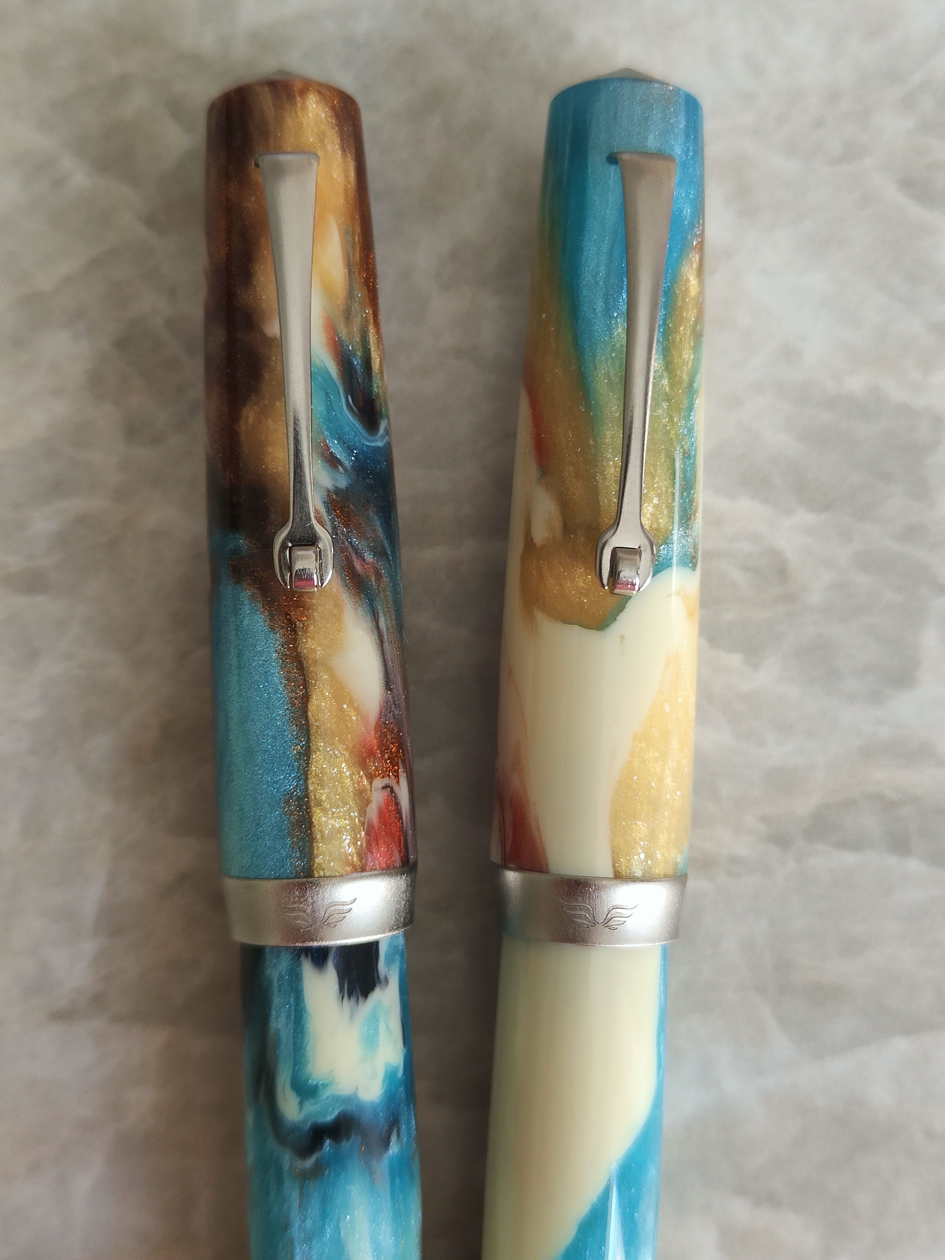 Quando sono davanti ai riferimenti allo spazio, io proprio non resisto, allora ne ho prese due a distanza di un mese, due penne che sulla carta sono identiche ma che, di fatto, sono completamente diverse nelle loro tonalità.