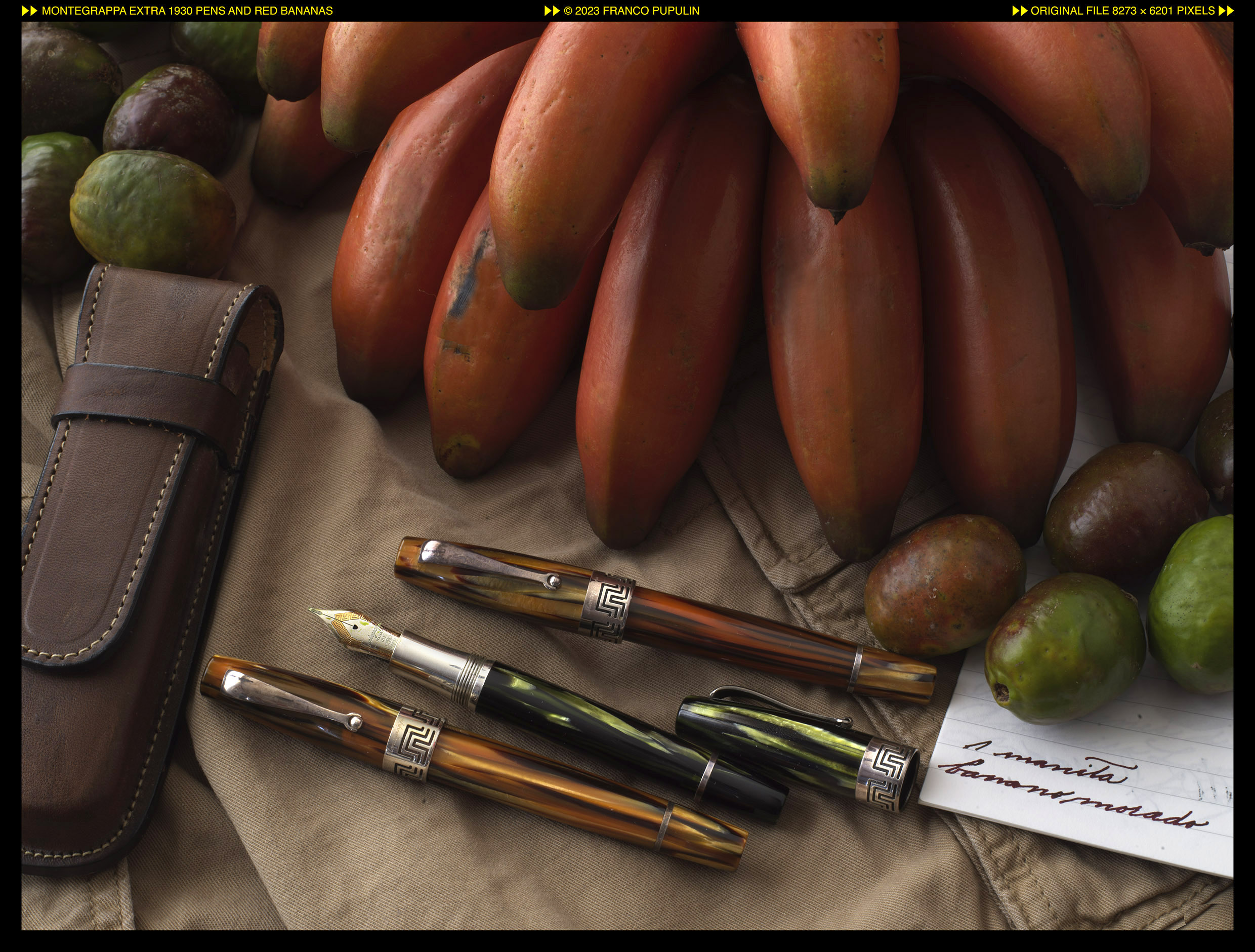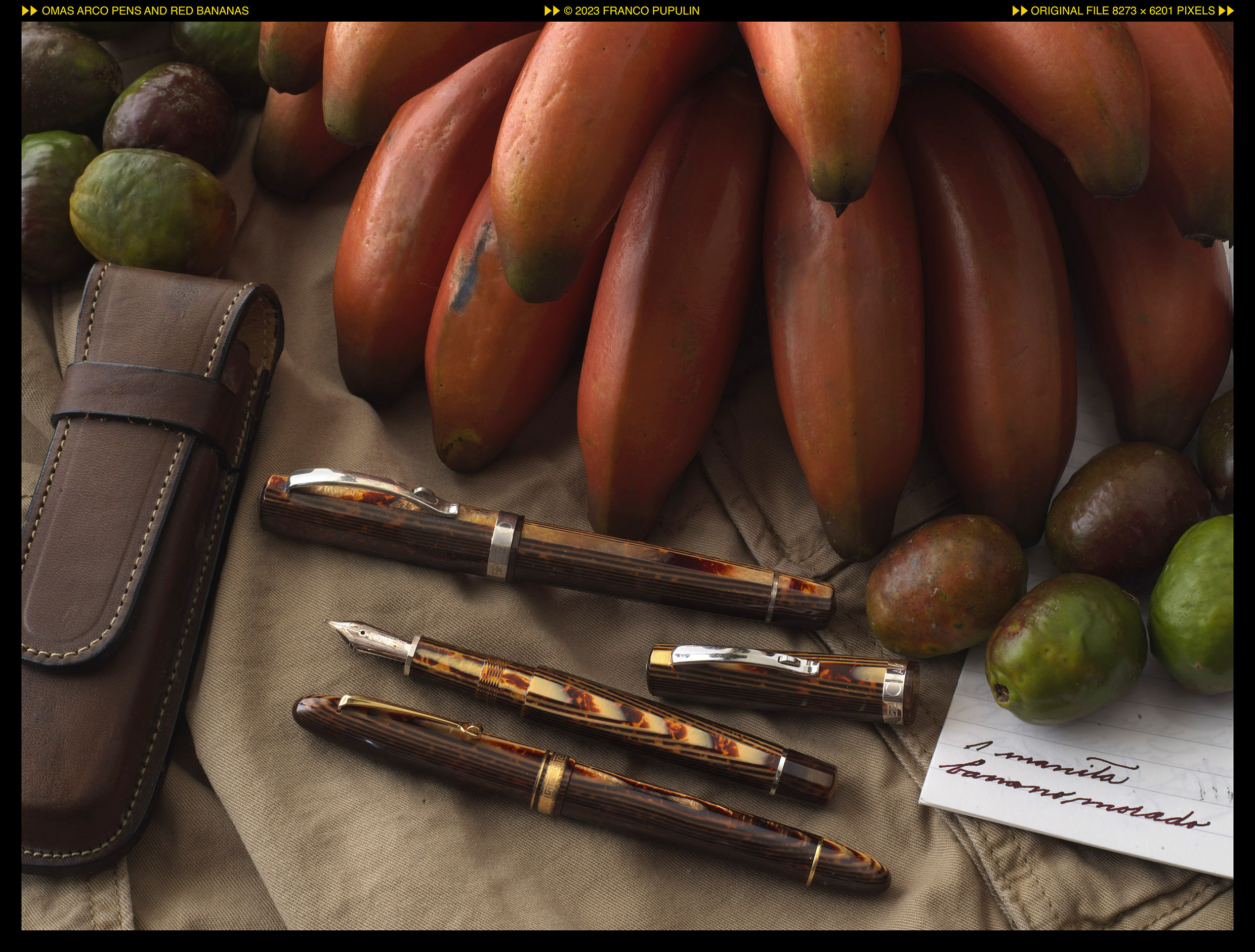 Domenica, al mercato della frutta e verdura vicino a casa, ho acquistato una “mano” di banano morado e mi é venuta voglia di farvi vedere questi frutti esotici, insieme ad alcune delle mie penne preferite. Per questo ho allestito un piccolo set e ho fotografato le banane rosse insieme alla Hemingway, a tre delle mie Montegrappa Extra 1930 e altre tre Omas, tutte in celluloide Arco. Giochi di una domenica tropicale…