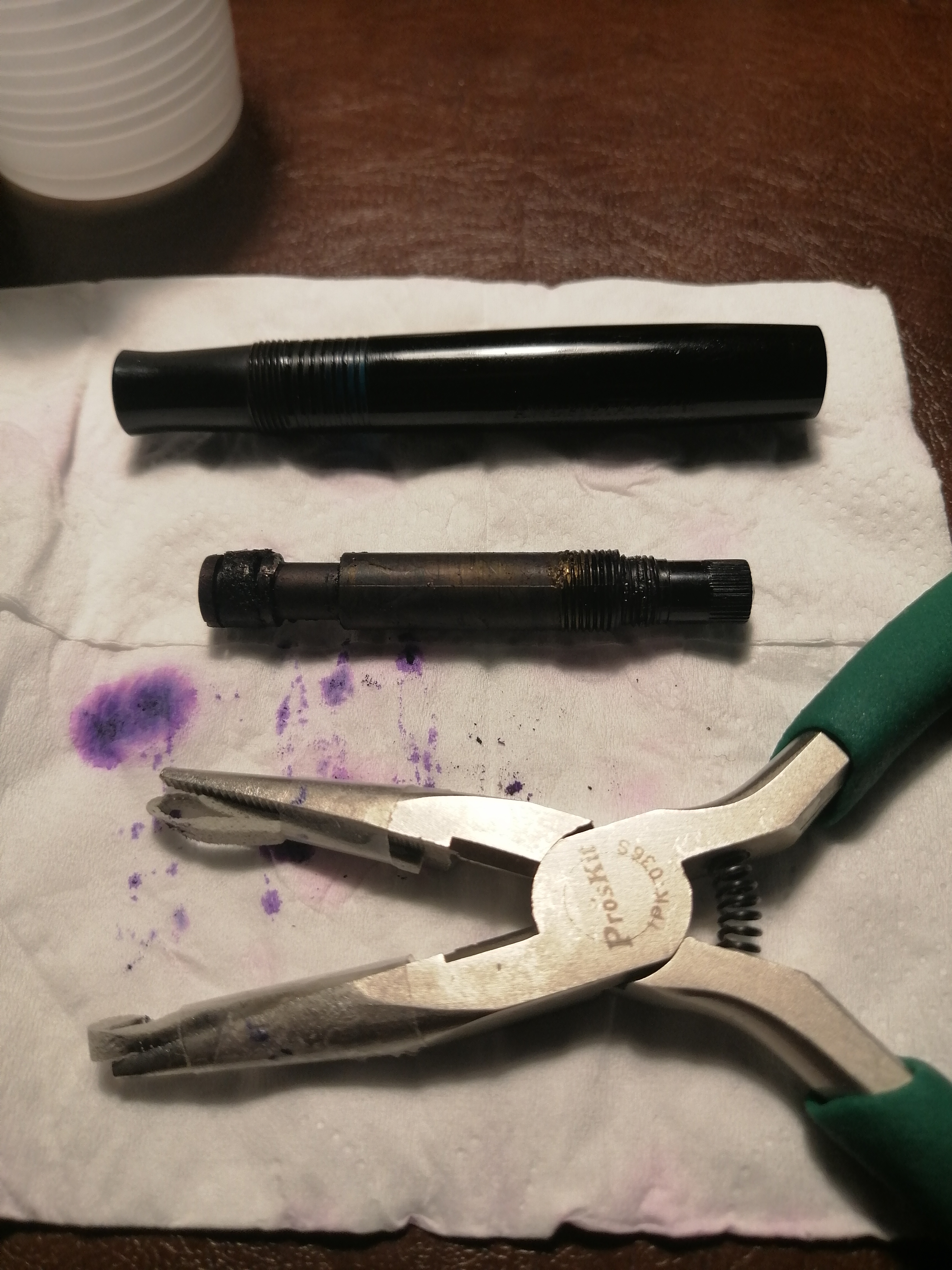 Buonasera cari amici delle stilografiche. Piccolo aggiornamento sullo smontaggio della mia bella Osmia: finalmente sono riuscito a svitare il gruppo pistone per sostituire la guarnizione! Fortunatamente non è servito nemmeno riscaldare la penna o tenerla a bagno in acqua e sapone. Vi allego qualche foto.