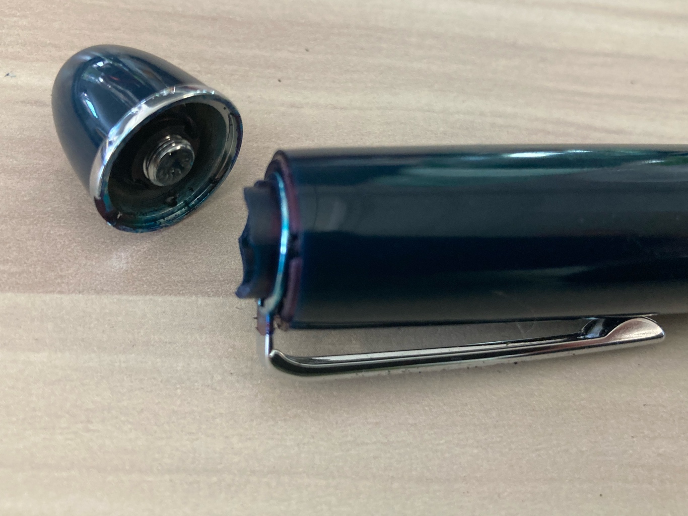 Mi unisco allo stress test, solo che non l’ho stressata tantissimo, sempre tenuta in un portapenne di tessuto della Pilot insieme ad altre penne che porto con me al lavoro nello zaino. Dopo 50 giorni l’ho trovata così. Sempre il cappuccio. Peccato perchè è una penna che scrive bene, ne ho prese due, di gradazione F ed EF e mi piacciono molto entrambe.