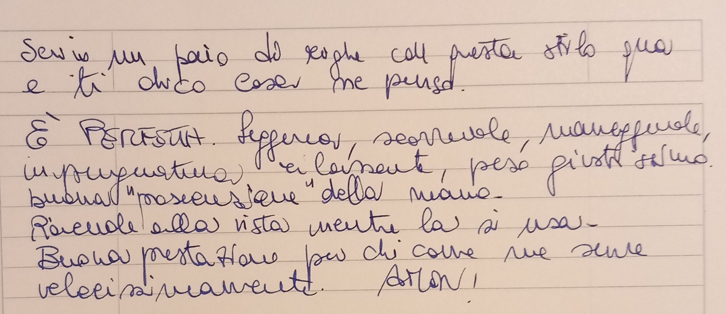 Aggiungo, per maggior completezza, il parere di mia moglie, che l'ha utilizzata per la prima volta due minuti fa. Parere espresso senza che le rivelassi il mio.