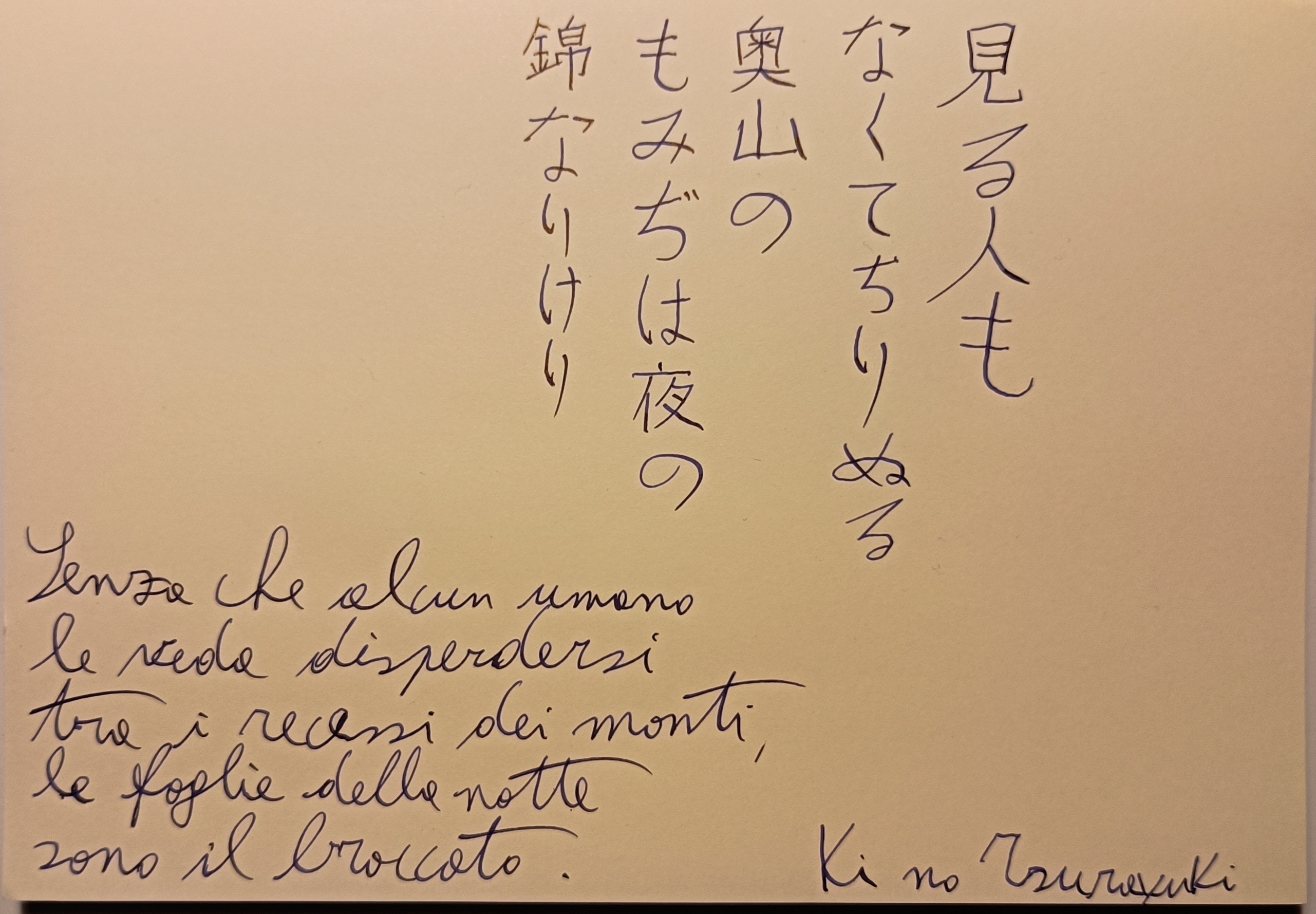 Dato che siamo in autunno, ho scelto un waka di Ki no Tsurayuki che paragona le foglie rosse al broccato (testo originale e traduzione ricopiati dalla "Antologia della poesia giapponese", vol. I, a cura di E. Gerlini). ERRATA CORRIGE: Nel quarto verso ho scritto "le foglie della notte" ma la traduzione degli autori della raccolta dà: "le foglie colorite della notte". il termine giapponese impiegato nella poesia, momiji, indica propriamente le foglie rosse tipiche dell'autunno.