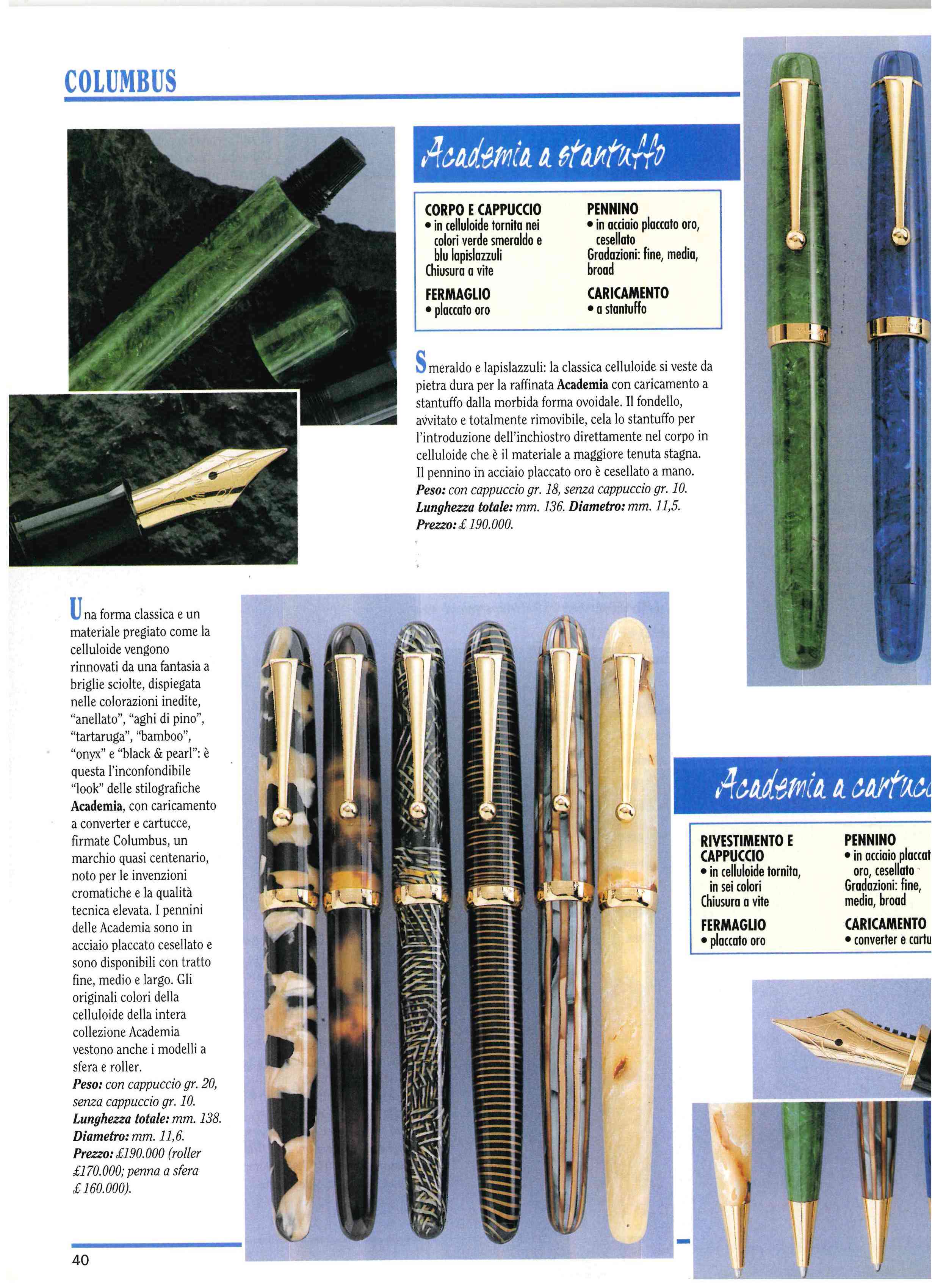 La linea "Accademia", in celluloide (celluloide secondo la pubblicità.... non ho approfondito se fosse in realtà acetato, ma le ho comprate tutte), venivano prodotte in verde ed in blu con caricamento a stantuffo, e in 5 varianti di colore molto belle con caricamento a cartuccia/converter.