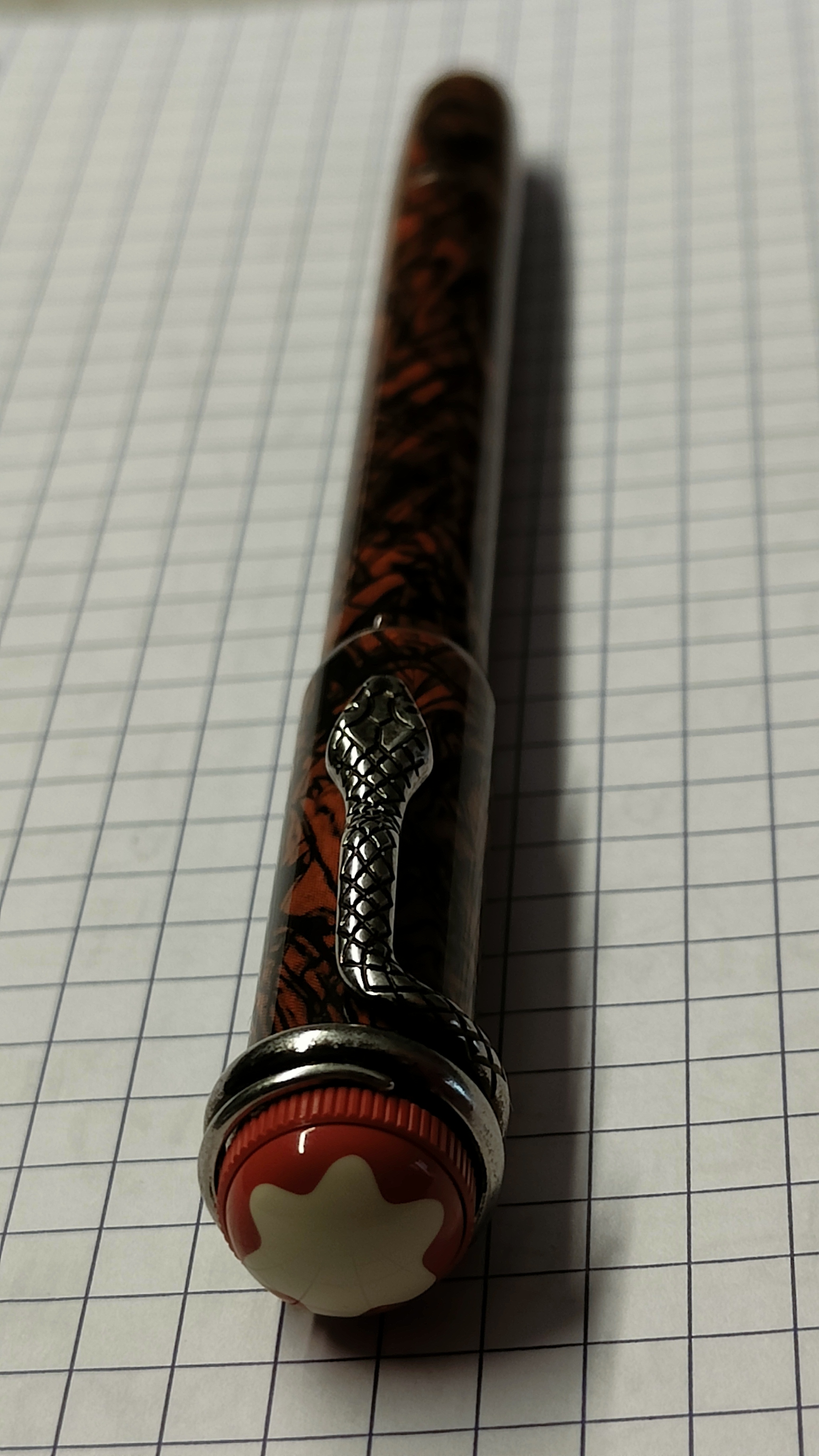 La penna si vede che è molto bella, devo però dire che, e questo è un parere strettamente personale dato che invece questa penna riscuote molto successo, a me questa cosa del serpente mi inibisce... per il resto, si vede bene che è una gran penna e un oggetto desiderabile.