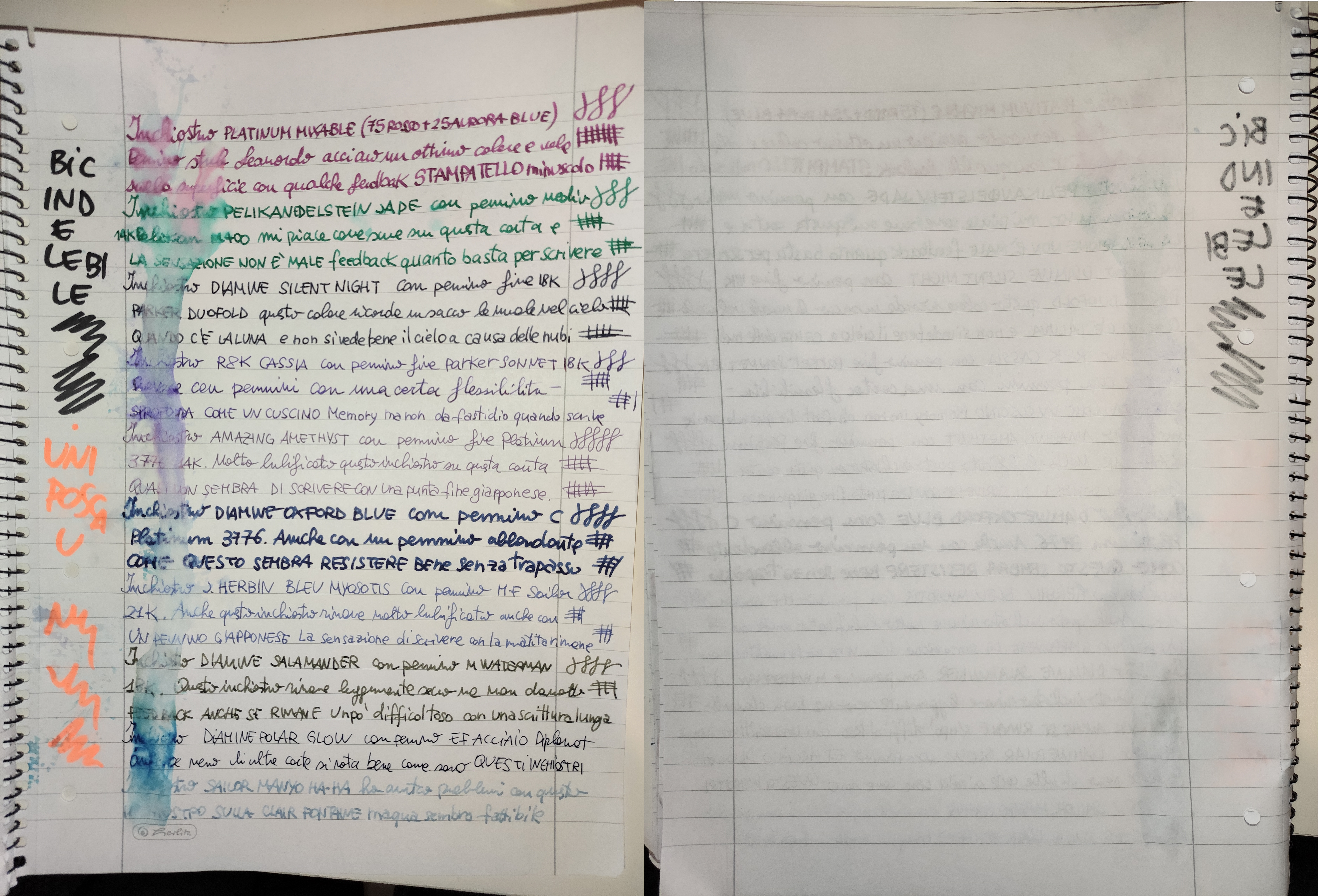 La carta è molto più assorbente della famosa carta clairefontaine e tende ad allargare leggermente il tratto se comparato. Marcatori o pennarelli di grosse taglie potrebbero trapassare leggermente ( vedi foto ).