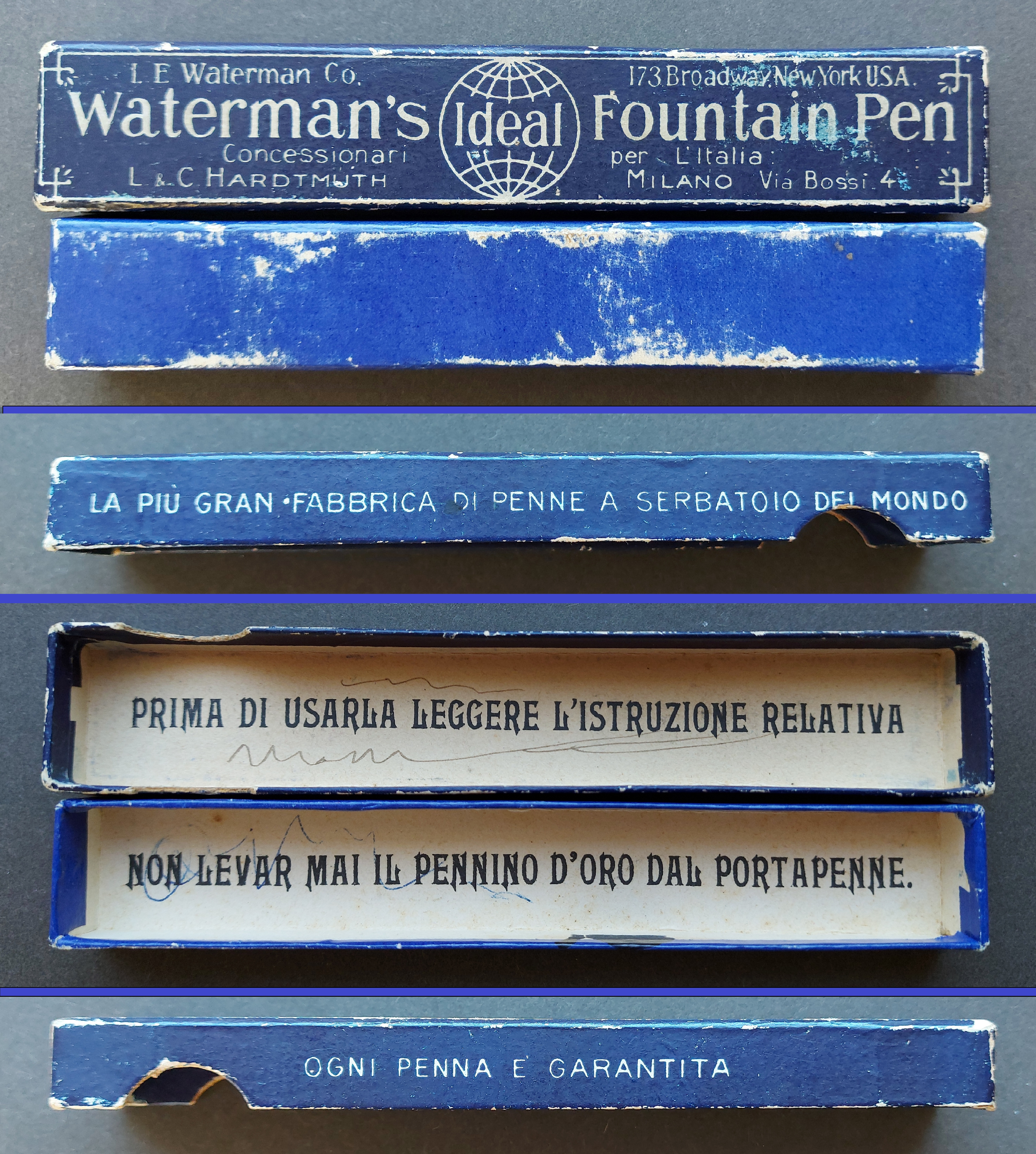 Se il limite "inferiore" per la datazione della penna è il 1903, anno dell'ultimo brevetto riportato, tuttavia non abbiamo pubblicità anteriori al 1905 in Italia: la prima è un mio ritrovamento del Febbraio 1905, dove compaiono per la prima volta Waterman e la Ditta L.&C. Hardtmuth, uno dei principali produttori mondiali di matite, leader di mercato con la celebre Koh-I-Noor, che disponeva di fabbriche, depositi e canali di distribuzione in molti Paesi nel mondo.