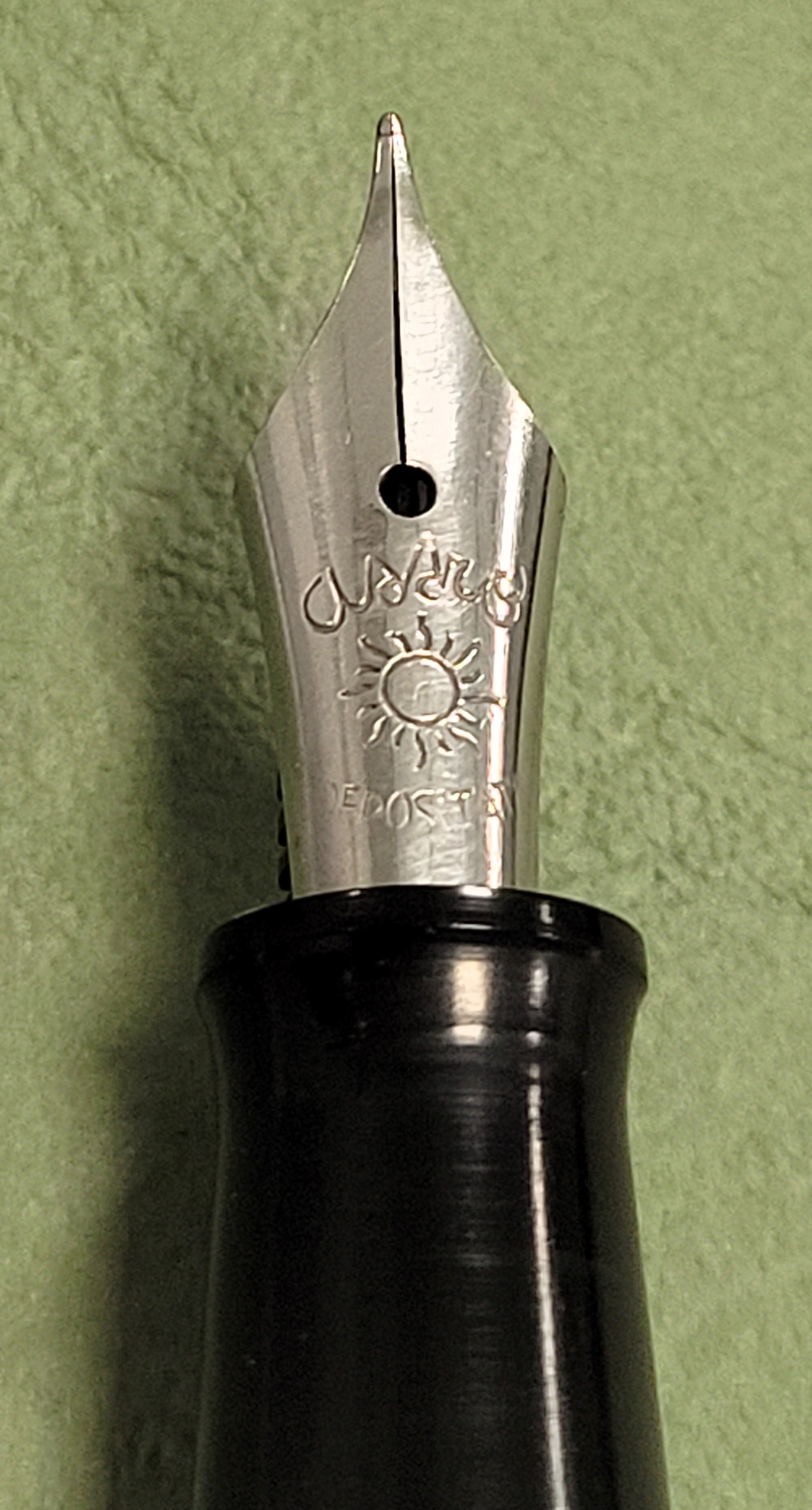 Il marchio del pennino a me sembra, in un corsivo non molto leggibile, "astro", che è un marchio che ho già visto più volte su pennini che però sono assai più brutti di questo (e che mi pare avere una punta in iridio, e non le classiche punte ripiegate). Era una marca di pennini generici, quindi ci sta che sia un sostituto.
