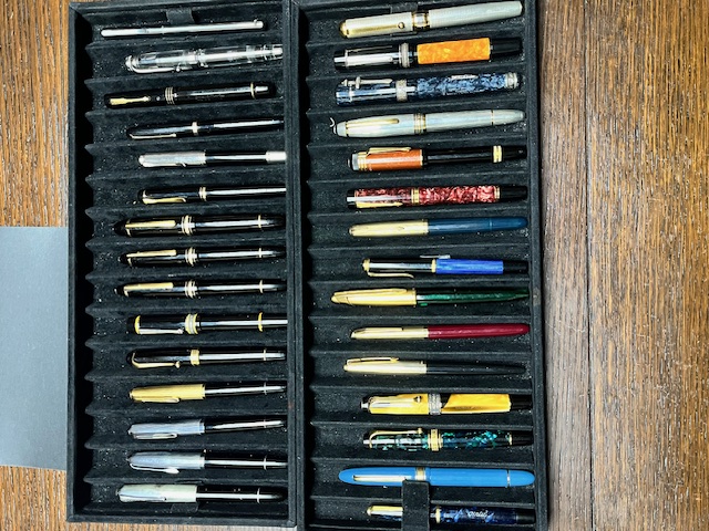 Io ho solo una trentina di penne, di cui tredici nere (anche con cappuccio dorato o argentato) e le altre colorate, ma nessuna con colorazioni sgargianti. Anzichè dilungarmi in descrizioni allego una foto, la ritengo molto più eloquente