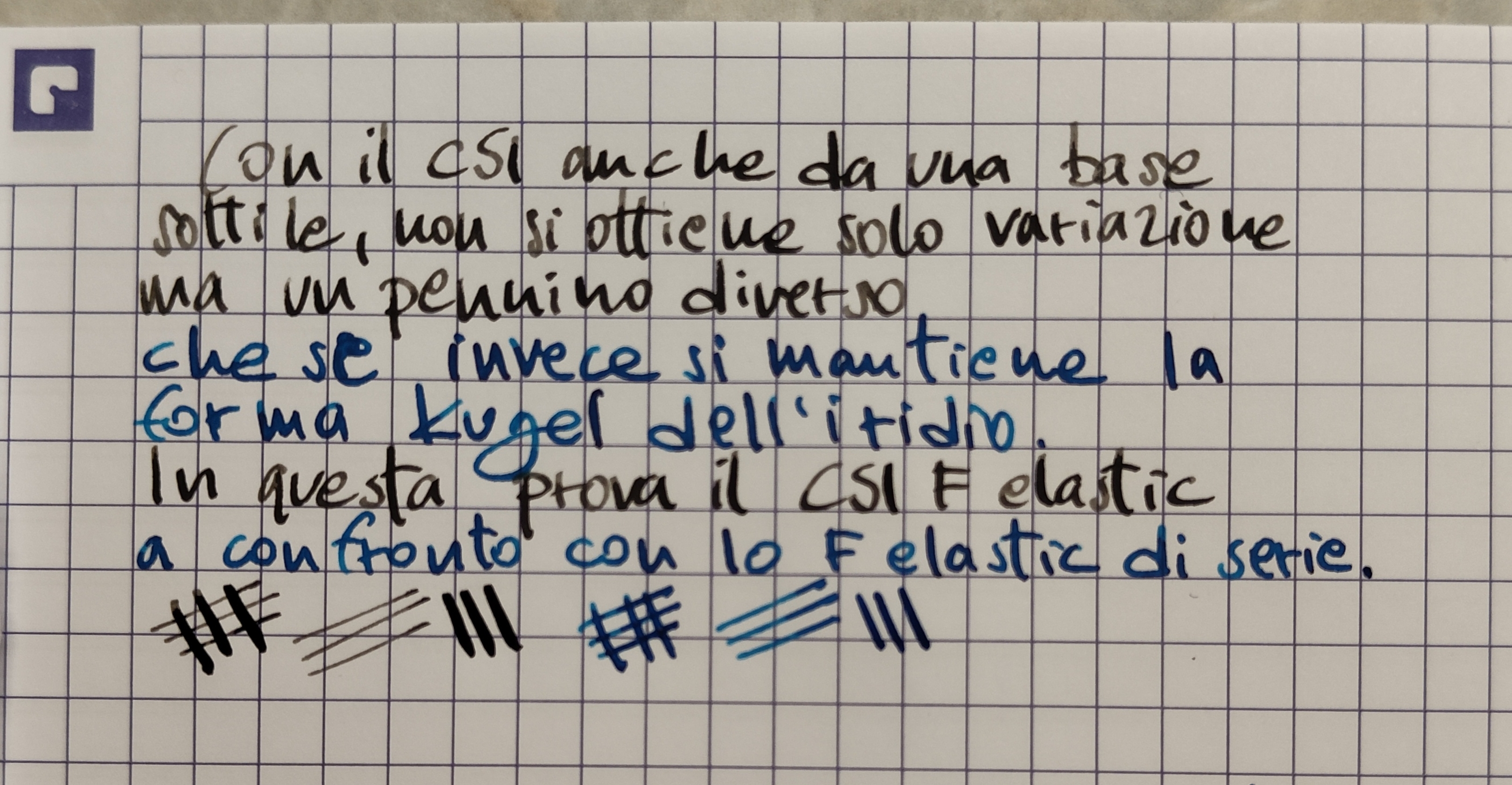 Il pennino CSI elastico l'ho visto la prima volta sul forum e mi ha incuriosito. Partendo da un Jowo elastco 14 kt taglia fine hanno realizzato un pennino differente e piacevole da utilizzare, anche per sessioni di scrittura non brevi. Lo sto utilizzando più di quello che mi sarei aspettato.