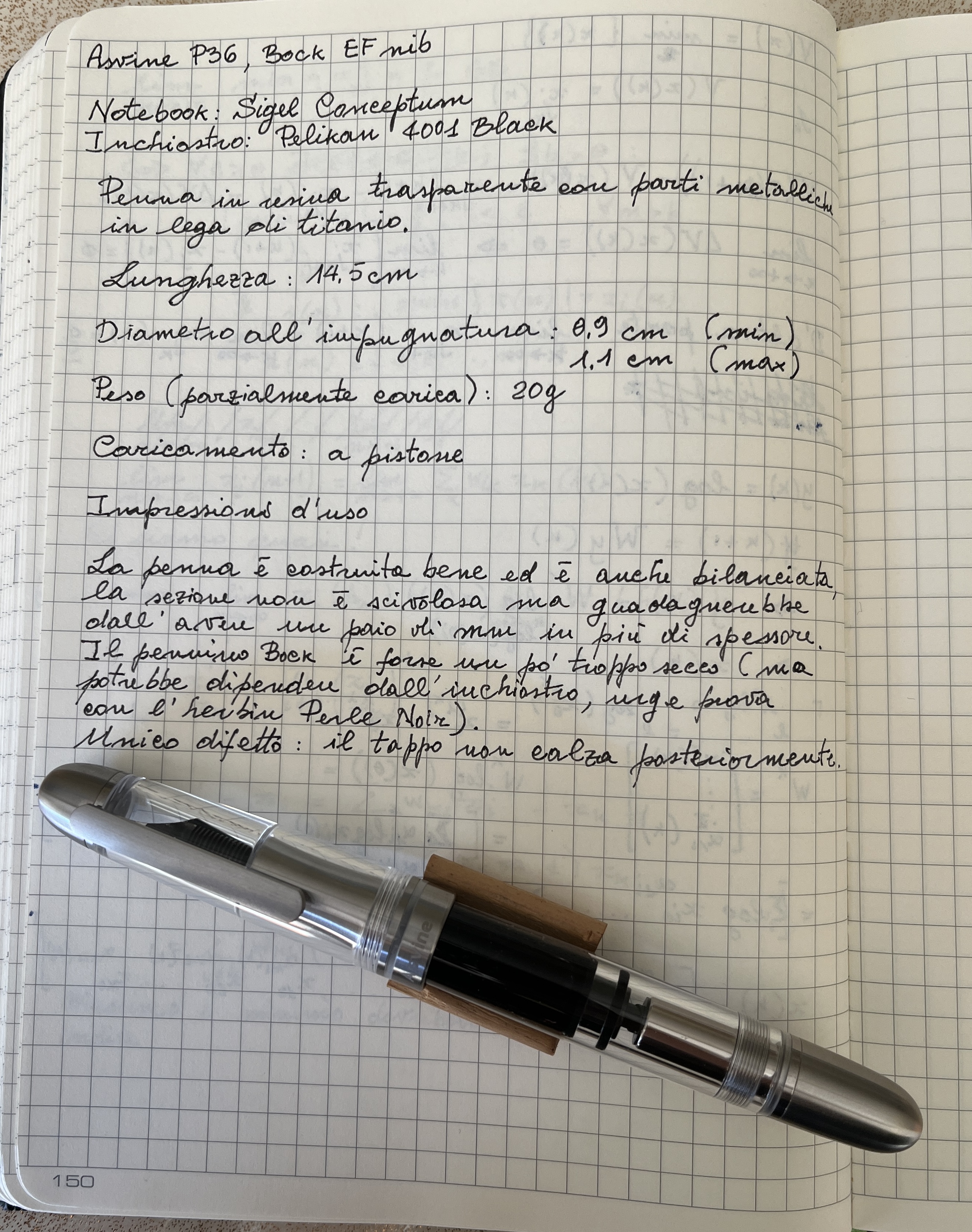 P.S.: Stesse identiche operazioni, dopo aver provato diversi inchiostri, ho effettuato su una Platinum 3776, notoriamente avara di flusso e che ha un conduttore molto simile al Bock #6; risultato analogo alla Asvine .