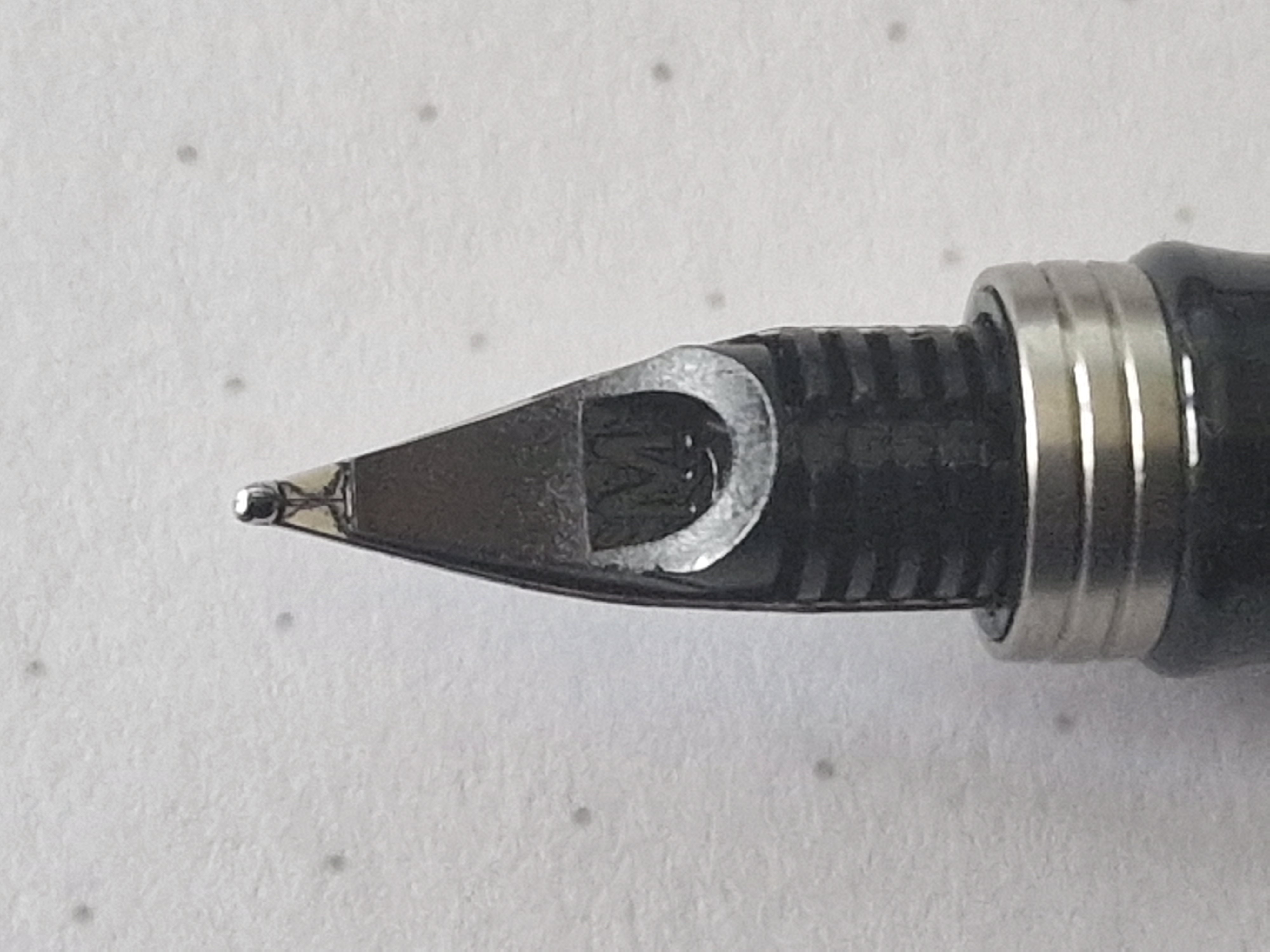 Le foto non sono proprio dell'angolazione giusta per poter valutare al meglio, ma non mi sembra ci sia un disallineamento e il pennino è montato correttamente sull'alimentatore.