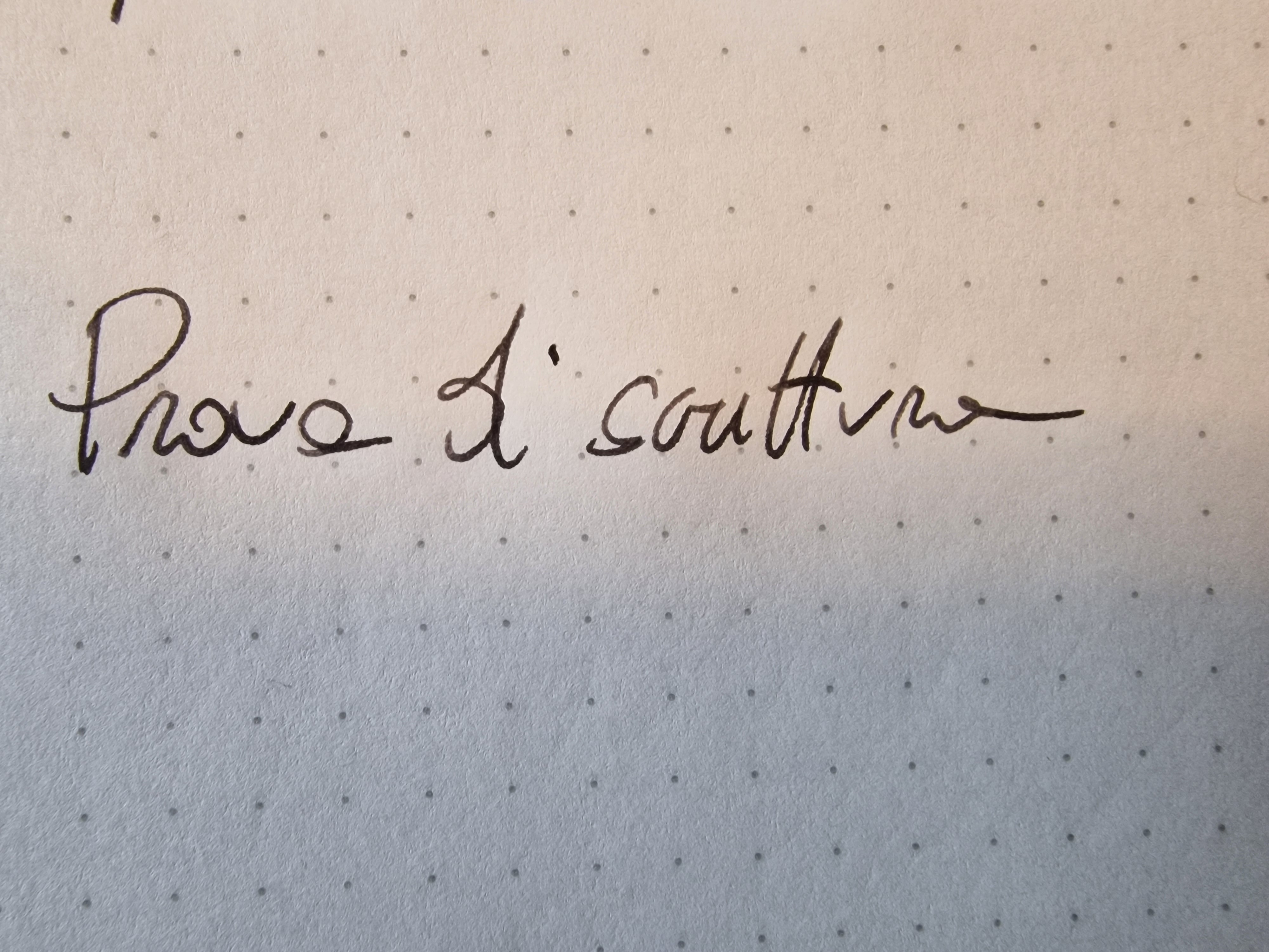 Allora stamani ho ricaricato la penna con l'inchiostro Pelikan 4001 nero, non ho il bel e il problema rimane, come vedete anche una singola lettere la scrive metà in grigio e metà in nero, è come se in una direzione uscisse meno inchiostro che nell'altra.