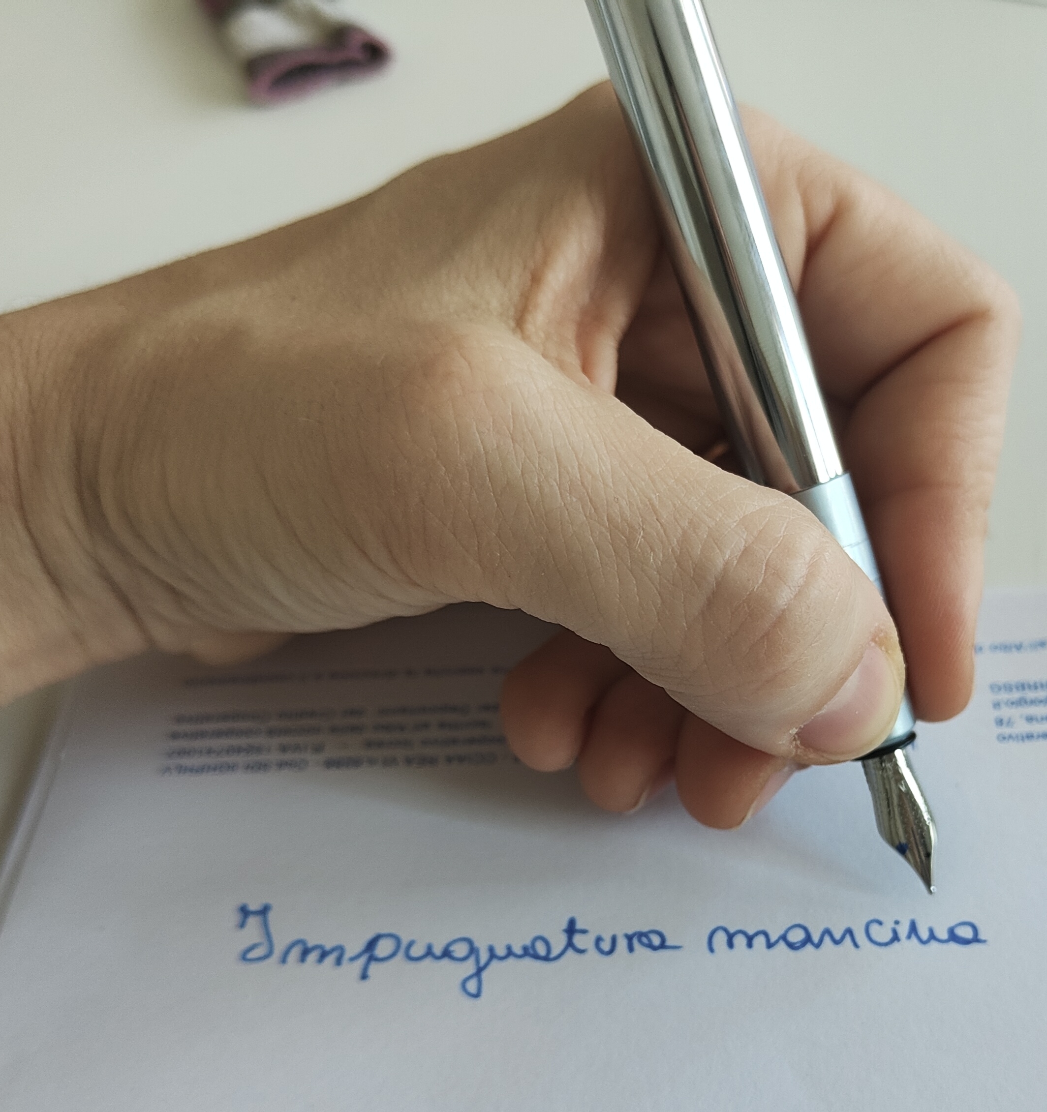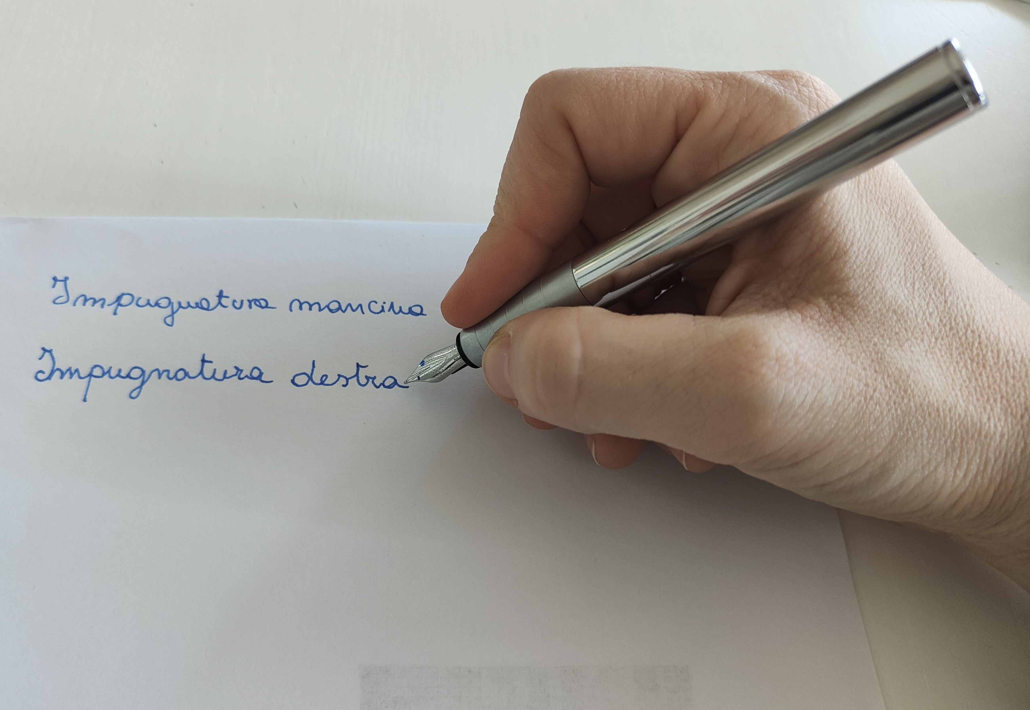 La penna, tenuta ruotata di 90° sul rebbio sinistro, può continuare a scrivere solo ed esclusivamente grazie all’impugnatura “à la Bic“, molto alta, praticamente verticale sul foglio.