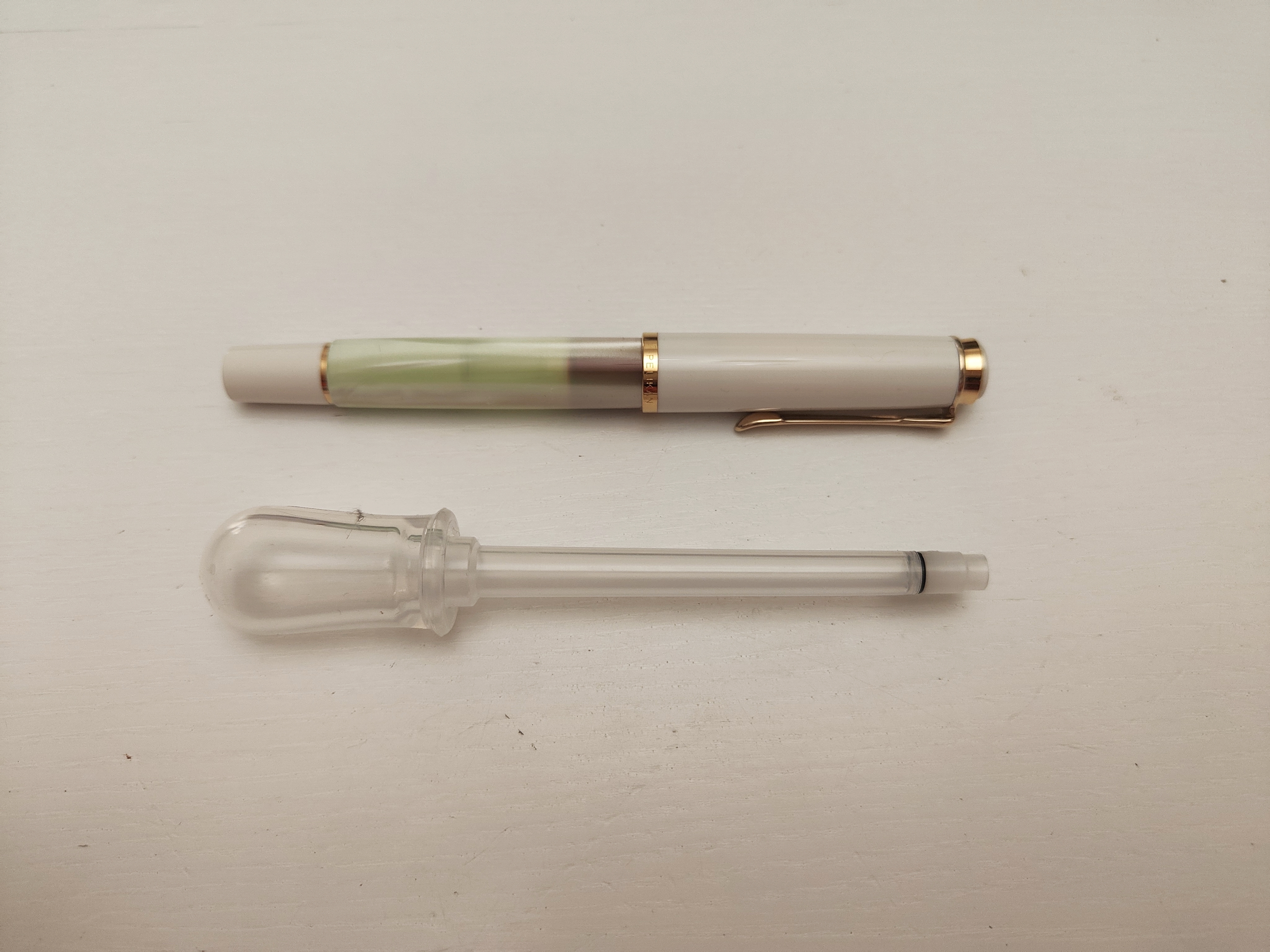 Io trovo più comoda una peretta per bambini che si compra in farmacia. Ha un volume maggiore e si traffica di meno. La uso da sempre con ottima pulizia dei pennini con converter. Inoltre sulla punta si può installare qualsiasi tipo di caruccio tagliata ad hoc.
