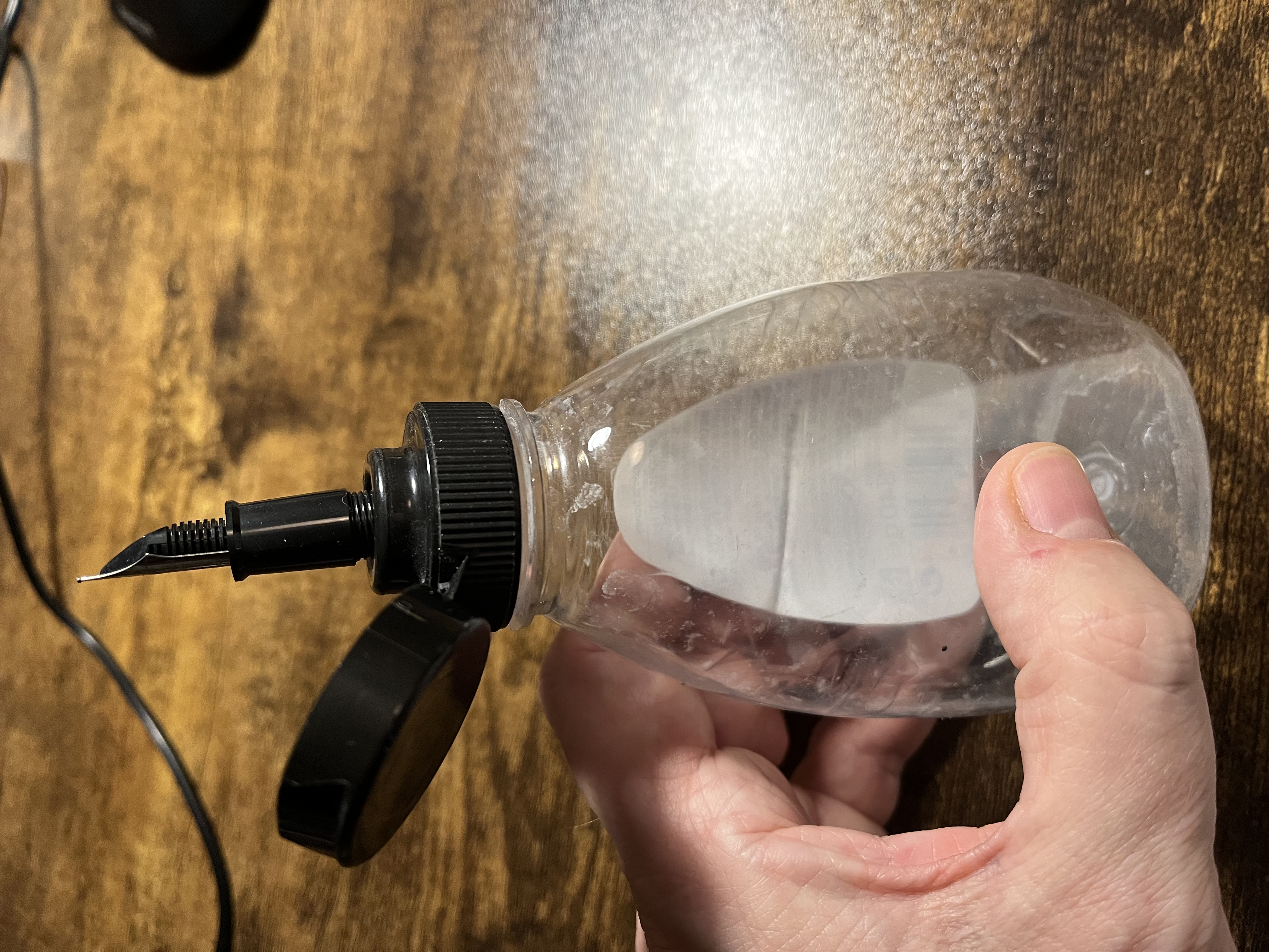 io uso questo contenitore, infilo l'impugnatura nel foro siliconico, trattenendo l'impugnatura premo sui fianchi della bottiglia più o meno forte a seconda di come voglio lavare il gruppo pennino. Senza pare, capacità limitata o altro. E sopratutto, non compro dai cinesi che mi stanno sugli zebedei.