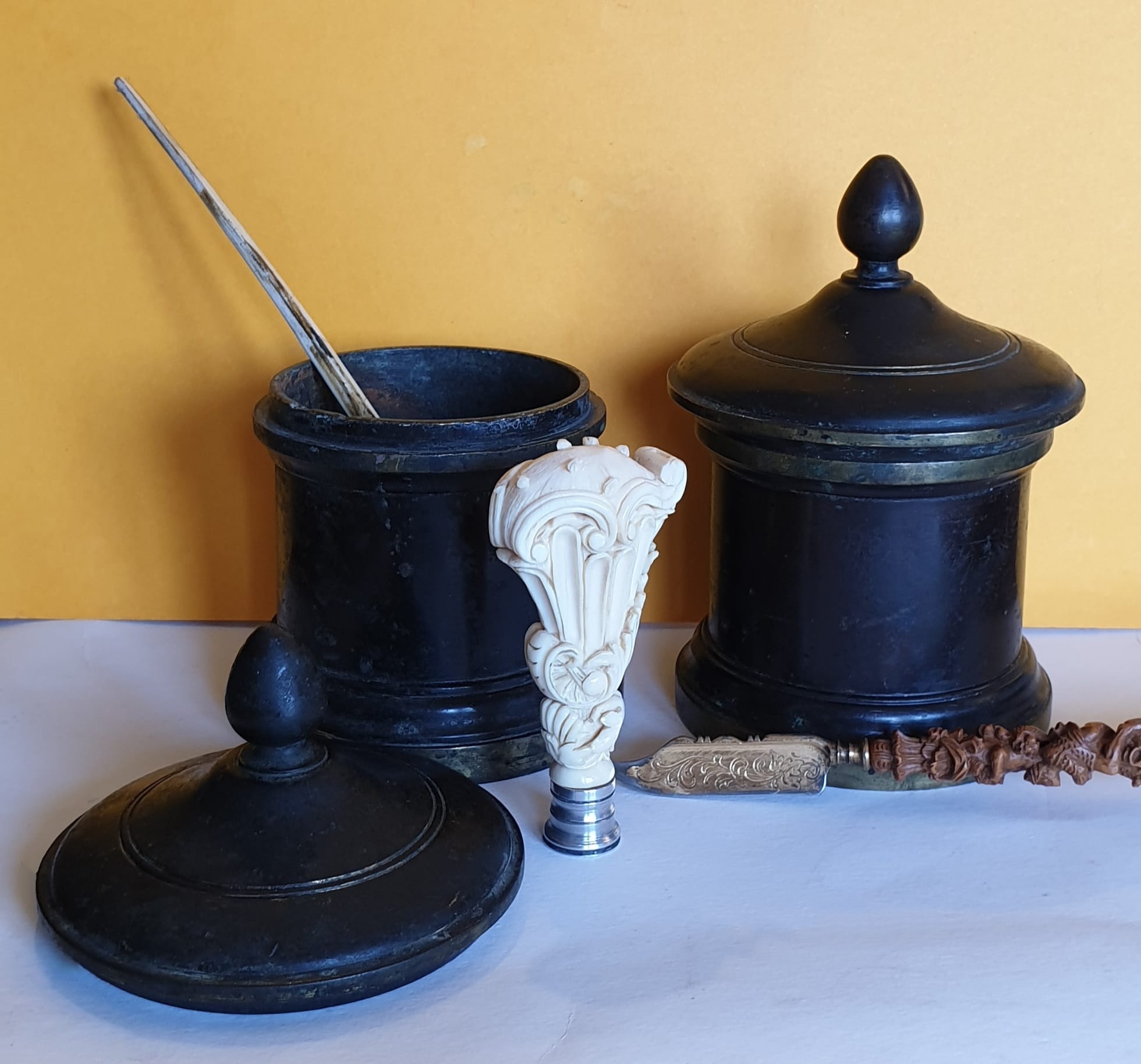 Rara copia di calamai in bronzo e cristallo molato, di difficile datazione per me (immagini simili ho visto in tele cinque/seicentesche. Grato per eventuali informazioni più precise). Kg 2,2 x cm 14,5 di altezza, da base a tutta noce.