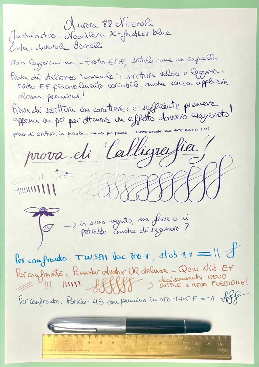 Il tratto di partenza, senza alcuna pressione, è sottilissimo e il flusso straordinariamente misurato. Un inchiostro magro come il Pelikan 4001 blue-black fatica un po' a uscire; ma basta usarne uno mediamente fluido (come il bellissimo e supersaturo Noodler's X-Feather blue a cui l'ho abbinata), per ottenere un EEF capace di far arrossire i giapponesi - dico per dire, non avendone mai provato uno; ma vi assicuro che si può scrivere un corpo alto 2mm perfettamente leggibile, senza nemmeno sforzarsi troppo e senza mai perdere un tratto.