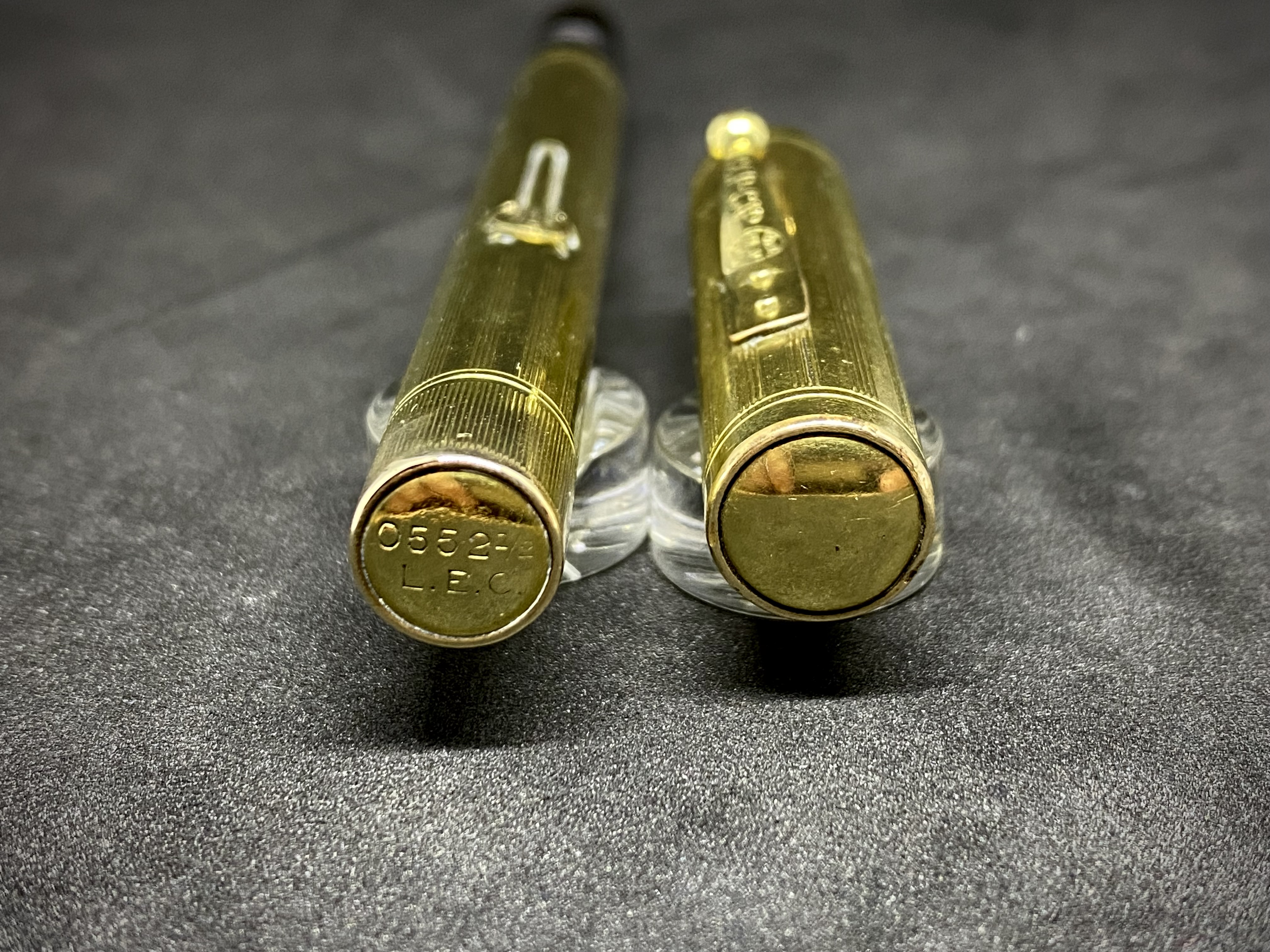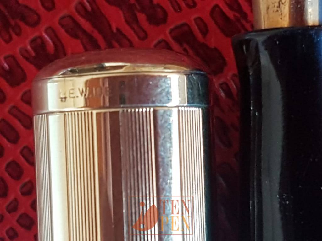 Quindi una penna laminata in oro 14K con caricamento a levetta e pennino nr. 2. Il suffisso ½ identifica una penna slender, mentre L.E.C. (Low End Covered) significa che la penna ha la parte inferiore del fusto interamente ricoperto dalla laminatura.