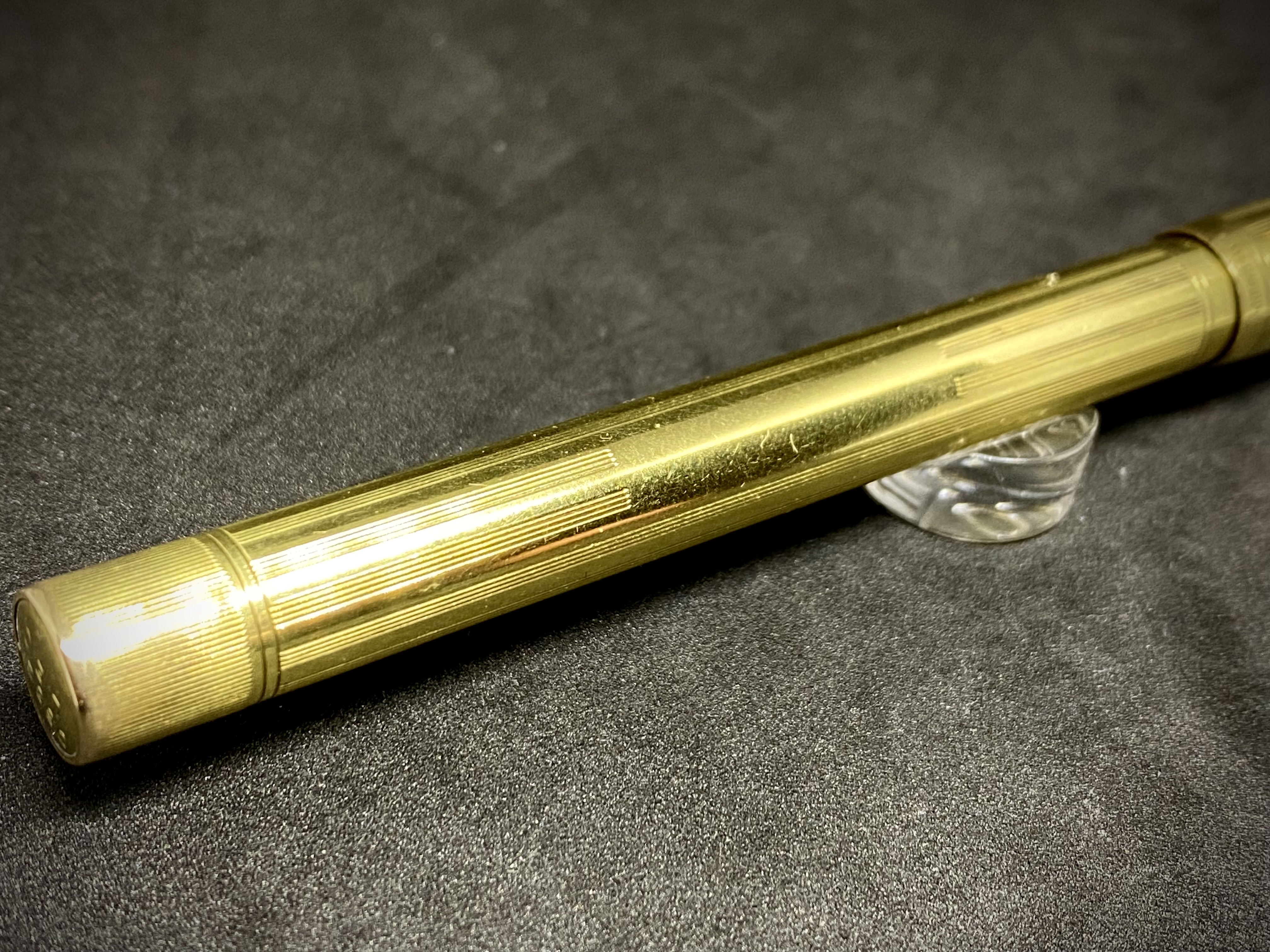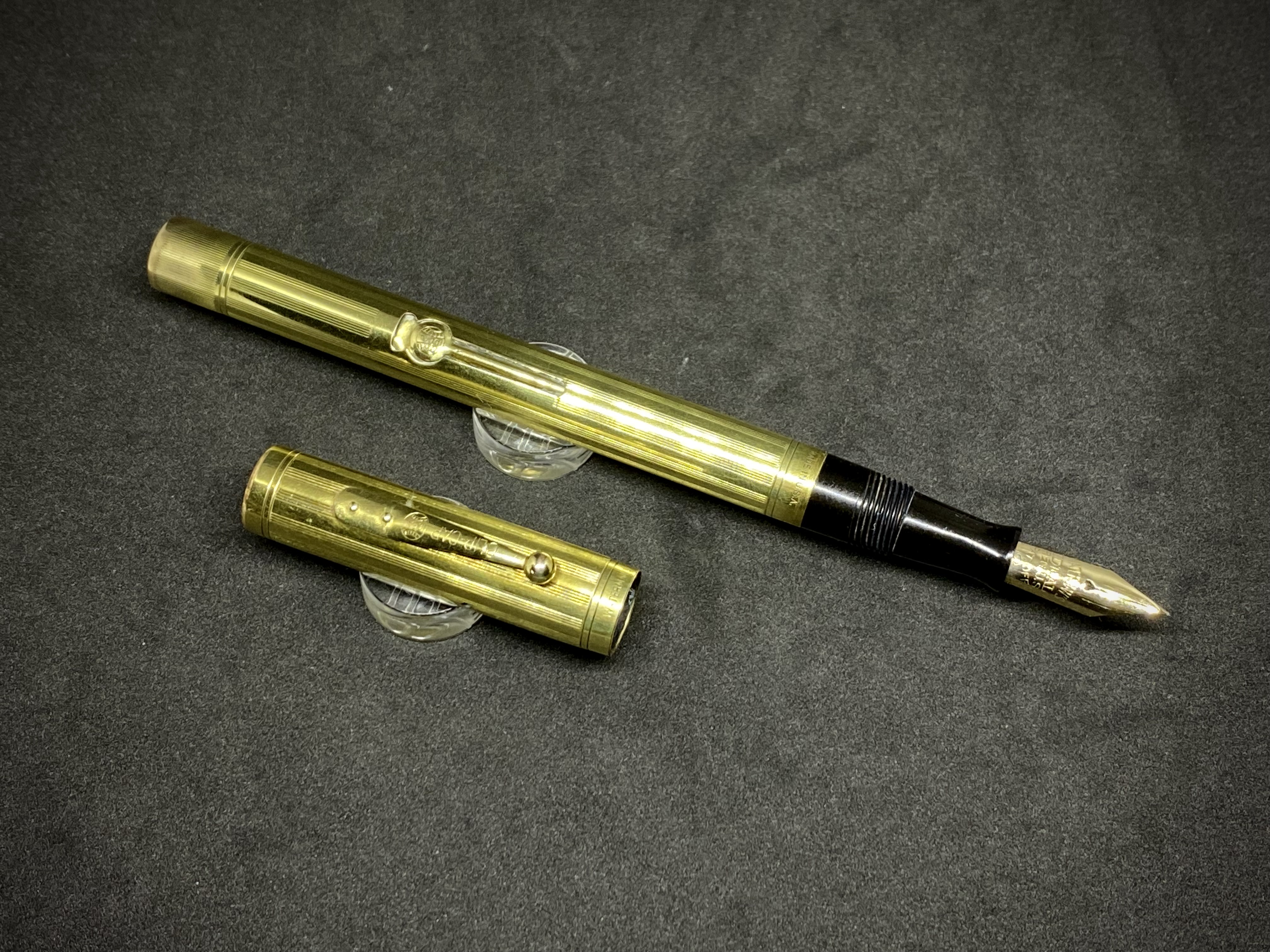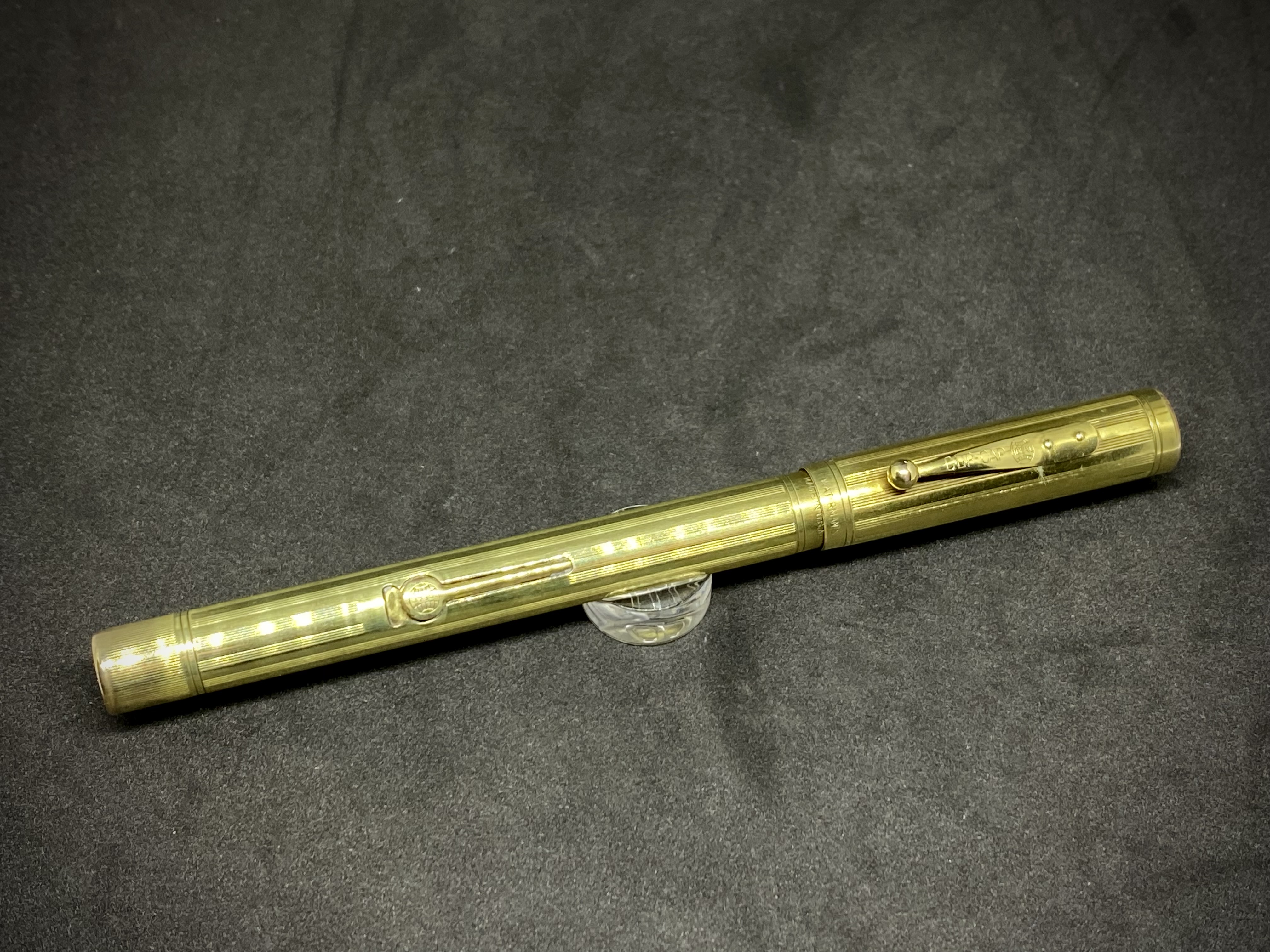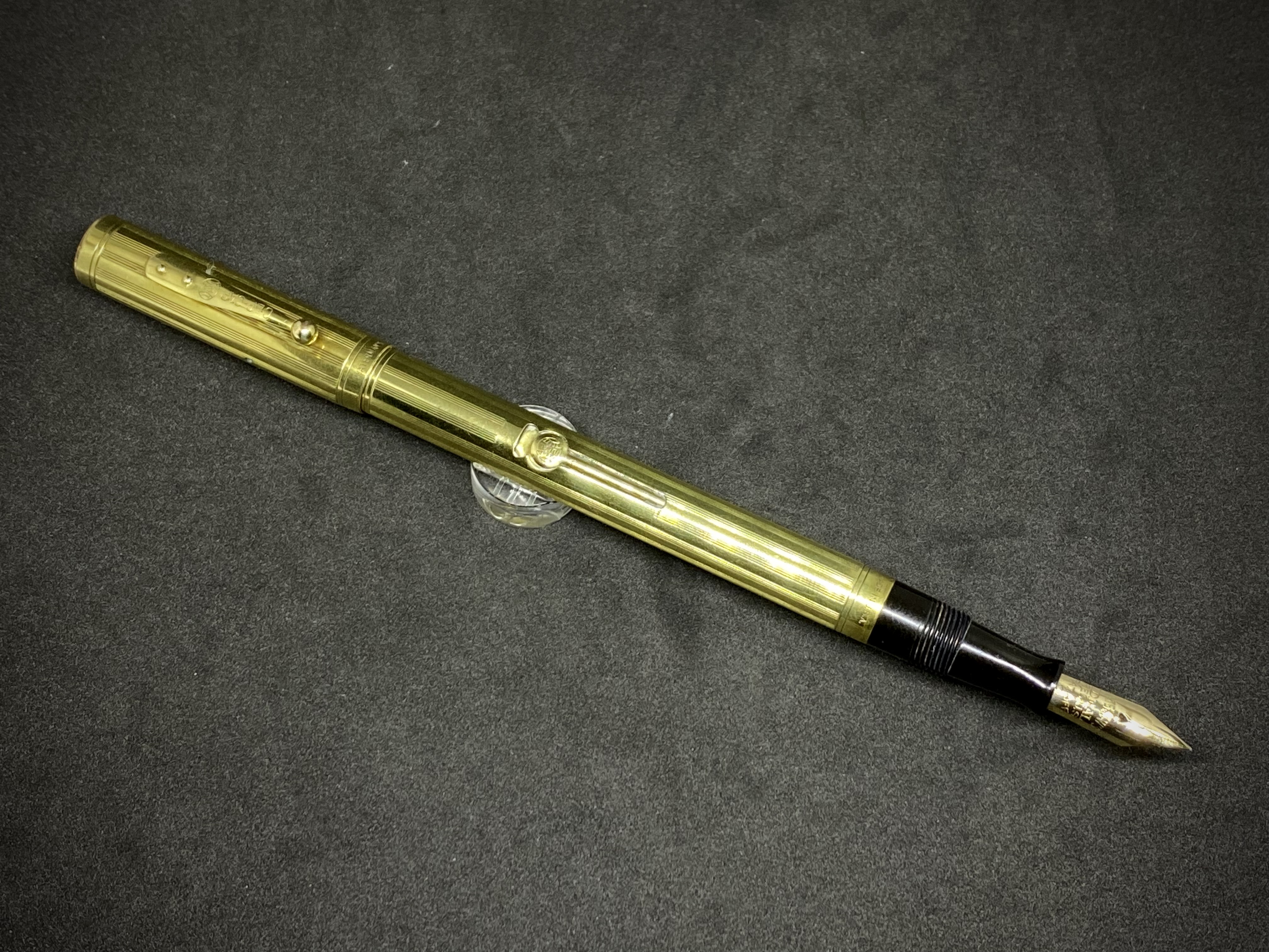 Quindi una penna laminata in oro 14K con caricamento a levetta e pennino nr. 2. Il suffisso ½ identifica una penna slender, mentre L.E.C. (Low End Covered) significa che la penna ha la parte inferiore del fusto interamente ricoperto dalla laminatura. Eccola in tutto il suo splendore in una delle più eleganti lavorazioni, nota come Sheraton: