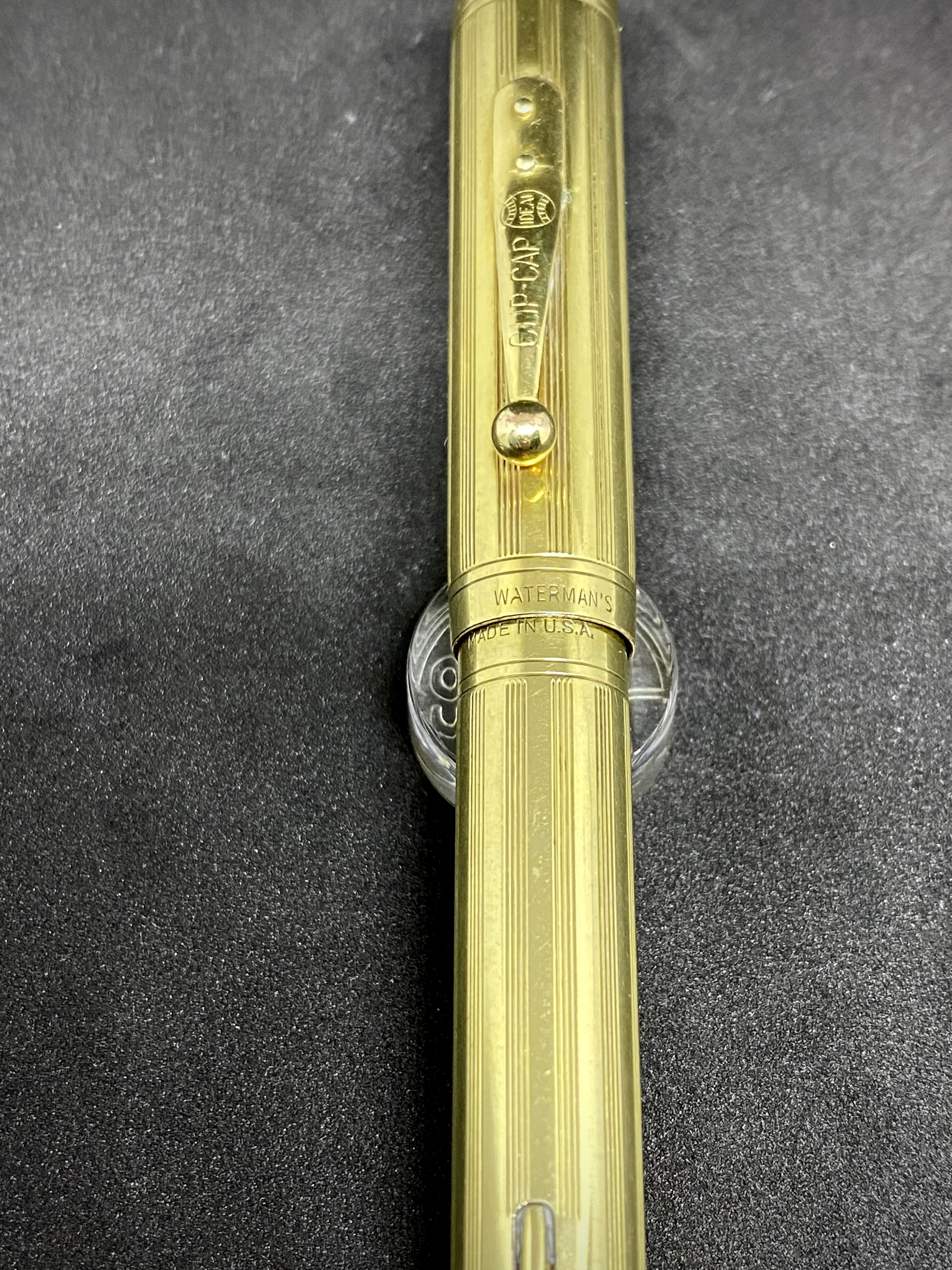 Sul cappuccio che si rimuove in un giro esatto, vi troviamo la classica Clip Cap e, sul labbro, l’incisione Waterman. La filettatura a 4 principi, consente sempre un rapido avvitamento del cappuccio e, con uno dei quatto inviti, consente di allineare il cappuccio alla levetta di ricarica. In tale posizione, peraltro, l’incisione Waterman's del cappuccio viene a trovarsi esattamente sull’incisione posta sul labbro della laminatura del fusto "Made in USA", formando un tutt’uno “Waterman's – Made in USA”